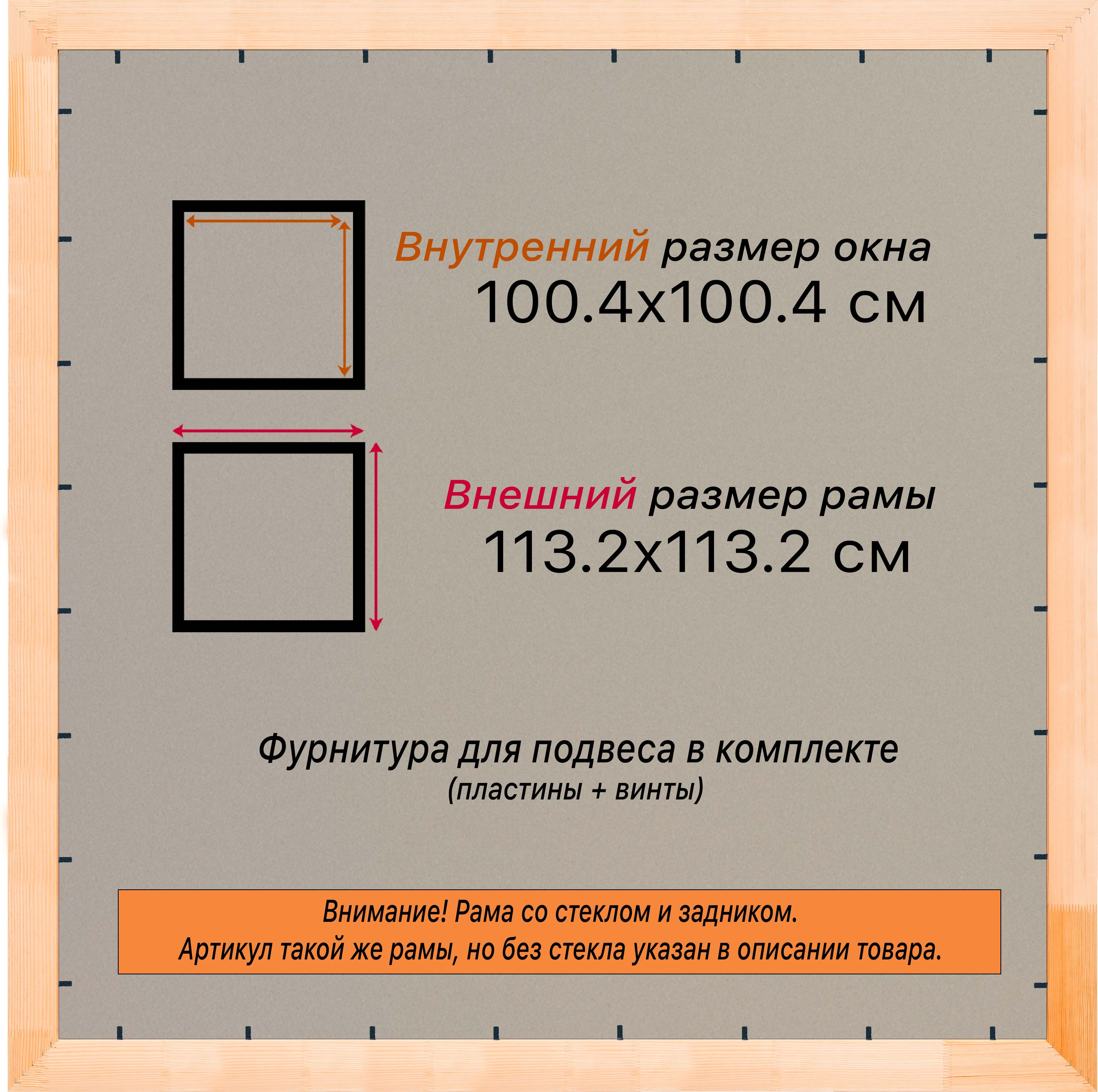 Рама изготовлена из древесины сосны 1 сорта. Подобный неокрашенный багет отлично подойдет для многих современных работ в разных стилях и жанрах. Но главная особенность данного багета в том, что его можно декорировать используя различные краски и лаки, такая рама будет в единственном экземпляре и уже являться эксклюзивным авторским творением. Рама выполнена из дерева (сосна), профиль шлифованный, неокрашенный. Указан внутренний размер окна рамы мм. (запас 2 мм с каждой стороны чтобы ваше изделие свободно поместилось). 1. Основные характеристики: - Размеры рамки: 100x100 (по размеру помещаемого изображения) - Габариты изделия: 114.6x114.6 см. - Цвет: не указан - Профиль: не указан - Сечение рамы: 71x28 мм - Ширина четверти: мм - Высота четверти: мм 2. Комплектация: - Стекло 2мм (обычное) - Задник - Подвесная пластина – 2 шт. - Винты - Прижимы для фиксации задника 3. Назначение: - Подходит для оформления: • Картин, включая картины по номерам • Алмазных мозаик и вышивок крестом • Постеров, фотографий, икон • Паспарту, зеркал • Вышивки бисером и алмазной мозаики • Медалей, орденов, спортивных наград • Старинных часов, ключей, монет или украшений - Используется как настенная или настольная фоторамка (нет подставки) 4. Преимущества: - Универсальность: квадратные и прямоугольные форматы, размеры от 10х10 до 100х100 см - Удобство: можно повесить горизонтально или вертикально - Широкий выбор: разные профили, расцветки, с опцией со стеклом или без - Идеальный подарок: для мамы, папы, бабушки, дедушки, друзей, коллег на день рождения, Новый год, 8 марта, 23 февраля, свадьбу, новоселье или любой другой праздник 5. Применение в интерьере: - Украшение дома: подходит для изображений цветов, живописи, портретов, натюрмортов, городских пейзажей, природы - Идеально для алмазной вышивки, мозаики, фотографий или постера 6. Производство: - Страна: Россия, Санкт-Петербург - Качество: высококачественные материалы с вниманием к деталям
