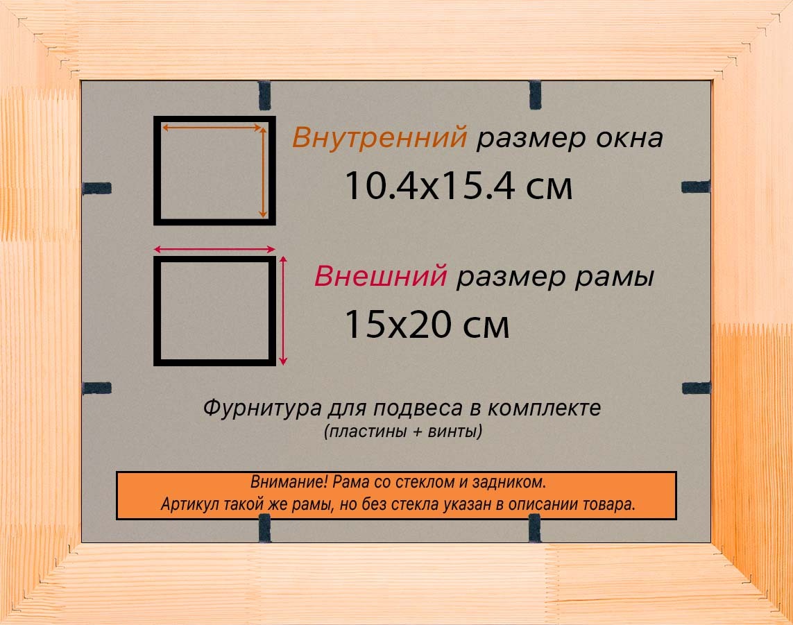 Рама изготовлена из древесины сосны 1 сорта. Подобный неокрашенный багет отлично подойдет для многих современных работ в разных стилях и жанрах. Но главная особенность данного багета в том, что его можно декорировать используя различные краски и лаки, такая рама будет в единственном экземпляре и уже являться эксклюзивным авторским творением. Рама выполнена из дерева (сосна), профиль шлифованный, неокрашенный. Указан внутренний размер окна рамы мм. (запас 2 мм с каждой стороны чтобы ваше изделие свободно поместилось). 1. Основные характеристики: - Размеры рамки: 10x15 (по размеру помещаемого изображения) - Габариты изделия: 16.4x21.4 см. - Цвет: не указан - Профиль: не указан - Сечение рамы: 30x16 мм - Ширина четверти: мм - Высота четверти: мм 2. Комплектация: - Стекло 2мм (обычное) - Задник - Подвесная пластина – 2 шт. - Винты - Прижимы для фиксации задника 3. Назначение: - Подходит для оформления: • Картин, включая картины по номерам • Алмазных мозаик и вышивок крестом • Постеров, фотографий, икон • Паспарту, зеркал • Вышивки бисером и алмазной мозаики • Медалей, орденов, спортивных наград • Старинных часов, ключей, монет или украшений - Используется как настенная или настольная фоторамка (нет подставки) 4. Преимущества: - Универсальность: квадратные и прямоугольные форматы, размеры от 10х10 до 100х100 см - Удобство: можно повесить горизонтально или вертикально - Широкий выбор: разные профили, расцветки, с опцией со стеклом или без - Идеальный подарок: для мамы, папы, бабушки, дедушки, друзей, коллег на день рождения, Новый год, 8 марта, 23 февраля, свадьбу, новоселье или любой другой праздник 5. Применение в интерьере: - Украшение дома: подходит для изображений цветов, живописи, портретов, натюрмортов, городских пейзажей, природы - Идеально для алмазной вышивки, мозаики, фотографий или постера 6. Производство: - Страна: Россия, Санкт-Петербург - Качество: высококачественные материалы с вниманием к деталям