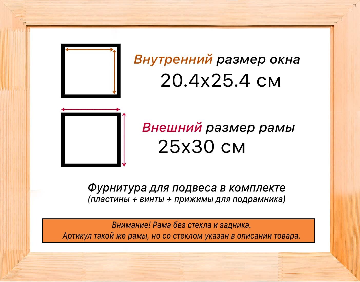 Рама изготовлена из древесины сосны 1 сорта. Подобный неокрашенный багет отлично подойдет для многих современных работ в разных стилях и жанрах. Но главная особенность данного багета в том, что его можно декорировать используя различные краски и лаки, такая рама будет в единственном экземпляре и уже являться эксклюзивным авторским творением. Рама выполнена из дерева (сосна), профиль шлифованный, неокрашенный. Указан внутренний размер окна рамы мм. (запас 2 мм с каждой стороны чтобы ваше изделие свободно поместилось). 1. Основные характеристики: - Размеры рамки: 20x25 (по размеру помещаемого изображения) - Габариты изделия: 26.4x31.4 см. - Цвет: не указан - Профиль: не указан - Сечение рамы: 30x16 мм - Ширина четверти: мм - Высота четверти: мм 2. Комплектация: - Подвесная пластина – 2 шт. - Прижимы для подрамника - Винты 3. Назначение: - Подходит для оформления: • Картин, включая картины по номерам • Алмазных мозаик и вышивок крестом • Постеров, фотографий, икон • Паспарту, зеркал • Вышивки бисером и алмазной мозаики • Медалей, орденов, спортивных наград • Старинных часов, ключей, монет или украшений - Используется как настенная или настольная фоторамка (нет подставки) 4. Преимущества: - Универсальность: квадратные и прямоугольные форматы, размеры от 10х10 до 100х100 см - Удобство: можно повесить горизонтально или вертикально - Широкий выбор: разные профили, расцветки, с опцией со стеклом или без - Идеальный подарок: для мамы, папы, бабушки, дедушки, друзей, коллег на день рождения, Новый год, 8 марта, 23 февраля, свадьбу, новоселье или любой другой праздник 5. Применение в интерьере: - Идеально для алмазной вышивки, мозаики, картин на подрамнике - Украшение дома: подходит для изображений цветов, живописи, портретов, натюрмортов, городских пейзажей, природы 6. Производство: - Страна: Россия, Санкт-Петербург - Качество: высококачественные материалы с вниманием к деталям