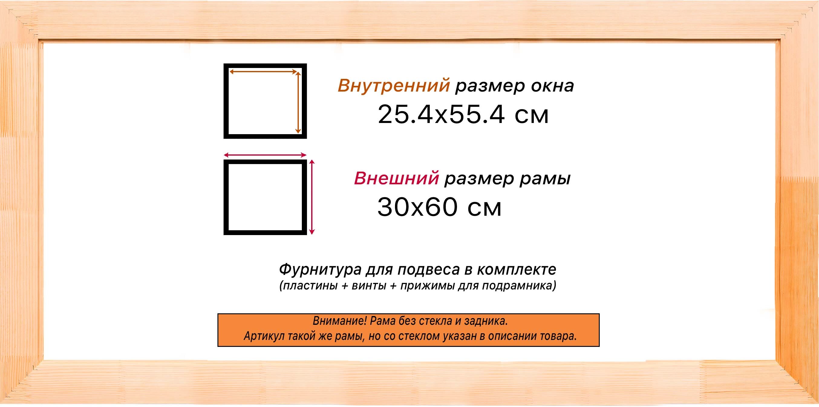 Рама изготовлена из древесины сосны 1 сорта. Подобный неокрашенный багет отлично подойдет для многих современных работ в разных стилях и жанрах. Но главная особенность данного багета в том, что его можно декорировать используя различные краски и лаки, такая рама будет в единственном экземпляре и уже являться эксклюзивным авторским творением. Рама выполнена из дерева (сосна), профиль шлифованный, неокрашенный. Указан внутренний размер окна рамы мм. (запас 2 мм с каждой стороны чтобы ваше изделие свободно поместилось). 1. Основные характеристики: - Размеры рамки: 25x55 (по размеру помещаемого изображения) - Габариты изделия: 31.4x61.4 см. - Цвет: не указан - Профиль: не указан - Сечение рамы: 30x16 мм - Ширина четверти: мм - Высота четверти: мм 2. Комплектация: - Подвесная пластина – 2 шт. - Прижимы для подрамника - Винты 3. Назначение: - Подходит для оформления: • Картин, включая картины по номерам • Алмазных мозаик и вышивок крестом • Постеров, фотографий, икон • Паспарту, зеркал • Вышивки бисером и алмазной мозаики • Медалей, орденов, спортивных наград • Старинных часов, ключей, монет или украшений - Используется как настенная или настольная фоторамка (нет подставки) 4. Преимущества: - Универсальность: квадратные и прямоугольные форматы, размеры от 10х10 до 100х100 см - Удобство: можно повесить горизонтально или вертикально - Широкий выбор: разные профили, расцветки, с опцией со стеклом или без - Идеальный подарок: для мамы, папы, бабушки, дедушки, друзей, коллег на день рождения, Новый год, 8 марта, 23 февраля, свадьбу, новоселье или любой другой праздник 5. Применение в интерьере: - Идеально для алмазной вышивки, мозаики, картин на подрамнике - Украшение дома: подходит для изображений цветов, живописи, портретов, натюрмортов, городских пейзажей, природы 6. Производство: - Страна: Россия, Санкт-Петербург - Качество: высококачественные материалы с вниманием к деталям