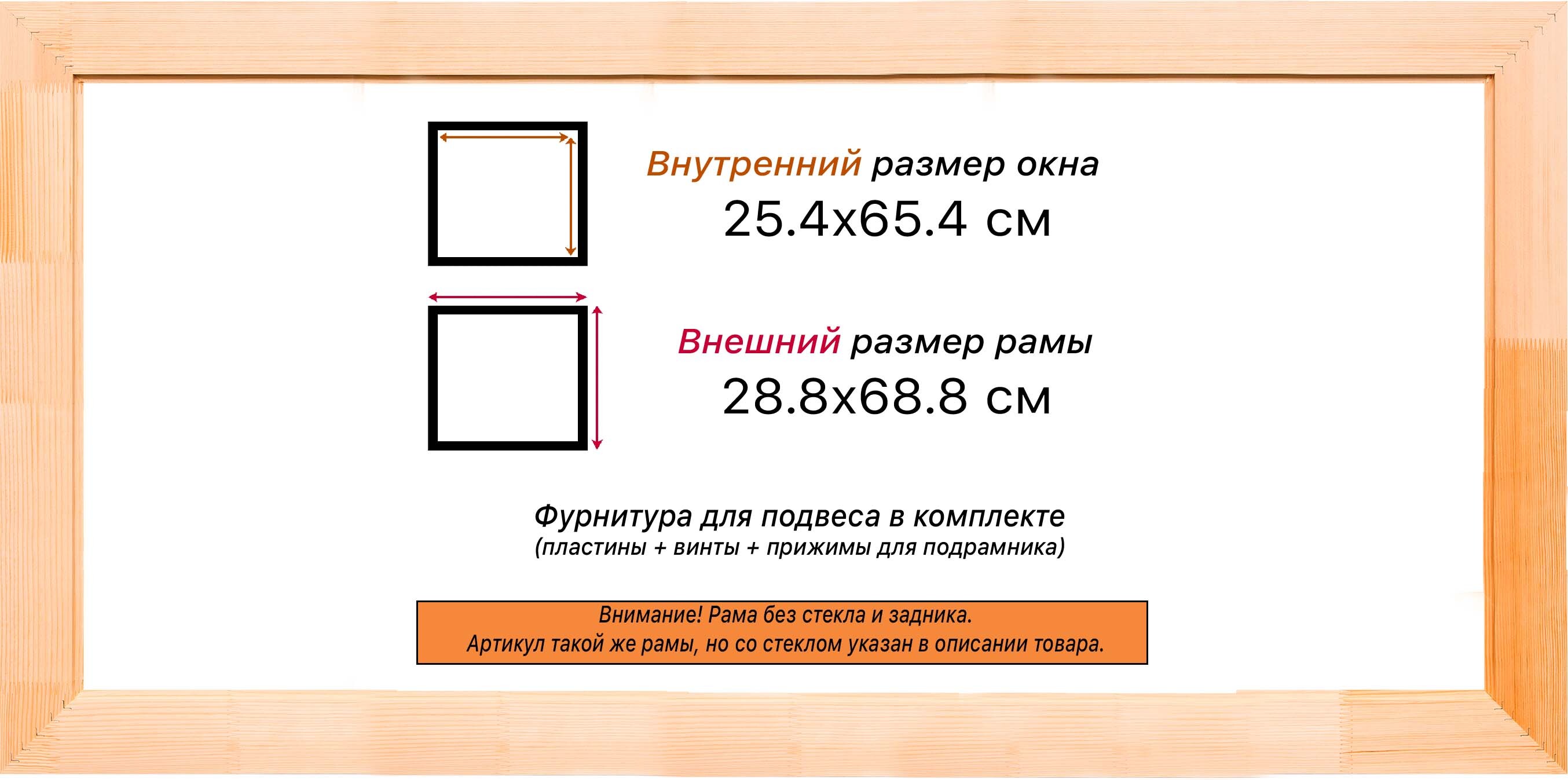 Рама изготовлена из древесины сосны 1 сорта. Подобный неокрашенный багет отлично подойдет для многих современных работ в разных стилях и жанрах. Но главная особенность данного багета в том, что его можно декорировать используя различные краски и лаки, такая рама будет в единственном экземпляре и уже являться эксклюзивным авторским творением. Рама выполнена из дерева (сосна), профиль шлифованный, неокрашенный. Указан внутренний размер окна рамы мм. (запас 2 мм с каждой стороны чтобы ваше изделие свободно поместилось). 1. Основные характеристики: - Размеры рамки: 25x65 (по размеру помещаемого изображения) - Габариты изделия: 29.2x69.2 см. - Цвет: не указан - Профиль: не указан - Сечение рамы: 19x30 мм - Ширина четверти: мм - Высота четверти: мм 2. Комплектация: - Подвесная пластина – 2 шт. - Прижимы для подрамника - Винты 3. Назначение: - Подходит для оформления: • Картин, включая картины по номерам • Алмазных мозаик и вышивок крестом • Постеров, фотографий, икон • Паспарту, зеркал • Вышивки бисером и алмазной мозаики • Медалей, орденов, спортивных наград • Старинных часов, ключей, монет или украшений - Используется как настенная или настольная фоторамка (нет подставки) 4. Преимущества: - Универсальность: квадратные и прямоугольные форматы, размеры от 10х10 до 100х100 см - Удобство: можно повесить горизонтально или вертикально - Широкий выбор: разные профили, расцветки, с опцией со стеклом или без - Идеальный подарок: для мамы, папы, бабушки, дедушки, друзей, коллег на день рождения, Новый год, 8 марта, 23 февраля, свадьбу, новоселье или любой другой праздник 5. Применение в интерьере: - Идеально для алмазной вышивки, мозаики, картин на подрамнике - Украшение дома: подходит для изображений цветов, живописи, портретов, натюрмортов, городских пейзажей, природы 6. Производство: - Страна: Россия, Санкт-Петербург - Качество: высококачественные материалы с вниманием к деталям