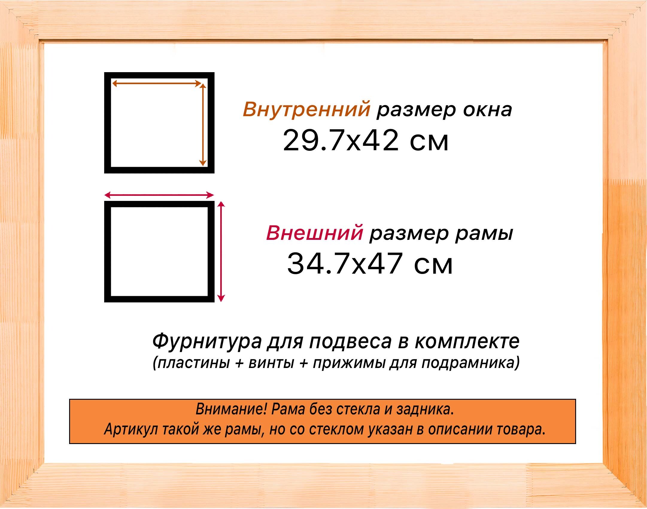 Рама изготовлена из древесины сосны 1 сорта. Подобный неокрашенный багет отлично подойдет для многих современных работ в разных стилях и жанрах. Но главная особенность данного багета в том, что его можно декорировать используя различные краски и лаки, такая рама будет в единственном экземпляре и уже являться эксклюзивным авторским творением. Рама выполнена из дерева (сосна), профиль шлифованный, неокрашенный. Указан внутренний размер окна рамы мм. (запас 2 мм с каждой стороны чтобы ваше изделие свободно поместилось). 1. Основные характеристики: - Размеры рамки: 29,7x42 (по размеру помещаемого изображения) - Габариты изделия: 36.1x48.4 см. - Цвет: не указан - Профиль: не указан - Сечение рамы: 30x16 мм - Ширина четверти: мм - Высота четверти: мм 2. Комплектация: - Подвесная пластина – 2 шт. - Прижимы для подрамника - Винты 3. Назначение: - Подходит для оформления: • Картин, включая картины по номерам • Алмазных мозаик и вышивок крестом • Постеров, фотографий, икон • Паспарту, зеркал • Вышивки бисером и алмазной мозаики • Медалей, орденов, спортивных наград • Старинных часов, ключей, монет или украшений - Используется как настенная или настольная фоторамка (нет подставки) 4. Преимущества: - Универсальность: квадратные и прямоугольные форматы, размеры от 10х10 до 100х100 см - Удобство: можно повесить горизонтально или вертикально - Широкий выбор: разные профили, расцветки, с опцией со стеклом или без - Идеальный подарок: для мамы, папы, бабушки, дедушки, друзей, коллег на день рождения, Новый год, 8 марта, 23 февраля, свадьбу, новоселье или любой другой праздник 5. Применение в интерьере: - Идеально для алмазной вышивки, мозаики, картин на подрамнике - Украшение дома: подходит для изображений цветов, живописи, портретов, натюрмортов, городских пейзажей, природы 6. Производство: - Страна: Россия, Санкт-Петербург - Качество: высококачественные материалы с вниманием к деталям