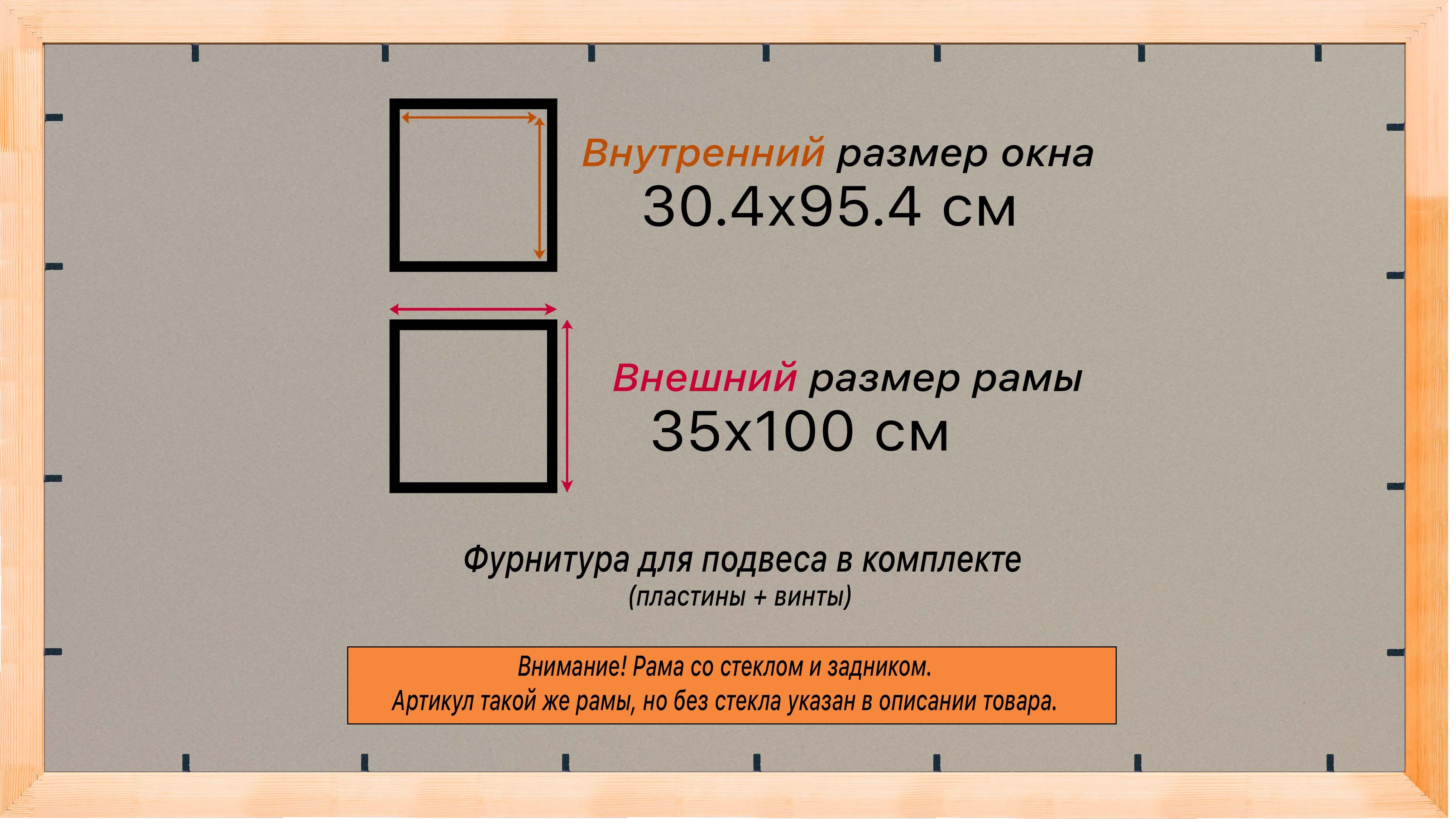 Рама изготовлена из древесины сосны 1 сорта. Подобный неокрашенный багет отлично подойдет для многих современных работ в разных стилях и жанрах. Но главная особенность данного багета в том, что его можно декорировать используя различные краски и лаки, такая рама будет в единственном экземпляре и уже являться эксклюзивным авторским творением. Рама выполнена из дерева (сосна), профиль шлифованный, неокрашенный. Указан внутренний размер окна рамы мм. (запас 2 мм с каждой стороны чтобы ваше изделие свободно поместилось). 1. Основные характеристики: - Размеры рамки: 30x95 (по размеру помещаемого изображения) - Габариты изделия: 36.4x101.4 см. - Цвет: не указан - Профиль: не указан - Сечение рамы: 30x16 мм - Ширина четверти: мм - Высота четверти: мм 2. Комплектация: - Стекло 2мм (обычное) - Задник - Подвесная пластина – 2 шт. - Винты - Прижимы для фиксации задника 3. Назначение: - Подходит для оформления: • Картин, включая картины по номерам • Алмазных мозаик и вышивок крестом • Постеров, фотографий, икон • Паспарту, зеркал • Вышивки бисером и алмазной мозаики • Медалей, орденов, спортивных наград • Старинных часов, ключей, монет или украшений - Используется как настенная или настольная фоторамка (нет подставки) 4. Преимущества: - Универсальность: квадратные и прямоугольные форматы, размеры от 10х10 до 100х100 см - Удобство: можно повесить горизонтально или вертикально - Широкий выбор: разные профили, расцветки, с опцией со стеклом или без - Идеальный подарок: для мамы, папы, бабушки, дедушки, друзей, коллег на день рождения, Новый год, 8 марта, 23 февраля, свадьбу, новоселье или любой другой праздник 5. Применение в интерьере: - Украшение дома: подходит для изображений цветов, живописи, портретов, натюрмортов, городских пейзажей, природы - Идеально для алмазной вышивки, мозаики, фотографий или постера 6. Производство: - Страна: Россия, Санкт-Петербург - Качество: высококачественные материалы с вниманием к деталям