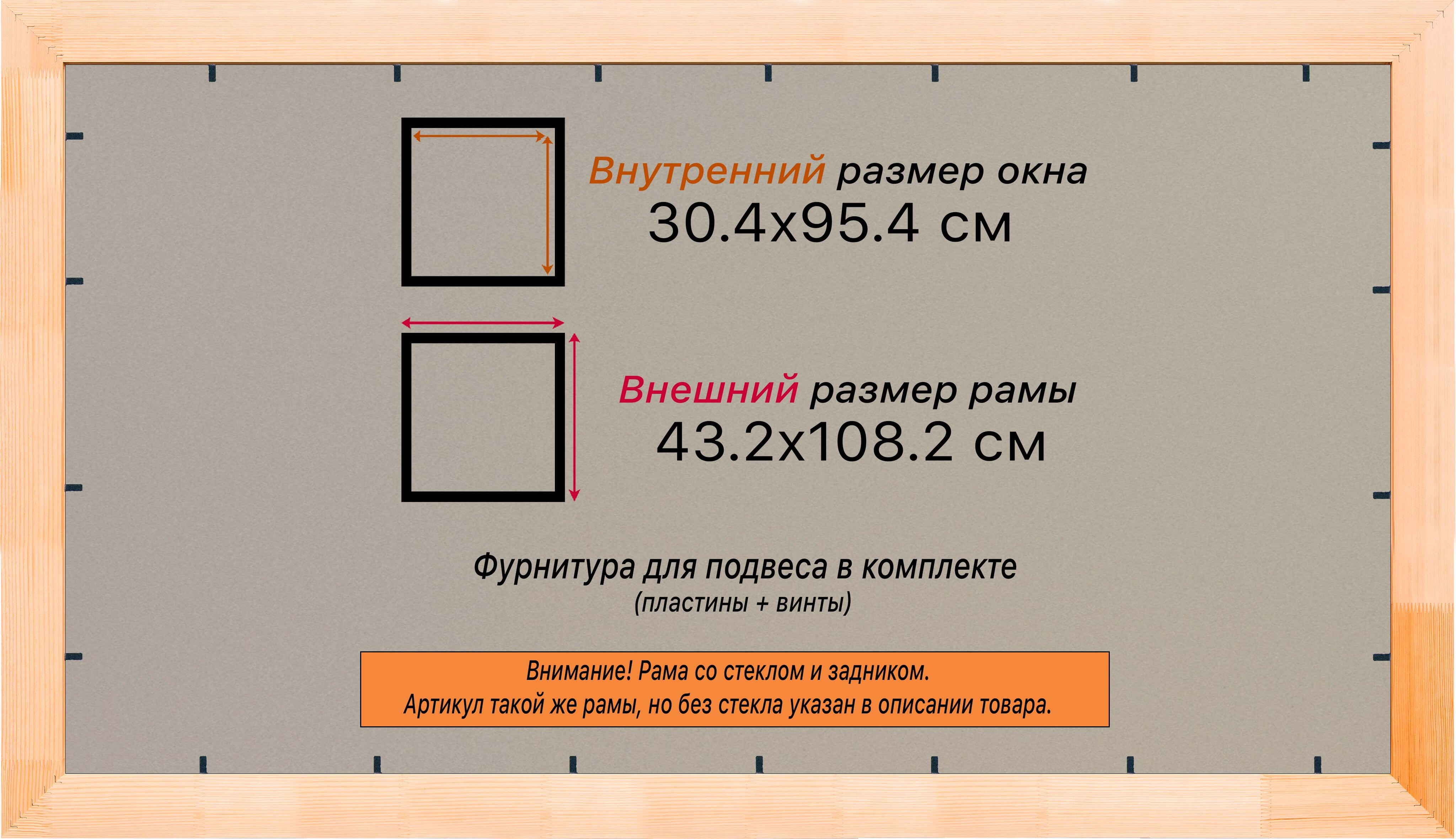 Рама изготовлена из древесины сосны 1 сорта. Подобный неокрашенный багет отлично подойдет для многих современных работ в разных стилях и жанрах. Но главная особенность данного багета в том, что его можно декорировать используя различные краски и лаки, такая рама будет в единственном экземпляре и уже являться эксклюзивным авторским творением. Рама выполнена из дерева (сосна), профиль шлифованный, неокрашенный. Указан внутренний размер окна рамы мм. (запас 2 мм с каждой стороны чтобы ваше изделие свободно поместилось). 1. Основные характеристики: - Размеры рамки: 30x95 (по размеру помещаемого изображения) - Габариты изделия: 44.6x109.6 см. - Цвет: не указан - Профиль: не указан - Сечение рамы: 71x28 мм - Ширина четверти: мм - Высота четверти: мм 2. Комплектация: - Стекло 2мм (обычное) - Задник - Подвесная пластина – 2 шт. - Винты - Прижимы для фиксации задника 3. Назначение: - Подходит для оформления: • Картин, включая картины по номерам • Алмазных мозаик и вышивок крестом • Постеров, фотографий, икон • Паспарту, зеркал • Вышивки бисером и алмазной мозаики • Медалей, орденов, спортивных наград • Старинных часов, ключей, монет или украшений - Используется как настенная или настольная фоторамка (нет подставки) 4. Преимущества: - Универсальность: квадратные и прямоугольные форматы, размеры от 10х10 до 100х100 см - Удобство: можно повесить горизонтально или вертикально - Широкий выбор: разные профили, расцветки, с опцией со стеклом или без - Идеальный подарок: для мамы, папы, бабушки, дедушки, друзей, коллег на день рождения, Новый год, 8 марта, 23 февраля, свадьбу, новоселье или любой другой праздник 5. Применение в интерьере: - Украшение дома: подходит для изображений цветов, живописи, портретов, натюрмортов, городских пейзажей, природы - Идеально для алмазной вышивки, мозаики, фотографий или постера 6. Производство: - Страна: Россия, Санкт-Петербург - Качество: высококачественные материалы с вниманием к деталям
