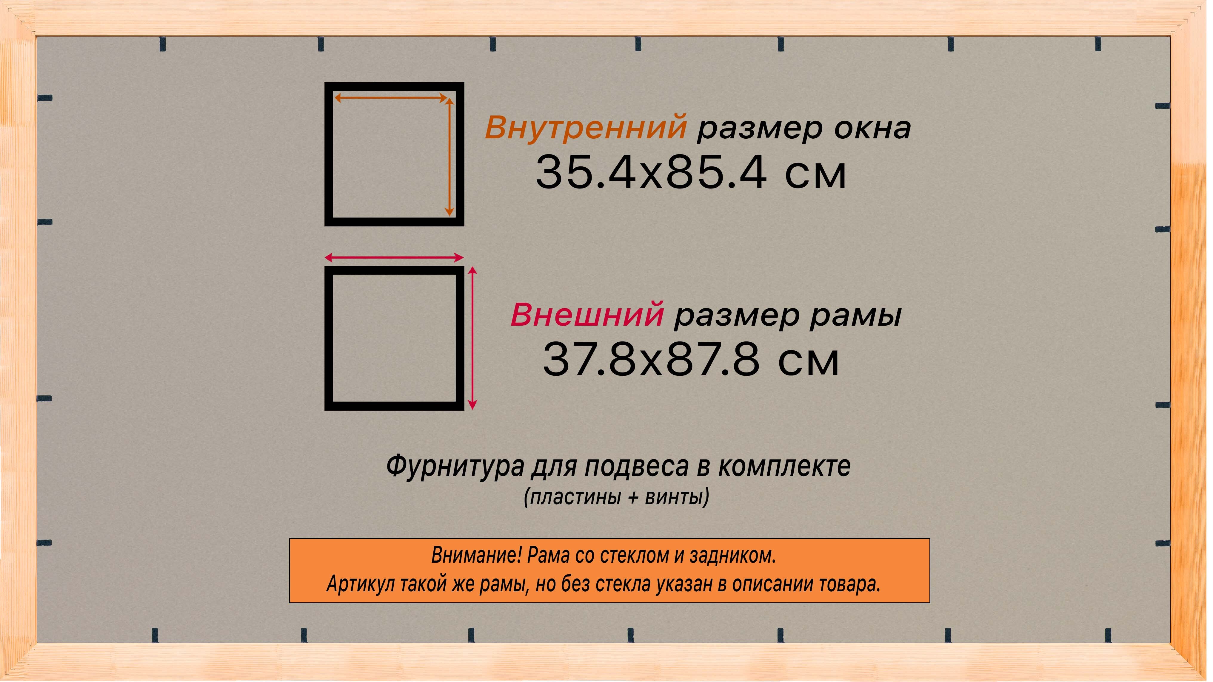 Рама изготовлена из древесины сосны 1 сорта. Подобный неокрашенный багет отлично подойдет для многих современных работ в разных стилях и жанрах. Но главная особенность данного багета в том, что его можно декорировать используя различные краски и лаки, такая рама будет в единственном экземпляре и уже являться эксклюзивным авторским творением. Рама выполнена из дерева (сосна), профиль шлифованный, неокрашенный. Указан внутренний размер окна рамы мм. (запас 2 мм с каждой стороны чтобы ваше изделие свободно поместилось). 1. Основные характеристики: - Размеры рамки: 35x85 (по размеру помещаемого изображения) - Габариты изделия: 40.2x90.2 см. - Цвет: не указан - Профиль: не указан - Сечение рамы: 24x15 мм - Ширина четверти: мм - Высота четверти: мм 2. Комплектация: - Стекло 2мм (обычное) - Задник - Подвесная пластина – 2 шт. - Винты - Прижимы для фиксации задника 3. Назначение: - Подходит для оформления: • Картин, включая картины по номерам • Алмазных мозаик и вышивок крестом • Постеров, фотографий, икон • Паспарту, зеркал • Вышивки бисером и алмазной мозаики • Медалей, орденов, спортивных наград • Старинных часов, ключей, монет или украшений - Используется как настенная или настольная фоторамка (нет подставки) 4. Преимущества: - Универсальность: квадратные и прямоугольные форматы, размеры от 10х10 до 100х100 см - Удобство: можно повесить горизонтально или вертикально - Широкий выбор: разные профили, расцветки, с опцией со стеклом или без - Идеальный подарок: для мамы, папы, бабушки, дедушки, друзей, коллег на день рождения, Новый год, 8 марта, 23 февраля, свадьбу, новоселье или любой другой праздник 5. Применение в интерьере: - Украшение дома: подходит для изображений цветов, живописи, портретов, натюрмортов, городских пейзажей, природы - Идеально для алмазной вышивки, мозаики, фотографий или постера 6. Производство: - Страна: Россия, Санкт-Петербург - Качество: высококачественные материалы с вниманием к деталям
