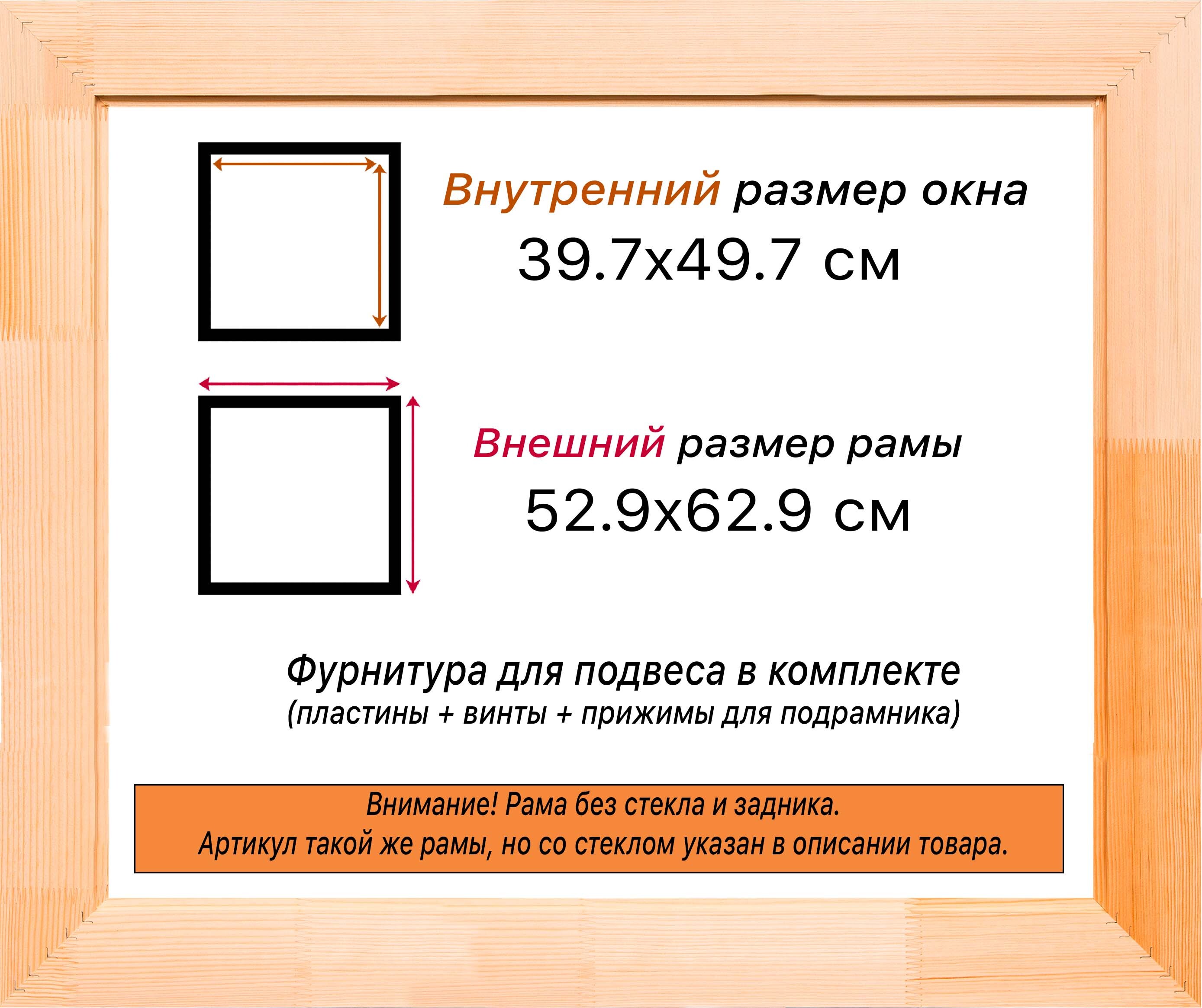 Рама изготовлена из древесины сосны 1 сорта. Подобный неокрашенный багет отлично подойдет для многих современных работ в разных стилях и жанрах. Но главная особенность данного багета в том, что его можно декорировать используя различные краски и лаки, такая рама будет в единственном экземпляре и уже являться эксклюзивным авторским творением. Рама выполнена из дерева (сосна), профиль шлифованный, неокрашенный. Указан внутренний размер окна рамы мм. (запас 2 мм с каждой стороны чтобы ваше изделие свободно поместилось). 1. Основные характеристики: - Размеры рамки: 39,7x49,7 (по размеру помещаемого изображения) - Габариты изделия: 54.3x64.3 см. - Цвет: не указан - Профиль: не указан - Сечение рамы: 71x28 мм - Ширина четверти: мм - Высота четверти: мм 2. Комплектация: - Подвесная пластина – 2 шт. - Прижимы для подрамника - Винты 3. Назначение: - Подходит для оформления: • Картин, включая картины по номерам • Алмазных мозаик и вышивок крестом • Постеров, фотографий, икон • Паспарту, зеркал • Вышивки бисером и алмазной мозаики • Медалей, орденов, спортивных наград • Старинных часов, ключей, монет или украшений - Используется как настенная или настольная фоторамка (нет подставки) 4. Преимущества: - Универсальность: квадратные и прямоугольные форматы, размеры от 10х10 до 100х100 см - Удобство: можно повесить горизонтально или вертикально - Широкий выбор: разные профили, расцветки, с опцией со стеклом или без - Идеальный подарок: для мамы, папы, бабушки, дедушки, друзей, коллег на день рождения, Новый год, 8 марта, 23 февраля, свадьбу, новоселье или любой другой праздник 5. Применение в интерьере: - Идеально для алмазной вышивки, мозаики, картин на подрамнике - Украшение дома: подходит для изображений цветов, живописи, портретов, натюрмортов, городских пейзажей, природы 6. Производство: - Страна: Россия, Санкт-Петербург - Качество: высококачественные материалы с вниманием к деталям