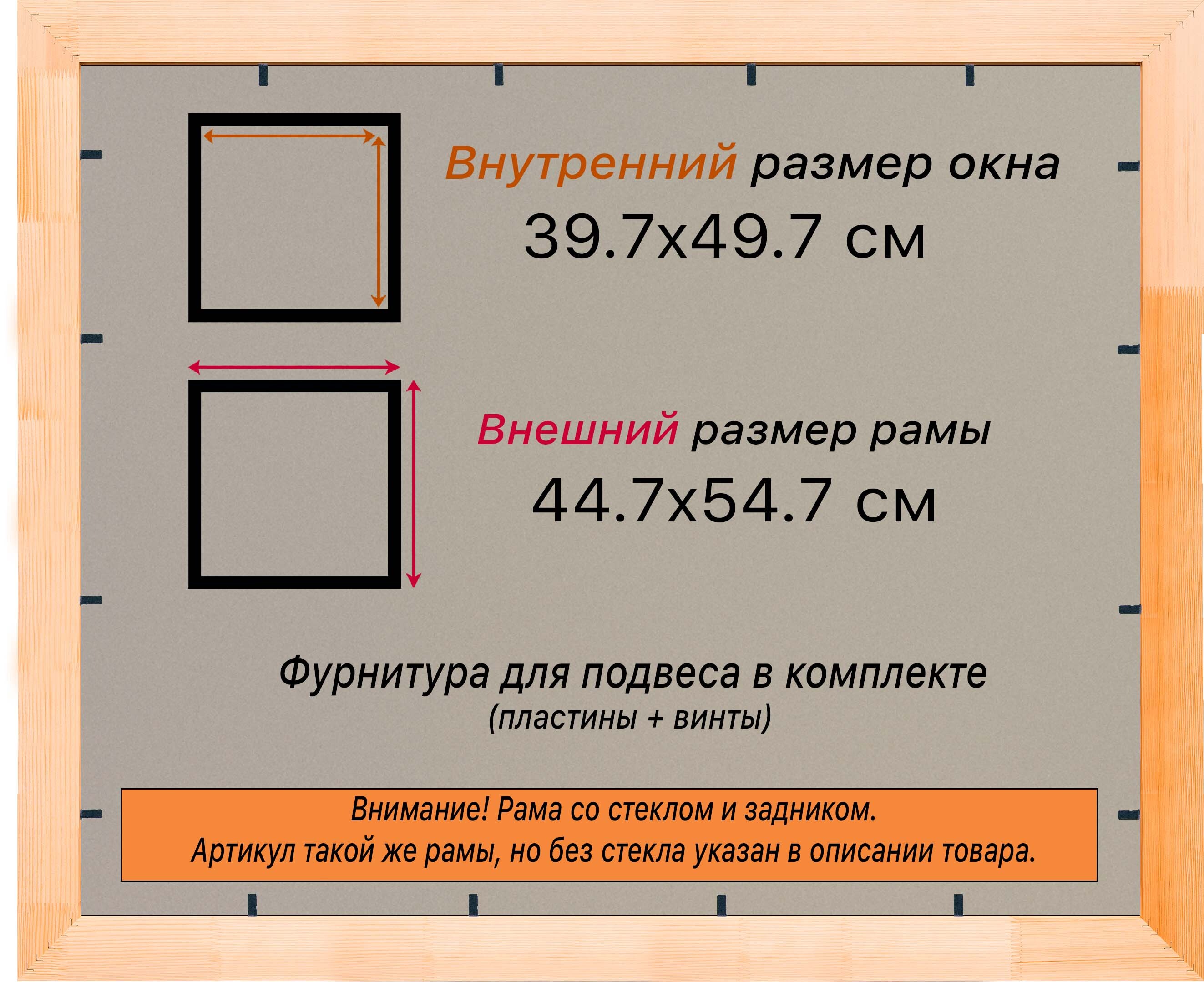 Рама изготовлена из древесины сосны 1 сорта. Подобный неокрашенный багет отлично подойдет для многих современных работ в разных стилях и жанрах. Но главная особенность данного багета в том, что его можно декорировать используя различные краски и лаки, такая рама будет в единственном экземпляре и уже являться эксклюзивным авторским творением. Рама выполнена из дерева (сосна), профиль шлифованный, неокрашенный. Указан внутренний размер окна рамы мм. (запас 2 мм с каждой стороны чтобы ваше изделие свободно поместилось). 1. Основные характеристики: - Размеры рамки: 39,7x49,7 (по размеру помещаемого изображения) - Габариты изделия: 46.1x56.1 см. - Цвет: не указан - Профиль: не указан - Сечение рамы: 30x16 мм - Ширина четверти: мм - Высота четверти: мм 2. Комплектация: - Стекло 2мм (обычное) - Задник - Подвесная пластина – 2 шт. - Винты - Прижимы для фиксации задника 3. Назначение: - Подходит для оформления: • Картин, включая картины по номерам • Алмазных мозаик и вышивок крестом • Постеров, фотографий, икон • Паспарту, зеркал • Вышивки бисером и алмазной мозаики • Медалей, орденов, спортивных наград • Старинных часов, ключей, монет или украшений - Используется как настенная или настольная фоторамка (нет подставки) 4. Преимущества: - Универсальность: квадратные и прямоугольные форматы, размеры от 10х10 до 100х100 см - Удобство: можно повесить горизонтально или вертикально - Широкий выбор: разные профили, расцветки, с опцией со стеклом или без - Идеальный подарок: для мамы, папы, бабушки, дедушки, друзей, коллег на день рождения, Новый год, 8 марта, 23 февраля, свадьбу, новоселье или любой другой праздник 5. Применение в интерьере: - Украшение дома: подходит для изображений цветов, живописи, портретов, натюрмортов, городских пейзажей, природы - Идеально для алмазной вышивки, мозаики, фотографий или постера 6. Производство: - Страна: Россия, Санкт-Петербург - Качество: высококачественные материалы с вниманием к деталям