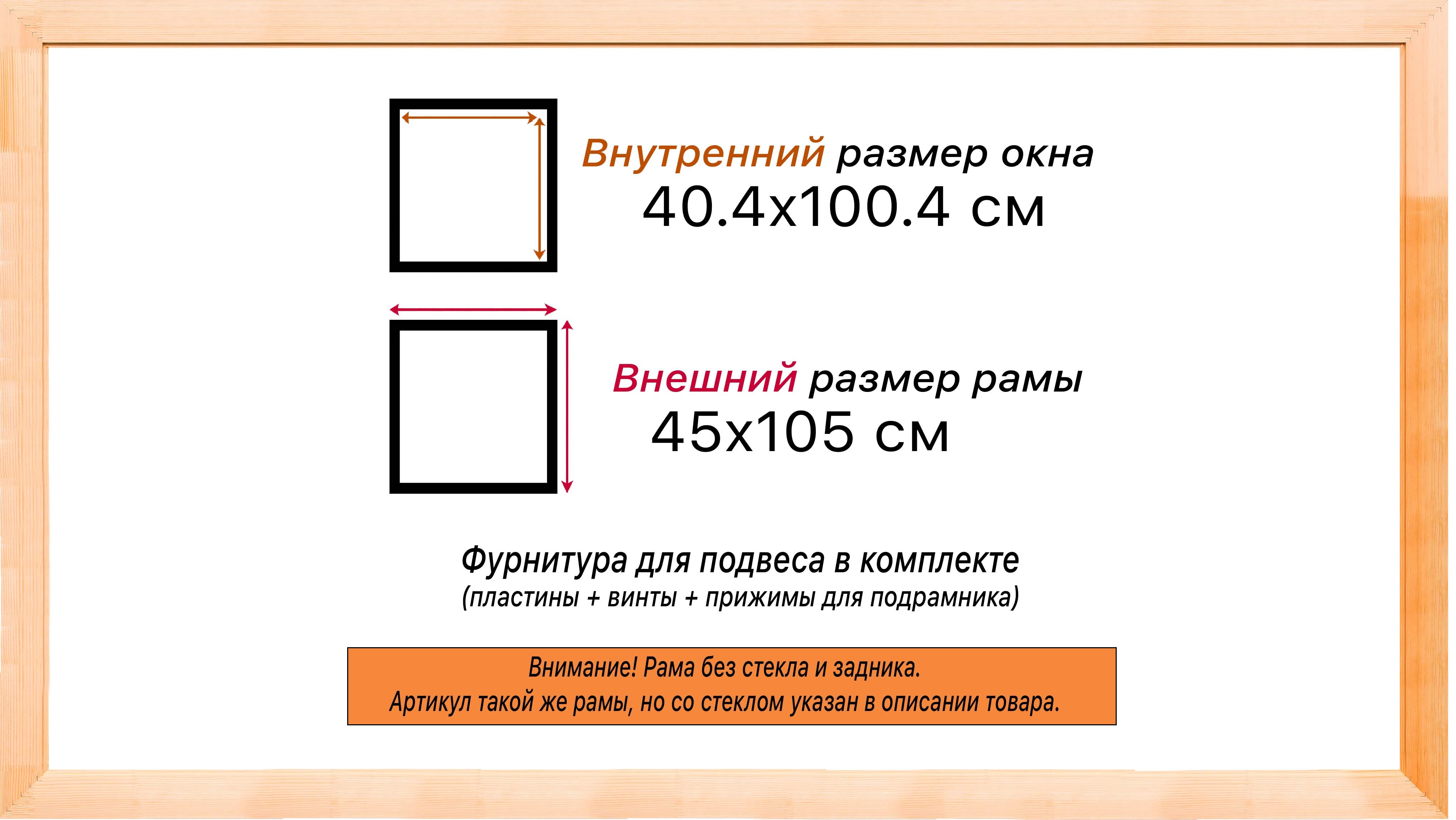 Рама изготовлена из древесины сосны 1 сорта. Подобный неокрашенный багет отлично подойдет для многих современных работ в разных стилях и жанрах. Но главная особенность данного багета в том, что его можно декорировать используя различные краски и лаки, такая рама будет в единственном экземпляре и уже являться эксклюзивным авторским творением. Рама выполнена из дерева (сосна), профиль шлифованный, неокрашенный. Указан внутренний размер окна рамы мм. (запас 2 мм с каждой стороны чтобы ваше изделие свободно поместилось). 1. Основные характеристики: - Размеры рамки: 40x100 (по размеру помещаемого изображения) - Габариты изделия: 46.4x106.4 см. - Цвет: не указан - Профиль: не указан - Сечение рамы: 30x16 мм - Ширина четверти: мм - Высота четверти: мм 2. Комплектация: - Подвесная пластина – 2 шт. - Прижимы для подрамника - Винты 3. Назначение: - Подходит для оформления: • Картин, включая картины по номерам • Алмазных мозаик и вышивок крестом • Постеров, фотографий, икон • Паспарту, зеркал • Вышивки бисером и алмазной мозаики • Медалей, орденов, спортивных наград • Старинных часов, ключей, монет или украшений - Используется как настенная или настольная фоторамка (нет подставки) 4. Преимущества: - Универсальность: квадратные и прямоугольные форматы, размеры от 10х10 до 100х100 см - Удобство: можно повесить горизонтально или вертикально - Широкий выбор: разные профили, расцветки, с опцией со стеклом или без - Идеальный подарок: для мамы, папы, бабушки, дедушки, друзей, коллег на день рождения, Новый год, 8 марта, 23 февраля, свадьбу, новоселье или любой другой праздник 5. Применение в интерьере: - Идеально для алмазной вышивки, мозаики, картин на подрамнике - Украшение дома: подходит для изображений цветов, живописи, портретов, натюрмортов, городских пейзажей, природы 6. Производство: - Страна: Россия, Санкт-Петербург - Качество: высококачественные материалы с вниманием к деталям