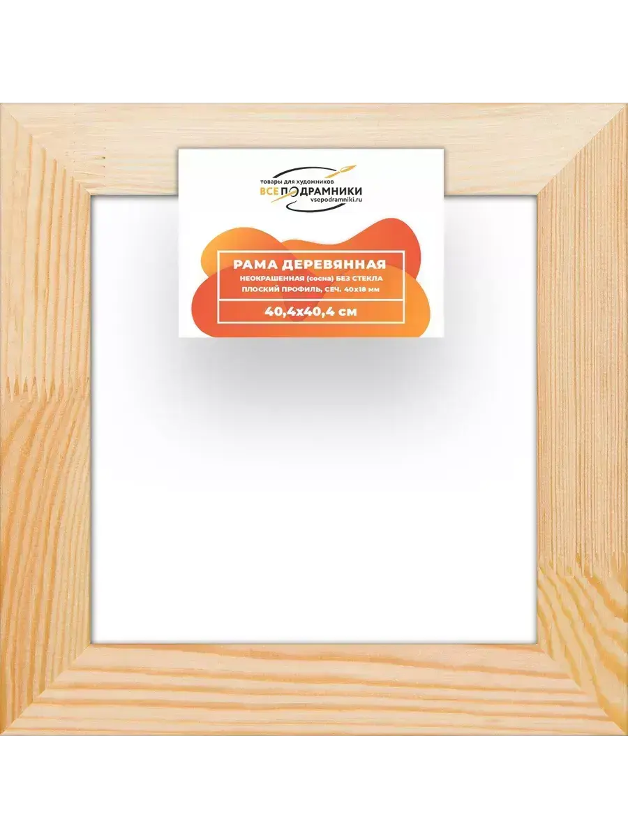 Рама изготовлена из древесины сосны 1 сорта. Подобный неокрашенный багет отлично подойдет для многих современных работ в разных стилях и жанрах. Но главная особенность данного багета в том, что его можно декорировать используя различные краски и лаки, такая рама будет в единственном экземпляре и уже являться эксклюзивным авторским творением. Рама выполнена из дерева (сосна), профиль шлифованный, неокрашенный. Указан внутренний размер окна рамы мм. (запас 2 мм с каждой стороны чтобы ваше изделие свободно поместилось). 1. Основные характеристики: - Размеры рамки: 40x40 (по размеру помещаемого изображения) - Габариты изделия: 48.4x48.4 см. - Цвет: не указан - Профиль: не указан - Сечение рамы: 40x18 мм - Ширина четверти: мм - Высота четверти: мм 2. Комплектация: - Подвесная пластина – 2 шт. - Прижимы для подрамника - Винты 3. Назначение: - Подходит для оформления: • Картин, включая картины по номерам • Алмазных мозаик и вышивок крестом • Постеров, фотографий, икон • Паспарту, зеркал • Вышивки бисером и алмазной мозаики • Медалей, орденов, спортивных наград • Старинных часов, ключей, монет или украшений - Используется как настенная или настольная фоторамка (нет подставки) 4. Преимущества: - Универсальность: квадратные и прямоугольные форматы, размеры от 10х10 до 100х100 см - Удобство: можно повесить горизонтально или вертикально - Широкий выбор: разные профили, расцветки, с опцией со стеклом или без - Идеальный подарок: для мамы, папы, бабушки, дедушки, друзей, коллег на день рождения, Новый год, 8 марта, 23 февраля, свадьбу, новоселье или любой другой праздник 5. Применение в интерьере: - Идеально для алмазной вышивки, мозаики, картин на подрамнике - Украшение дома: подходит для изображений цветов, живописи, портретов, натюрмортов, городских пейзажей, природы 6. Производство: - Страна: Россия, Санкт-Петербург - Качество: высококачественные материалы с вниманием к деталям