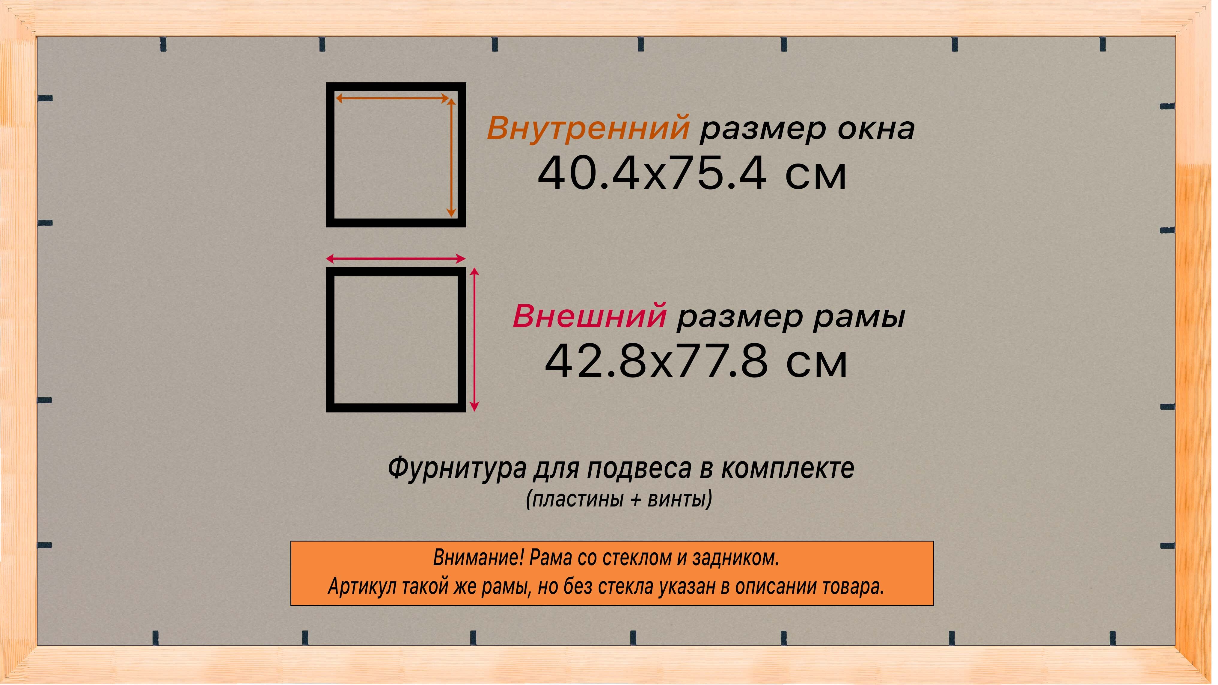 Рама изготовлена из древесины сосны 1 сорта. Подобный неокрашенный багет отлично подойдет для многих современных работ в разных стилях и жанрах. Но главная особенность данного багета в том, что его можно декорировать используя различные краски и лаки, такая рама будет в единственном экземпляре и уже являться эксклюзивным авторским творением. Рама выполнена из дерева (сосна), профиль шлифованный, неокрашенный. Указан внутренний размер окна рамы мм. (запас 2 мм с каждой стороны чтобы ваше изделие свободно поместилось). 1. Основные характеристики: - Размеры рамки: 40x75 (по размеру помещаемого изображения) - Габариты изделия: 45.2x80.2 см. - Цвет: не указан - Профиль: не указан - Сечение рамы: 24x15 мм - Ширина четверти: мм - Высота четверти: мм 2. Комплектация: - Стекло 2мм (обычное) - Задник - Подвесная пластина – 2 шт. - Винты - Прижимы для фиксации задника 3. Назначение: - Подходит для оформления: • Картин, включая картины по номерам • Алмазных мозаик и вышивок крестом • Постеров, фотографий, икон • Паспарту, зеркал • Вышивки бисером и алмазной мозаики • Медалей, орденов, спортивных наград • Старинных часов, ключей, монет или украшений - Используется как настенная или настольная фоторамка (нет подставки) 4. Преимущества: - Универсальность: квадратные и прямоугольные форматы, размеры от 10х10 до 100х100 см - Удобство: можно повесить горизонтально или вертикально - Широкий выбор: разные профили, расцветки, с опцией со стеклом или без - Идеальный подарок: для мамы, папы, бабушки, дедушки, друзей, коллег на день рождения, Новый год, 8 марта, 23 февраля, свадьбу, новоселье или любой другой праздник 5. Применение в интерьере: - Украшение дома: подходит для изображений цветов, живописи, портретов, натюрмортов, городских пейзажей, природы - Идеально для алмазной вышивки, мозаики, фотографий или постера 6. Производство: - Страна: Россия, Санкт-Петербург - Качество: высококачественные материалы с вниманием к деталям