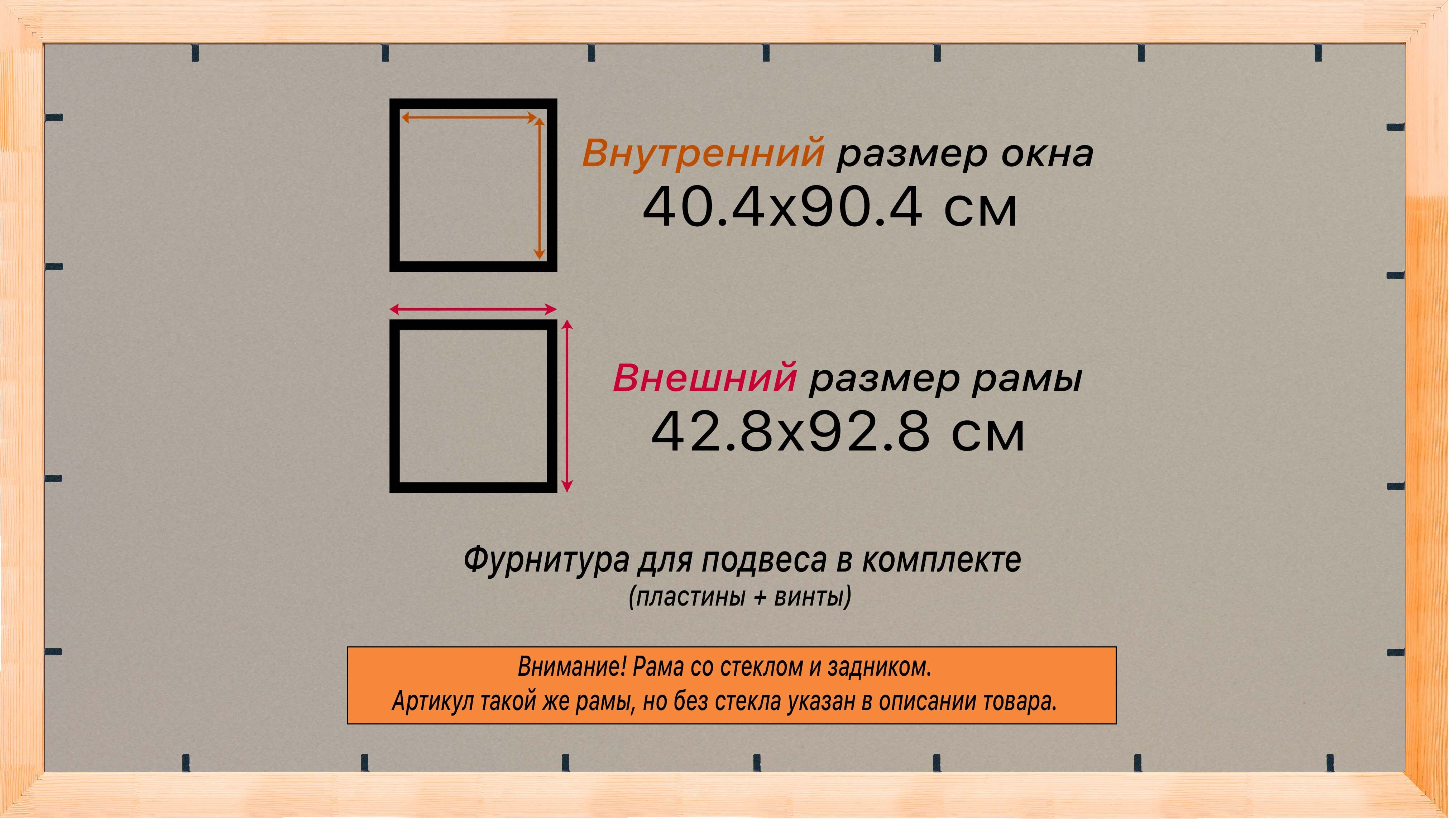 Рама изготовлена из древесины сосны 1 сорта. Подобный неокрашенный багет отлично подойдет для многих современных работ в разных стилях и жанрах. Но главная особенность данного багета в том, что его можно декорировать используя различные краски и лаки, такая рама будет в единственном экземпляре и уже являться эксклюзивным авторским творением. Рама выполнена из дерева (сосна), профиль шлифованный, неокрашенный. Указан внутренний размер окна рамы мм. (запас 2 мм с каждой стороны чтобы ваше изделие свободно поместилось). 1. Основные характеристики: - Размеры рамки: 40x90 (по размеру помещаемого изображения) - Габариты изделия: 45.2x95.2 см. - Цвет: не указан - Профиль: не указан - Сечение рамы: 24x15 мм - Ширина четверти: мм - Высота четверти: мм 2. Комплектация: - Стекло 2мм (обычное) - Задник - Подвесная пластина – 2 шт. - Винты - Прижимы для фиксации задника 3. Назначение: - Подходит для оформления: • Картин, включая картины по номерам • Алмазных мозаик и вышивок крестом • Постеров, фотографий, икон • Паспарту, зеркал • Вышивки бисером и алмазной мозаики • Медалей, орденов, спортивных наград • Старинных часов, ключей, монет или украшений - Используется как настенная или настольная фоторамка (нет подставки) 4. Преимущества: - Универсальность: квадратные и прямоугольные форматы, размеры от 10х10 до 100х100 см - Удобство: можно повесить горизонтально или вертикально - Широкий выбор: разные профили, расцветки, с опцией со стеклом или без - Идеальный подарок: для мамы, папы, бабушки, дедушки, друзей, коллег на день рождения, Новый год, 8 марта, 23 февраля, свадьбу, новоселье или любой другой праздник 5. Применение в интерьере: - Украшение дома: подходит для изображений цветов, живописи, портретов, натюрмортов, городских пейзажей, природы - Идеально для алмазной вышивки, мозаики, фотографий или постера 6. Производство: - Страна: Россия, Санкт-Петербург - Качество: высококачественные материалы с вниманием к деталям