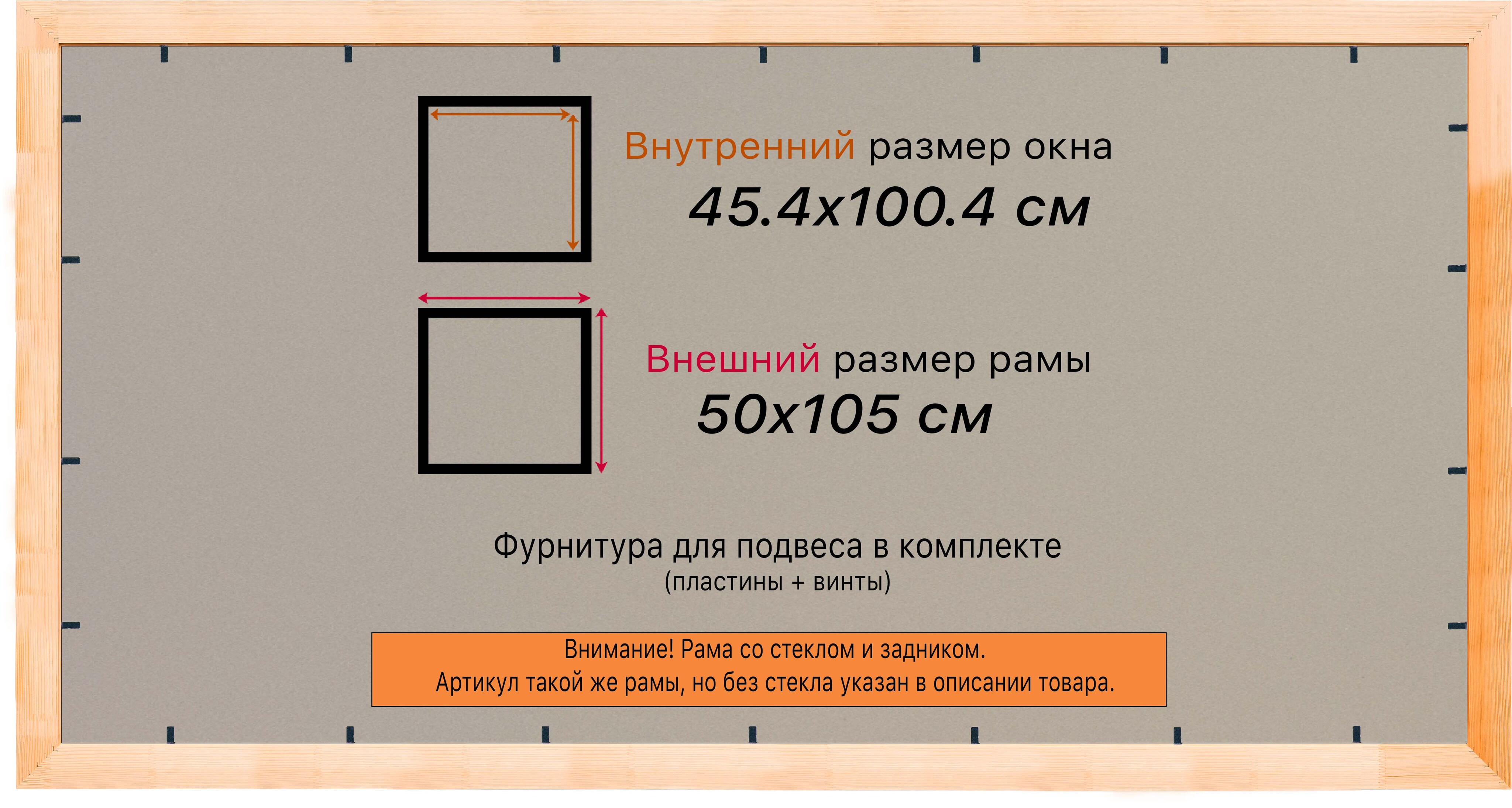 Рама изготовлена из древесины сосны 1 сорта. Подобный неокрашенный багет отлично подойдет для многих современных работ в разных стилях и жанрах. Но главная особенность данного багета в том, что его можно декорировать используя различные краски и лаки, такая рама будет в единственном экземпляре и уже являться эксклюзивным авторским творением. Рама выполнена из дерева (сосна), профиль шлифованный, неокрашенный. Указан внутренний размер окна рамы мм. (запас 2 мм с каждой стороны чтобы ваше изделие свободно поместилось). 1. Основные характеристики: - Размеры рамки: 45x100 (по размеру помещаемого изображения) - Габариты изделия: 51.4x106.4 см. - Цвет: не указан - Профиль: не указан - Сечение рамы: 30x16 мм - Ширина четверти: мм - Высота четверти: мм 2. Комплектация: - Стекло 2мм (обычное) - Задник - Подвесная пластина – 2 шт. - Винты - Прижимы для фиксации задника 3. Назначение: - Подходит для оформления: • Картин, включая картины по номерам • Алмазных мозаик и вышивок крестом • Постеров, фотографий, икон • Паспарту, зеркал • Вышивки бисером и алмазной мозаики • Медалей, орденов, спортивных наград • Старинных часов, ключей, монет или украшений - Используется как настенная или настольная фоторамка (нет подставки) 4. Преимущества: - Универсальность: квадратные и прямоугольные форматы, размеры от 10х10 до 100х100 см - Удобство: можно повесить горизонтально или вертикально - Широкий выбор: разные профили, расцветки, с опцией со стеклом или без - Идеальный подарок: для мамы, папы, бабушки, дедушки, друзей, коллег на день рождения, Новый год, 8 марта, 23 февраля, свадьбу, новоселье или любой другой праздник 5. Применение в интерьере: - Украшение дома: подходит для изображений цветов, живописи, портретов, натюрмортов, городских пейзажей, природы - Идеально для алмазной вышивки, мозаики, фотографий или постера 6. Производство: - Страна: Россия, Санкт-Петербург - Качество: высококачественные материалы с вниманием к деталям