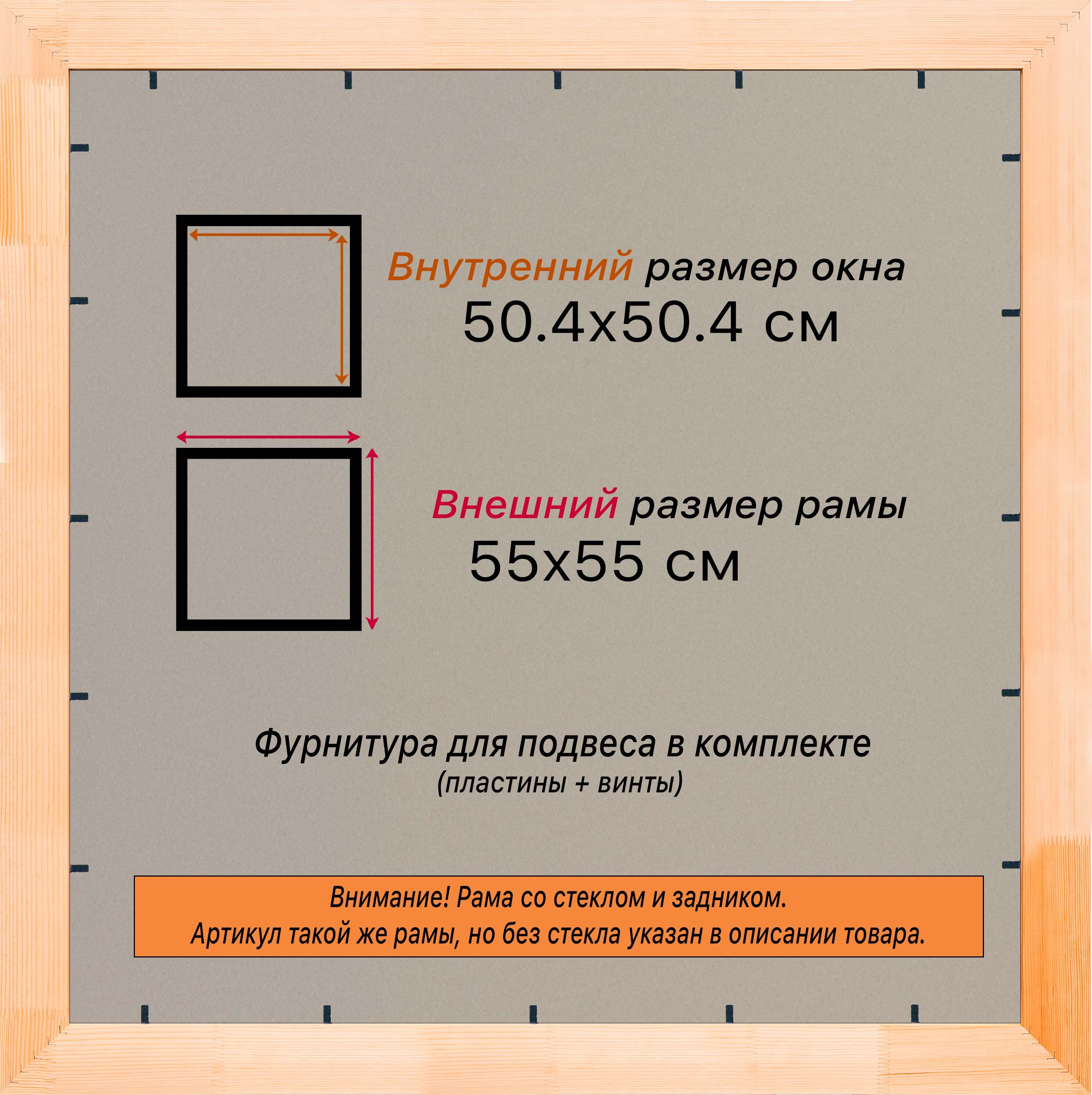 Рама изготовлена из древесины сосны 1 сорта. Подобный неокрашенный багет отлично подойдет для многих современных работ в разных стилях и жанрах. Но главная особенность данного багета в том, что его можно декорировать используя различные краски и лаки, такая рама будет в единственном экземпляре и уже являться эксклюзивным авторским творением. Рама выполнена из дерева (сосна), профиль шлифованный, неокрашенный. Указан внутренний размер окна рамы мм. (запас 2 мм с каждой стороны чтобы ваше изделие свободно поместилось). 1. Основные характеристики: - Размеры рамки: 50x50 (по размеру помещаемого изображения) - Габариты изделия: 56.4x56.4 см. - Цвет: не указан - Профиль: не указан - Сечение рамы: 30x16 мм - Ширина четверти: мм - Высота четверти: мм 2. Комплектация: - Стекло 2мм (обычное) - Задник - Подвесная пластина – 2 шт. - Винты - Прижимы для фиксации задника 3. Назначение: - Подходит для оформления: • Картин, включая картины по номерам • Алмазных мозаик и вышивок крестом • Постеров, фотографий, икон • Паспарту, зеркал • Вышивки бисером и алмазной мозаики • Медалей, орденов, спортивных наград • Старинных часов, ключей, монет или украшений - Используется как настенная или настольная фоторамка (нет подставки) 4. Преимущества: - Универсальность: квадратные и прямоугольные форматы, размеры от 10х10 до 100х100 см - Удобство: можно повесить горизонтально или вертикально - Широкий выбор: разные профили, расцветки, с опцией со стеклом или без - Идеальный подарок: для мамы, папы, бабушки, дедушки, друзей, коллег на день рождения, Новый год, 8 марта, 23 февраля, свадьбу, новоселье или любой другой праздник 5. Применение в интерьере: - Украшение дома: подходит для изображений цветов, живописи, портретов, натюрмортов, городских пейзажей, природы - Идеально для алмазной вышивки, мозаики, фотографий или постера 6. Производство: - Страна: Россия, Санкт-Петербург - Качество: высококачественные материалы с вниманием к деталям
