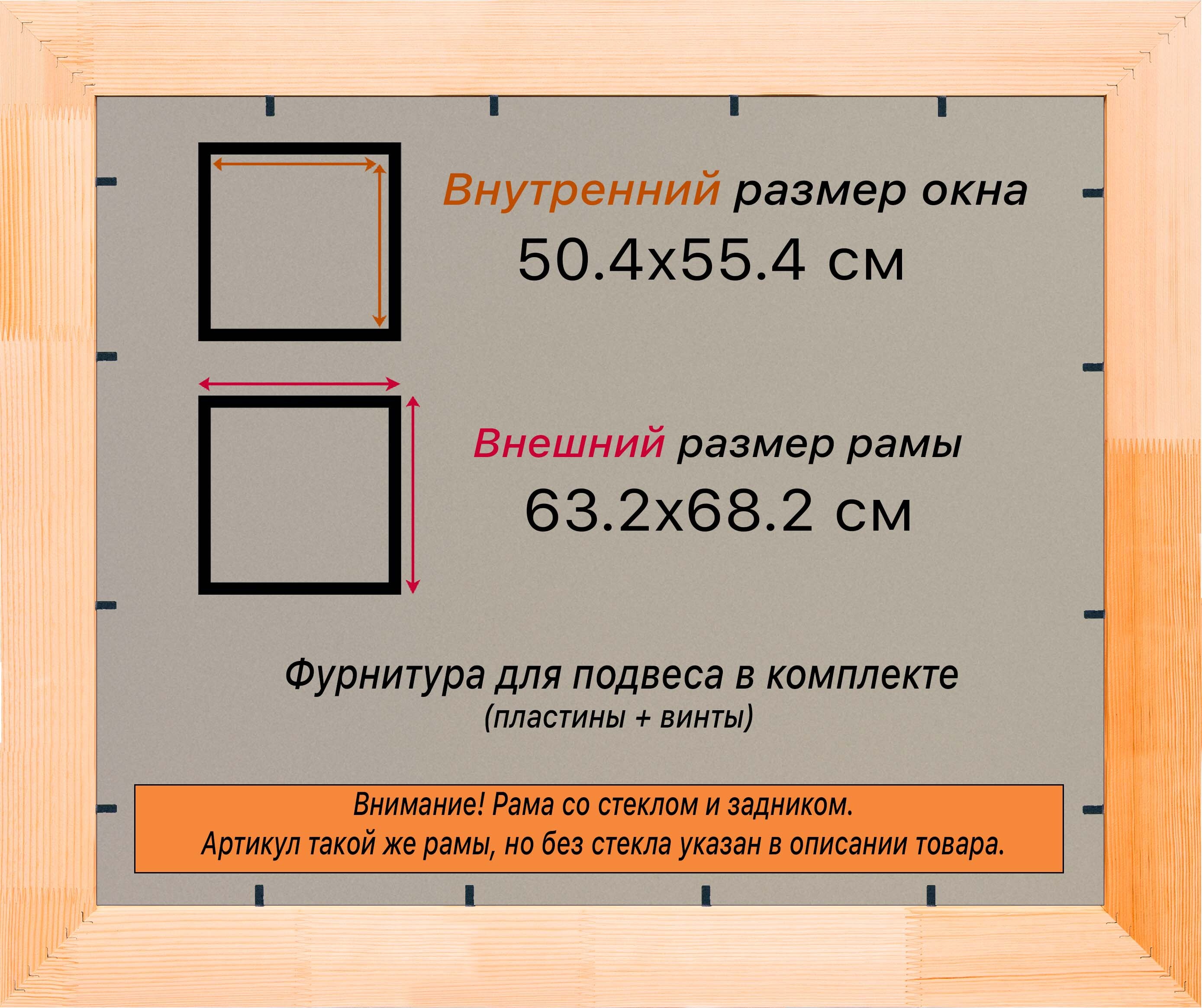Рама изготовлена из древесины сосны 1 сорта. Подобный неокрашенный багет отлично подойдет для многих современных работ в разных стилях и жанрах. Но главная особенность данного багета в том, что его можно декорировать используя различные краски и лаки, такая рама будет в единственном экземпляре и уже являться эксклюзивным авторским творением. Рама выполнена из дерева (сосна), профиль шлифованный, неокрашенный. Указан внутренний размер окна рамы мм. (запас 2 мм с каждой стороны чтобы ваше изделие свободно поместилось). 1. Основные характеристики: - Размеры рамки: 50x55 (по размеру помещаемого изображения) - Габариты изделия: 64.6x69.6 см. - Цвет: не указан - Профиль: не указан - Сечение рамы: 71x28 мм - Ширина четверти: мм - Высота четверти: мм 2. Комплектация: - Стекло 2мм (обычное) - Задник - Подвесная пластина – 2 шт. - Винты - Прижимы для фиксации задника 3. Назначение: - Подходит для оформления: • Картин, включая картины по номерам • Алмазных мозаик и вышивок крестом • Постеров, фотографий, икон • Паспарту, зеркал • Вышивки бисером и алмазной мозаики • Медалей, орденов, спортивных наград • Старинных часов, ключей, монет или украшений - Используется как настенная или настольная фоторамка (нет подставки) 4. Преимущества: - Универсальность: квадратные и прямоугольные форматы, размеры от 10х10 до 100х100 см - Удобство: можно повесить горизонтально или вертикально - Широкий выбор: разные профили, расцветки, с опцией со стеклом или без - Идеальный подарок: для мамы, папы, бабушки, дедушки, друзей, коллег на день рождения, Новый год, 8 марта, 23 февраля, свадьбу, новоселье или любой другой праздник 5. Применение в интерьере: - Украшение дома: подходит для изображений цветов, живописи, портретов, натюрмортов, городских пейзажей, природы - Идеально для алмазной вышивки, мозаики, фотографий или постера 6. Производство: - Страна: Россия, Санкт-Петербург - Качество: высококачественные материалы с вниманием к деталям