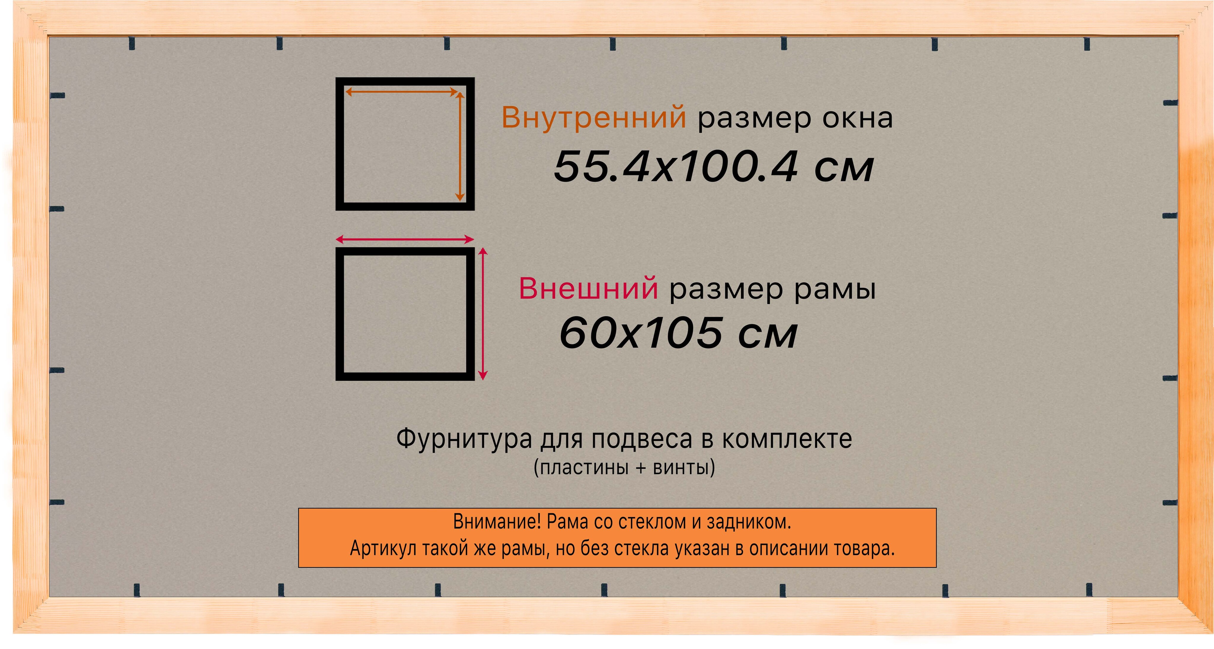 Рама изготовлена из древесины сосны 1 сорта. Подобный неокрашенный багет отлично подойдет для многих современных работ в разных стилях и жанрах. Но главная особенность данного багета в том, что его можно декорировать используя различные краски и лаки, такая рама будет в единственном экземпляре и уже являться эксклюзивным авторским творением. Рама выполнена из дерева (сосна), профиль шлифованный, неокрашенный. Указан внутренний размер окна рамы мм. (запас 2 мм с каждой стороны чтобы ваше изделие свободно поместилось). 1. Основные характеристики: - Размеры рамки: 55x100 (по размеру помещаемого изображения) - Габариты изделия: 61.4x106.4 см. - Цвет: не указан - Профиль: не указан - Сечение рамы: 30x16 мм - Ширина четверти: мм - Высота четверти: мм 2. Комплектация: - Стекло 2мм (обычное) - Задник - Подвесная пластина – 2 шт. - Винты - Прижимы для фиксации задника 3. Назначение: - Подходит для оформления: • Картин, включая картины по номерам • Алмазных мозаик и вышивок крестом • Постеров, фотографий, икон • Паспарту, зеркал • Вышивки бисером и алмазной мозаики • Медалей, орденов, спортивных наград • Старинных часов, ключей, монет или украшений - Используется как настенная или настольная фоторамка (нет подставки) 4. Преимущества: - Универсальность: квадратные и прямоугольные форматы, размеры от 10х10 до 100х100 см - Удобство: можно повесить горизонтально или вертикально - Широкий выбор: разные профили, расцветки, с опцией со стеклом или без - Идеальный подарок: для мамы, папы, бабушки, дедушки, друзей, коллег на день рождения, Новый год, 8 марта, 23 февраля, свадьбу, новоселье или любой другой праздник 5. Применение в интерьере: - Украшение дома: подходит для изображений цветов, живописи, портретов, натюрмортов, городских пейзажей, природы - Идеально для алмазной вышивки, мозаики, фотографий или постера 6. Производство: - Страна: Россия, Санкт-Петербург - Качество: высококачественные материалы с вниманием к деталям