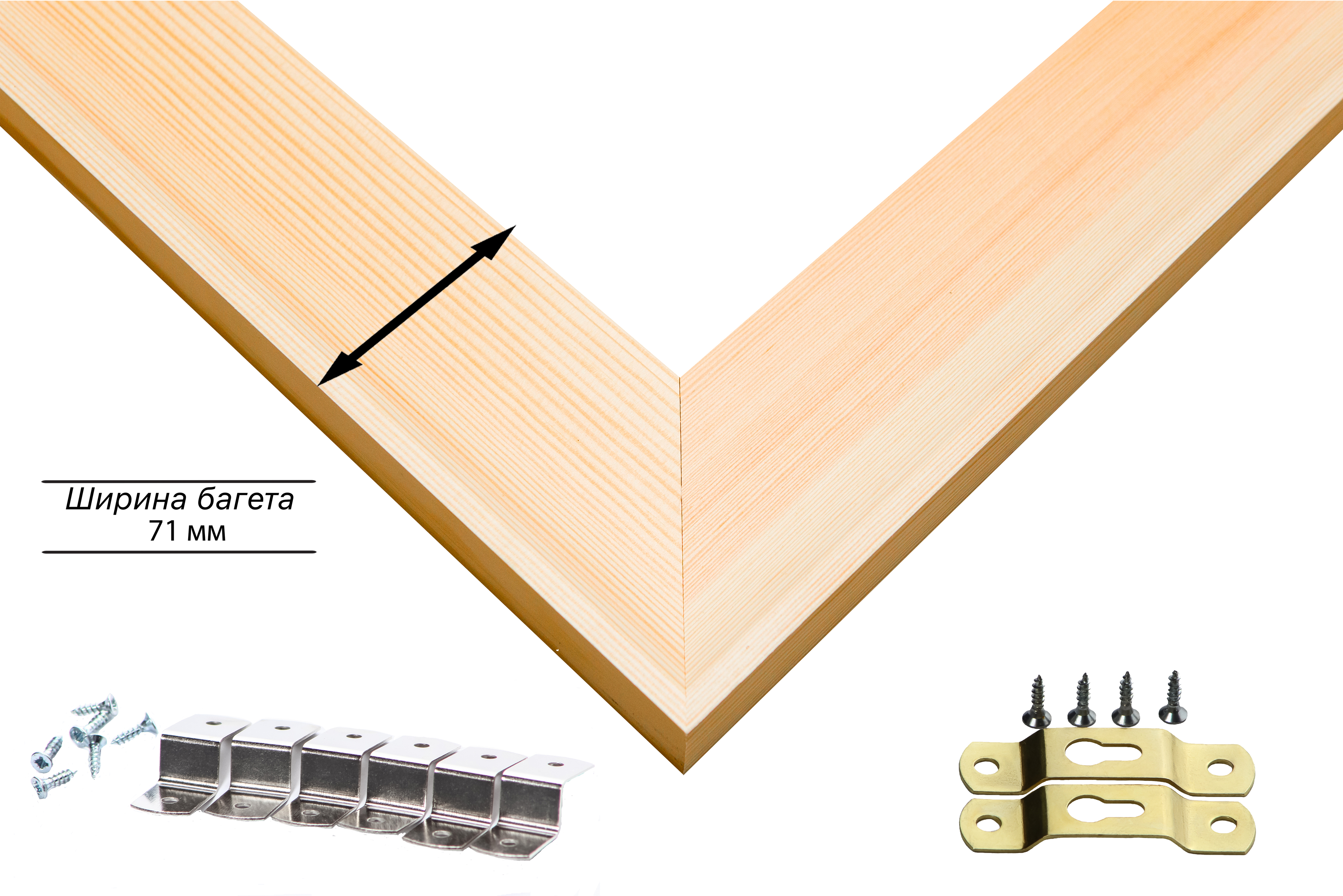 Рама изготовлена из древесины сосны 1 сорта. Подобный неокрашенный багет отлично подойдет для многих современных работ в разных стилях и жанрах. Но главная особенность данного багета в том, что его можно декорировать используя различные краски и лаки, такая рама будет в единственном экземпляре и уже являться эксклюзивным авторским творением. Рама выполнена из дерева (сосна), профиль шлифованный, неокрашенный. Указан внутренний размер окна рамы мм. (запас 2 мм с каждой стороны чтобы ваше изделие свободно поместилось). 1. Основные характеристики: - Размеры рамки: 60x80 (по размеру помещаемого изображения) - Габариты изделия: 74.6x94.6 см. - Цвет: не указан - Профиль: не указан - Сечение рамы: 71x28 мм - Ширина четверти: мм - Высота четверти: мм 2. Комплектация: - Подвесная пластина – 2 шт. - Прижимы для подрамника - Винты 3. Назначение: - Подходит для оформления: • Картин, включая картины по номерам • Алмазных мозаик и вышивок крестом • Постеров, фотографий, икон • Паспарту, зеркал • Вышивки бисером и алмазной мозаики • Медалей, орденов, спортивных наград • Старинных часов, ключей, монет или украшений - Используется как настенная или настольная фоторамка (нет подставки) 4. Преимущества: - Универсальность: квадратные и прямоугольные форматы, размеры от 10х10 до 100х100 см - Удобство: можно повесить горизонтально или вертикально - Широкий выбор: разные профили, расцветки, с опцией со стеклом или без - Идеальный подарок: для мамы, папы, бабушки, дедушки, друзей, коллег на день рождения, Новый год, 8 марта, 23 февраля, свадьбу, новоселье или любой другой праздник 5. Применение в интерьере: - Идеально для алмазной вышивки, мозаики, картин на подрамнике - Украшение дома: подходит для изображений цветов, живописи, портретов, натюрмортов, городских пейзажей, природы 6. Производство: - Страна: Россия, Санкт-Петербург - Качество: высококачественные материалы с вниманием к деталям