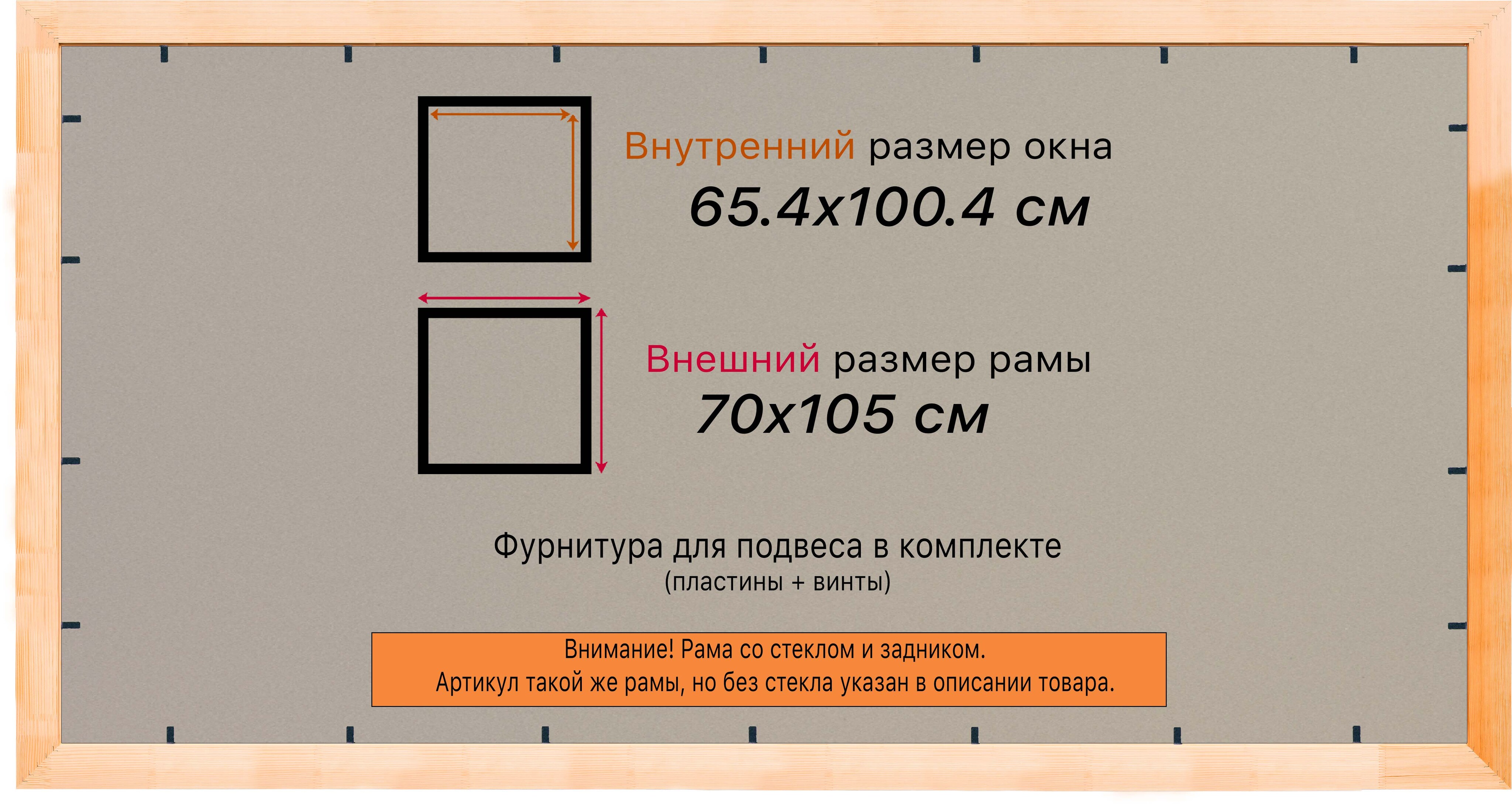 Рама изготовлена из древесины сосны 1 сорта. Подобный неокрашенный багет отлично подойдет для многих современных работ в разных стилях и жанрах. Но главная особенность данного багета в том, что его можно декорировать используя различные краски и лаки, такая рама будет в единственном экземпляре и уже являться эксклюзивным авторским творением. Рама выполнена из дерева (сосна), профиль шлифованный, неокрашенный. Указан внутренний размер окна рамы мм. (запас 2 мм с каждой стороны чтобы ваше изделие свободно поместилось). 1. Основные характеристики: - Размеры рамки: 65x100 (по размеру помещаемого изображения) - Габариты изделия: 71.4x106.4 см. - Цвет: не указан - Профиль: не указан - Сечение рамы: 30x16 мм - Ширина четверти: мм - Высота четверти: мм 2. Комплектация: - Стекло 2мм (обычное) - Задник - Подвесная пластина – 2 шт. - Винты - Прижимы для фиксации задника 3. Назначение: - Подходит для оформления: • Картин, включая картины по номерам • Алмазных мозаик и вышивок крестом • Постеров, фотографий, икон • Паспарту, зеркал • Вышивки бисером и алмазной мозаики • Медалей, орденов, спортивных наград • Старинных часов, ключей, монет или украшений - Используется как настенная или настольная фоторамка (нет подставки) 4. Преимущества: - Универсальность: квадратные и прямоугольные форматы, размеры от 10х10 до 100х100 см - Удобство: можно повесить горизонтально или вертикально - Широкий выбор: разные профили, расцветки, с опцией со стеклом или без - Идеальный подарок: для мамы, папы, бабушки, дедушки, друзей, коллег на день рождения, Новый год, 8 марта, 23 февраля, свадьбу, новоселье или любой другой праздник 5. Применение в интерьере: - Украшение дома: подходит для изображений цветов, живописи, портретов, натюрмортов, городских пейзажей, природы - Идеально для алмазной вышивки, мозаики, фотографий или постера 6. Производство: - Страна: Россия, Санкт-Петербург - Качество: высококачественные материалы с вниманием к деталям