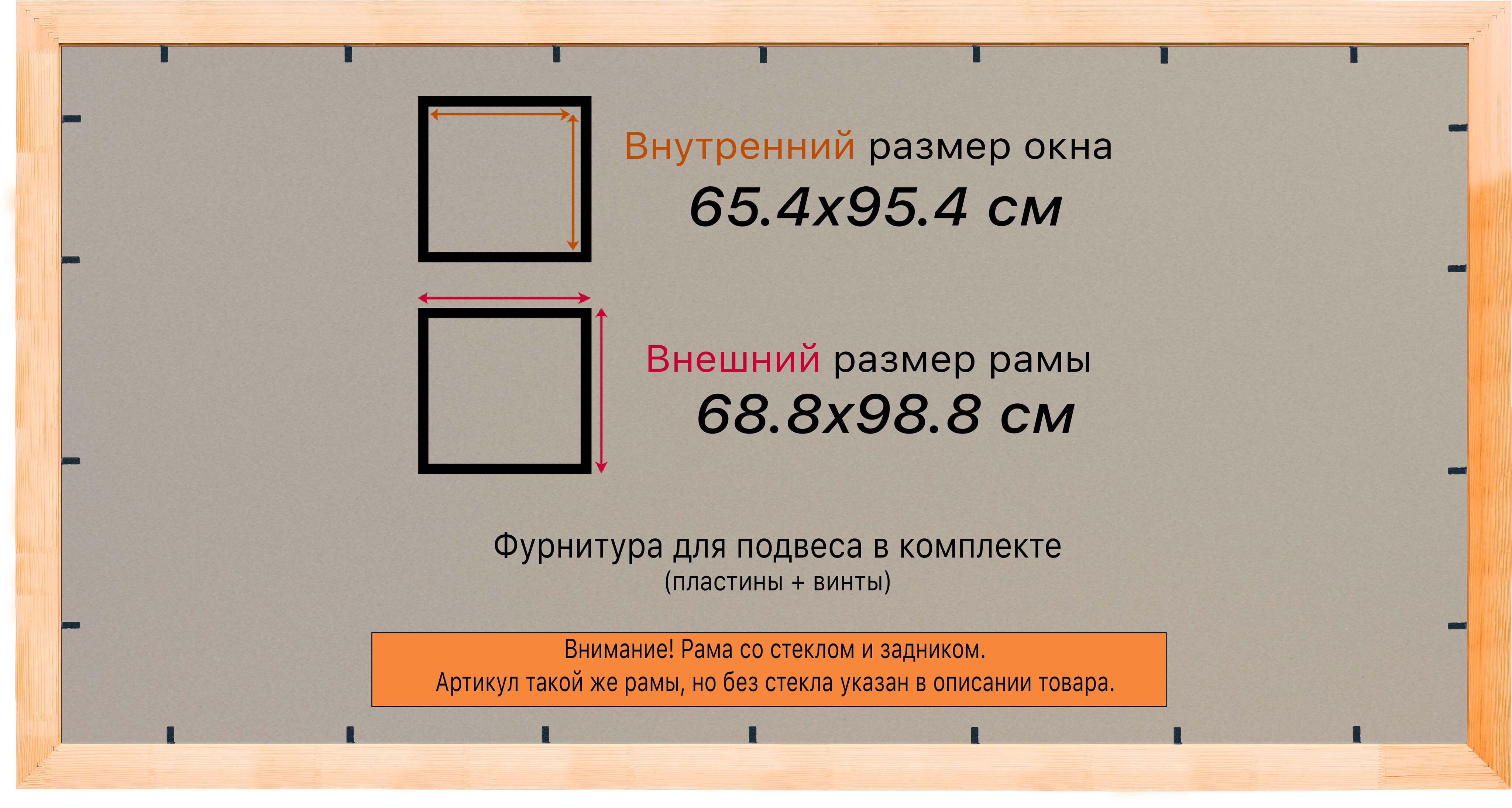 Рама изготовлена из древесины сосны 1 сорта. Подобный неокрашенный багет отлично подойдет для многих современных работ в разных стилях и жанрах. Но главная особенность данного багета в том, что его можно декорировать используя различные краски и лаки, такая рама будет в единственном экземпляре и уже являться эксклюзивным авторским творением. Рама выполнена из дерева (сосна), профиль шлифованный, неокрашенный. Указан внутренний размер окна рамы мм. (запас 2 мм с каждой стороны чтобы ваше изделие свободно поместилось). 1. Основные характеристики: - Размеры рамки: 65x95 (по размеру помещаемого изображения) - Габариты изделия: 69.2x99.2 см. - Цвет: не указан - Профиль: не указан - Сечение рамы: 19x30 мм - Ширина четверти: мм - Высота четверти: мм 2. Комплектация: - Стекло 2мм (обычное) - Задник - Подвесная пластина – 2 шт. - Винты - Прижимы для фиксации задника 3. Назначение: - Подходит для оформления: • Картин, включая картины по номерам • Алмазных мозаик и вышивок крестом • Постеров, фотографий, икон • Паспарту, зеркал • Вышивки бисером и алмазной мозаики • Медалей, орденов, спортивных наград • Старинных часов, ключей, монет или украшений - Используется как настенная или настольная фоторамка (нет подставки) 4. Преимущества: - Универсальность: квадратные и прямоугольные форматы, размеры от 10х10 до 100х100 см - Удобство: можно повесить горизонтально или вертикально - Широкий выбор: разные профили, расцветки, с опцией со стеклом или без - Идеальный подарок: для мамы, папы, бабушки, дедушки, друзей, коллег на день рождения, Новый год, 8 марта, 23 февраля, свадьбу, новоселье или любой другой праздник 5. Применение в интерьере: - Украшение дома: подходит для изображений цветов, живописи, портретов, натюрмортов, городских пейзажей, природы - Идеально для алмазной вышивки, мозаики, фотографий или постера 6. Производство: - Страна: Россия, Санкт-Петербург - Качество: высококачественные материалы с вниманием к деталям