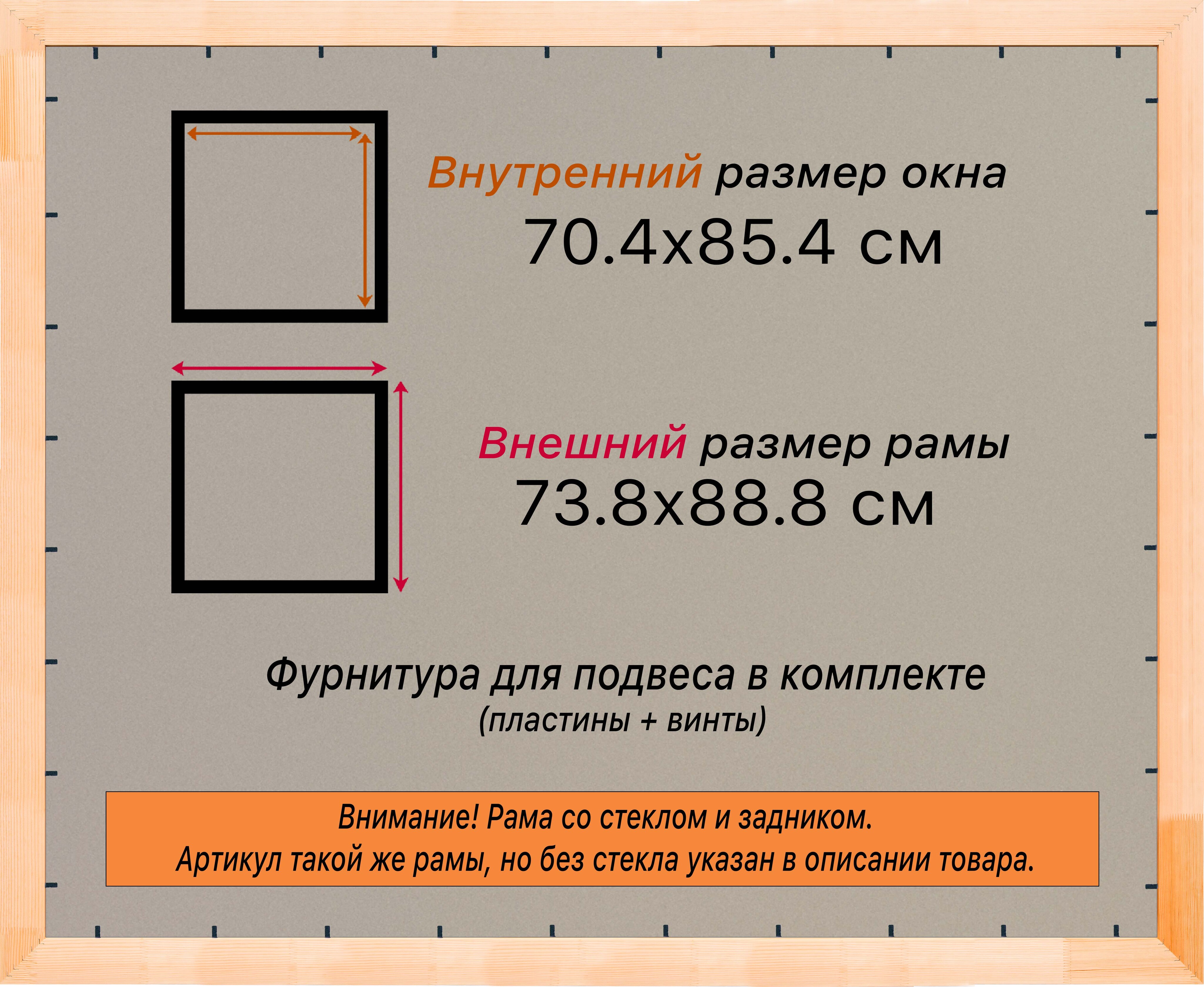Рама изготовлена из древесины сосны 1 сорта. Подобный неокрашенный багет отлично подойдет для многих современных работ в разных стилях и жанрах. Но главная особенность данного багета в том, что его можно декорировать используя различные краски и лаки, такая рама будет в единственном экземпляре и уже являться эксклюзивным авторским творением. Рама выполнена из дерева (сосна), профиль шлифованный, неокрашенный. Указан внутренний размер окна рамы мм. (запас 2 мм с каждой стороны чтобы ваше изделие свободно поместилось). 1. Основные характеристики: - Размеры рамки: 70x85 (по размеру помещаемого изображения) - Габариты изделия: 74.2x89.2 см. - Цвет: не указан - Профиль: не указан - Сечение рамы: 19x30 мм - Ширина четверти: мм - Высота четверти: мм 2. Комплектация: - Стекло 2мм (обычное) - Задник - Подвесная пластина – 2 шт. - Винты - Прижимы для фиксации задника 3. Назначение: - Подходит для оформления: • Картин, включая картины по номерам • Алмазных мозаик и вышивок крестом • Постеров, фотографий, икон • Паспарту, зеркал • Вышивки бисером и алмазной мозаики • Медалей, орденов, спортивных наград • Старинных часов, ключей, монет или украшений - Используется как настенная или настольная фоторамка (нет подставки) 4. Преимущества: - Универсальность: квадратные и прямоугольные форматы, размеры от 10х10 до 100х100 см - Удобство: можно повесить горизонтально или вертикально - Широкий выбор: разные профили, расцветки, с опцией со стеклом или без - Идеальный подарок: для мамы, папы, бабушки, дедушки, друзей, коллег на день рождения, Новый год, 8 марта, 23 февраля, свадьбу, новоселье или любой другой праздник 5. Применение в интерьере: - Украшение дома: подходит для изображений цветов, живописи, портретов, натюрмортов, городских пейзажей, природы - Идеально для алмазной вышивки, мозаики, фотографий или постера 6. Производство: - Страна: Россия, Санкт-Петербург - Качество: высококачественные материалы с вниманием к деталям