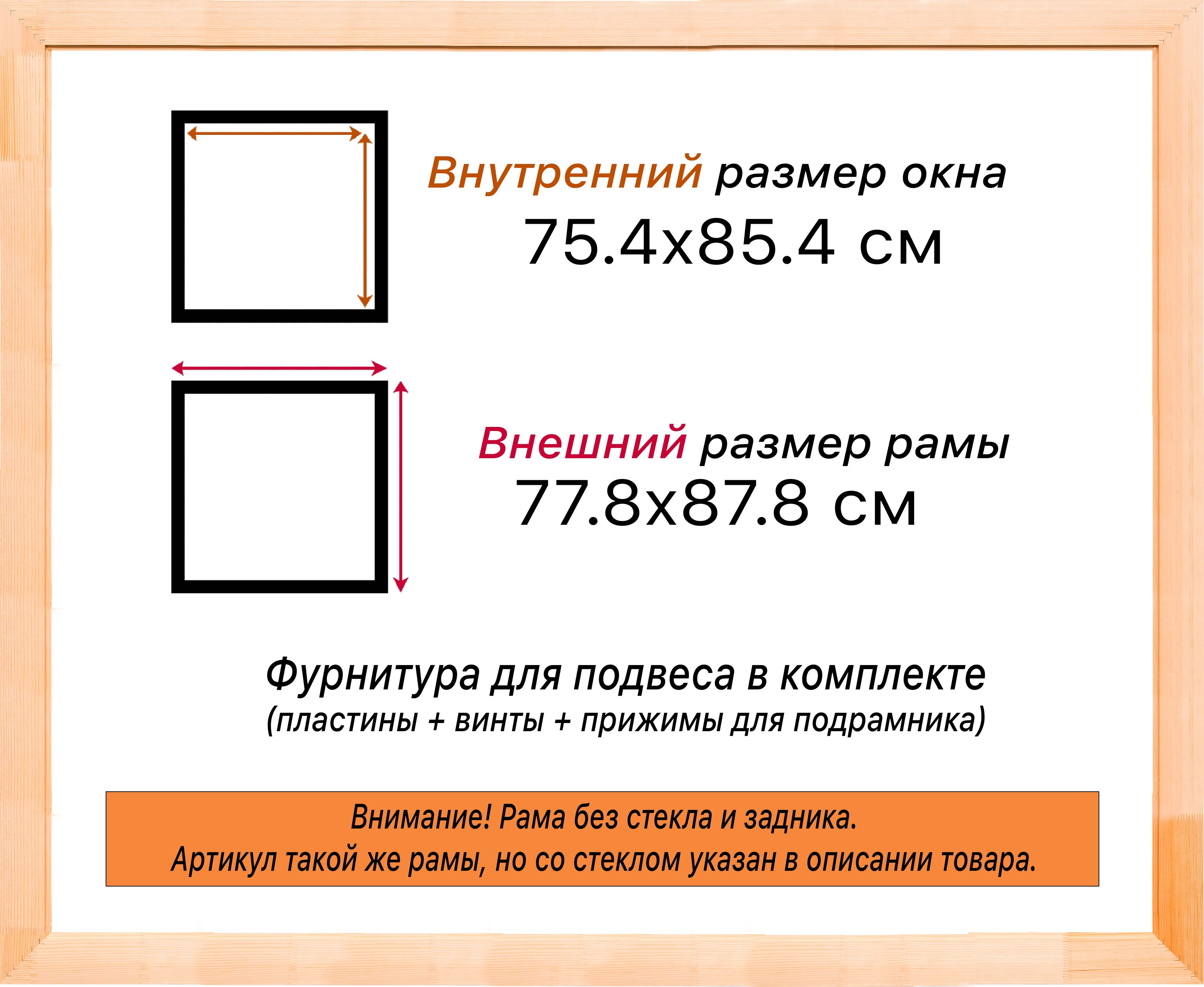 Рама изготовлена из древесины сосны 1 сорта. Подобный неокрашенный багет отлично подойдет для многих современных работ в разных стилях и жанрах. Но главная особенность данного багета в том, что его можно декорировать используя различные краски и лаки, такая рама будет в единственном экземпляре и уже являться эксклюзивным авторским творением. Рама выполнена из дерева (сосна), профиль шлифованный, неокрашенный. Указан внутренний размер окна рамы мм. (запас 2 мм с каждой стороны чтобы ваше изделие свободно поместилось). 1. Основные характеристики: - Размеры рамки: 75x85 (по размеру помещаемого изображения) - Габариты изделия: 80.2x90.2 см. - Цвет: не указан - Профиль: не указан - Сечение рамы: 24x15 мм - Ширина четверти: мм - Высота четверти: мм 2. Комплектация: - Подвесная пластина – 2 шт. - Прижимы для подрамника - Винты 3. Назначение: - Подходит для оформления: • Картин, включая картины по номерам • Алмазных мозаик и вышивок крестом • Постеров, фотографий, икон • Паспарту, зеркал • Вышивки бисером и алмазной мозаики • Медалей, орденов, спортивных наград • Старинных часов, ключей, монет или украшений - Используется как настенная или настольная фоторамка (нет подставки) 4. Преимущества: - Универсальность: квадратные и прямоугольные форматы, размеры от 10х10 до 100х100 см - Удобство: можно повесить горизонтально или вертикально - Широкий выбор: разные профили, расцветки, с опцией со стеклом или без - Идеальный подарок: для мамы, папы, бабушки, дедушки, друзей, коллег на день рождения, Новый год, 8 марта, 23 февраля, свадьбу, новоселье или любой другой праздник 5. Применение в интерьере: - Идеально для алмазной вышивки, мозаики, картин на подрамнике - Украшение дома: подходит для изображений цветов, живописи, портретов, натюрмортов, городских пейзажей, природы 6. Производство: - Страна: Россия, Санкт-Петербург - Качество: высококачественные материалы с вниманием к деталям