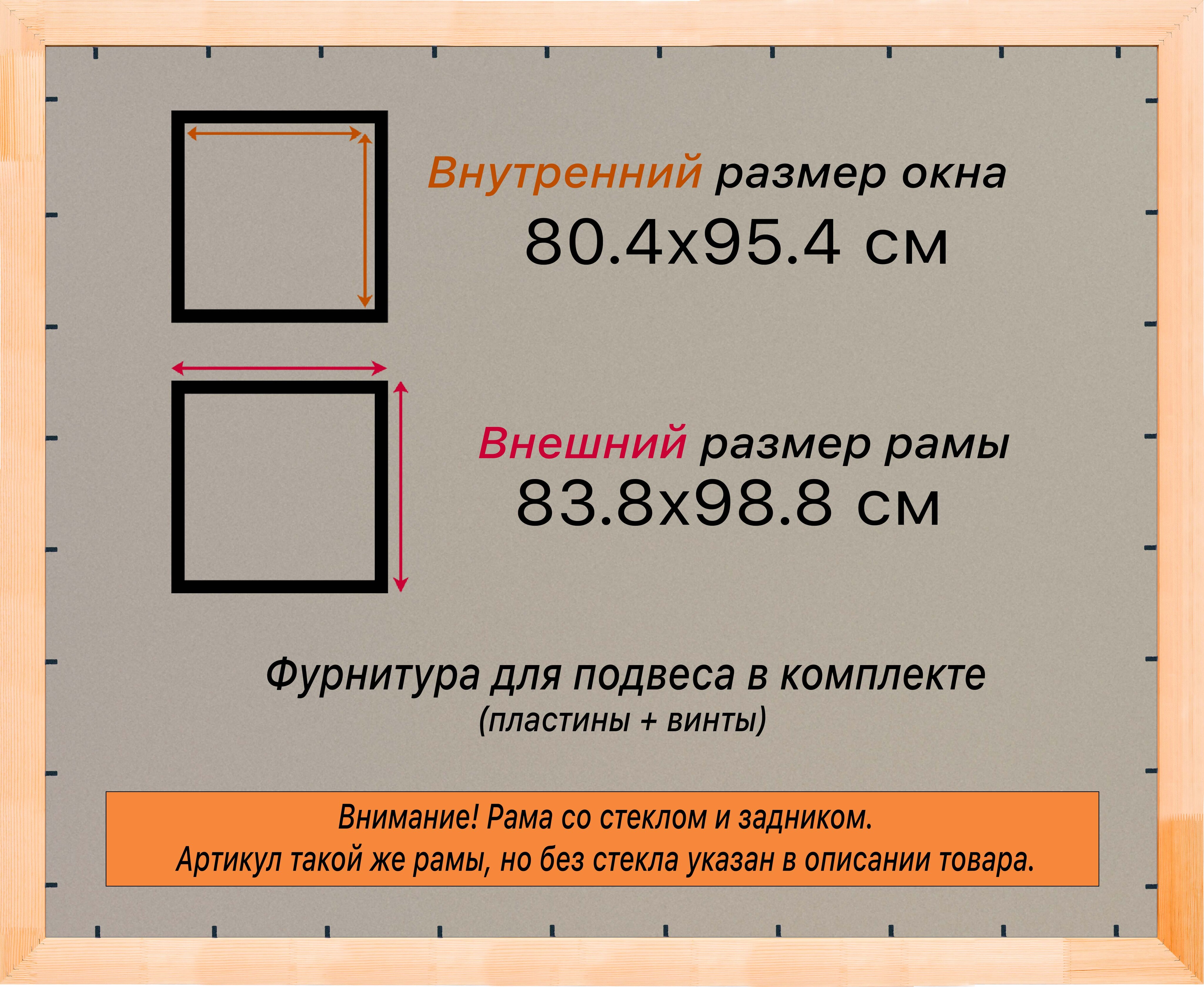 Рама изготовлена из древесины сосны 1 сорта. Подобный неокрашенный багет отлично подойдет для многих современных работ в разных стилях и жанрах. Но главная особенность данного багета в том, что его можно декорировать используя различные краски и лаки, такая рама будет в единственном экземпляре и уже являться эксклюзивным авторским творением. Рама выполнена из дерева (сосна), профиль шлифованный, неокрашенный. Указан внутренний размер окна рамы мм. (запас 2 мм с каждой стороны чтобы ваше изделие свободно поместилось). 1. Основные характеристики: - Размеры рамки: 80x95 (по размеру помещаемого изображения) - Габариты изделия: 84.2x99.2 см. - Цвет: не указан - Профиль: не указан - Сечение рамы: 19x30 мм - Ширина четверти: мм - Высота четверти: мм 2. Комплектация: - Стекло 2мм (обычное) - Задник - Подвесная пластина – 2 шт. - Винты - Прижимы для фиксации задника 3. Назначение: - Подходит для оформления: • Картин, включая картины по номерам • Алмазных мозаик и вышивок крестом • Постеров, фотографий, икон • Паспарту, зеркал • Вышивки бисером и алмазной мозаики • Медалей, орденов, спортивных наград • Старинных часов, ключей, монет или украшений - Используется как настенная или настольная фоторамка (нет подставки) 4. Преимущества: - Универсальность: квадратные и прямоугольные форматы, размеры от 10х10 до 100х100 см - Удобство: можно повесить горизонтально или вертикально - Широкий выбор: разные профили, расцветки, с опцией со стеклом или без - Идеальный подарок: для мамы, папы, бабушки, дедушки, друзей, коллег на день рождения, Новый год, 8 марта, 23 февраля, свадьбу, новоселье или любой другой праздник 5. Применение в интерьере: - Украшение дома: подходит для изображений цветов, живописи, портретов, натюрмортов, городских пейзажей, природы - Идеально для алмазной вышивки, мозаики, фотографий или постера 6. Производство: - Страна: Россия, Санкт-Петербург - Качество: высококачественные материалы с вниманием к деталям