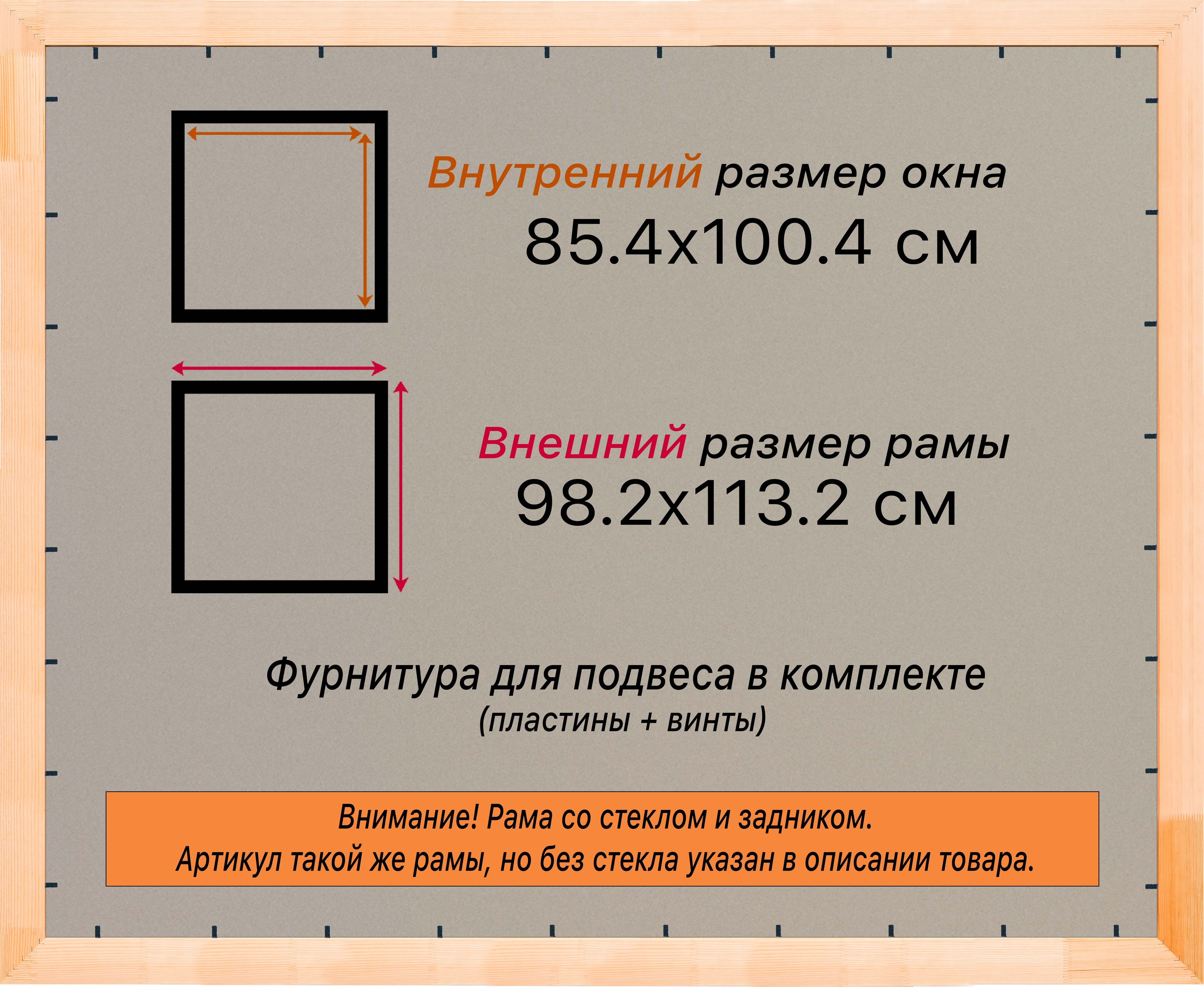 Рама изготовлена из древесины сосны 1 сорта. Подобный неокрашенный багет отлично подойдет для многих современных работ в разных стилях и жанрах. Но главная особенность данного багета в том, что его можно декорировать используя различные краски и лаки, такая рама будет в единственном экземпляре и уже являться эксклюзивным авторским творением. Рама выполнена из дерева (сосна), профиль шлифованный, неокрашенный. Указан внутренний размер окна рамы мм. (запас 2 мм с каждой стороны чтобы ваше изделие свободно поместилось). 1. Основные характеристики: - Размеры рамки: 85x100 (по размеру помещаемого изображения) - Габариты изделия: 99.6x114.6 см. - Цвет: не указан - Профиль: не указан - Сечение рамы: 71x28 мм - Ширина четверти: мм - Высота четверти: мм 2. Комплектация: - Стекло 2мм (обычное) - Задник - Подвесная пластина – 2 шт. - Винты - Прижимы для фиксации задника 3. Назначение: - Подходит для оформления: • Картин, включая картины по номерам • Алмазных мозаик и вышивок крестом • Постеров, фотографий, икон • Паспарту, зеркал • Вышивки бисером и алмазной мозаики • Медалей, орденов, спортивных наград • Старинных часов, ключей, монет или украшений - Используется как настенная или настольная фоторамка (нет подставки) 4. Преимущества: - Универсальность: квадратные и прямоугольные форматы, размеры от 10х10 до 100х100 см - Удобство: можно повесить горизонтально или вертикально - Широкий выбор: разные профили, расцветки, с опцией со стеклом или без - Идеальный подарок: для мамы, папы, бабушки, дедушки, друзей, коллег на день рождения, Новый год, 8 марта, 23 февраля, свадьбу, новоселье или любой другой праздник 5. Применение в интерьере: - Украшение дома: подходит для изображений цветов, живописи, портретов, натюрмортов, городских пейзажей, природы - Идеально для алмазной вышивки, мозаики, фотографий или постера 6. Производство: - Страна: Россия, Санкт-Петербург - Качество: высококачественные материалы с вниманием к деталям