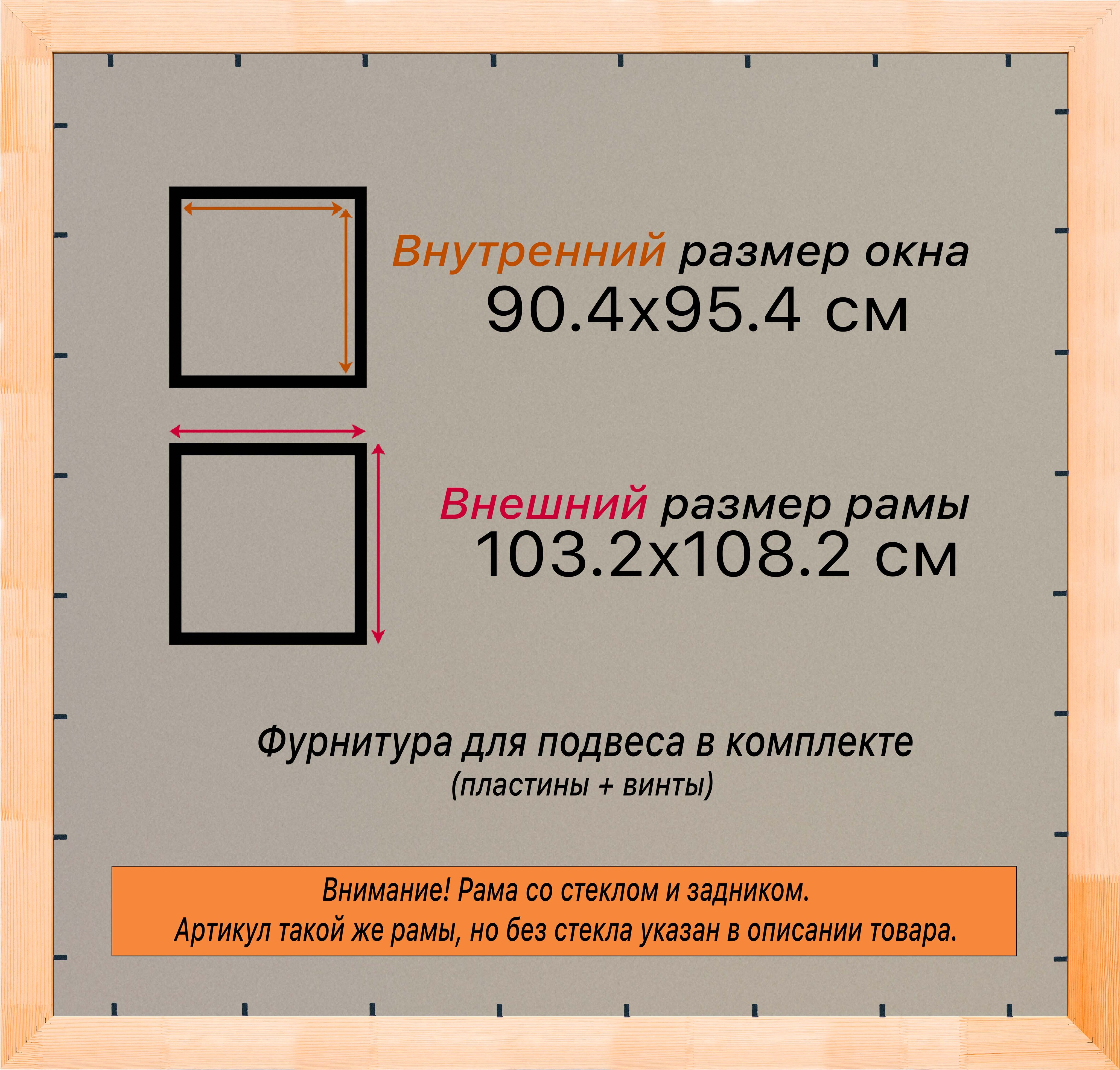 Рама изготовлена из древесины сосны 1 сорта. Подобный неокрашенный багет отлично подойдет для многих современных работ в разных стилях и жанрах. Но главная особенность данного багета в том, что его можно декорировать используя различные краски и лаки, такая рама будет в единственном экземпляре и уже являться эксклюзивным авторским творением. Рама выполнена из дерева (сосна), профиль шлифованный, неокрашенный. Указан внутренний размер окна рамы мм. (запас 2 мм с каждой стороны чтобы ваше изделие свободно поместилось). 1. Основные характеристики: - Размеры рамки: 90x95 (по размеру помещаемого изображения) - Габариты изделия: 104.6x109.6 см. - Цвет: не указан - Профиль: не указан - Сечение рамы: 71x28 мм - Ширина четверти: мм - Высота четверти: мм 2. Комплектация: - Стекло 2мм (обычное) - Задник - Подвесная пластина – 2 шт. - Винты - Прижимы для фиксации задника 3. Назначение: - Подходит для оформления: • Картин, включая картины по номерам • Алмазных мозаик и вышивок крестом • Постеров, фотографий, икон • Паспарту, зеркал • Вышивки бисером и алмазной мозаики • Медалей, орденов, спортивных наград • Старинных часов, ключей, монет или украшений - Используется как настенная или настольная фоторамка (нет подставки) 4. Преимущества: - Универсальность: квадратные и прямоугольные форматы, размеры от 10х10 до 100х100 см - Удобство: можно повесить горизонтально или вертикально - Широкий выбор: разные профили, расцветки, с опцией со стеклом или без - Идеальный подарок: для мамы, папы, бабушки, дедушки, друзей, коллег на день рождения, Новый год, 8 марта, 23 февраля, свадьбу, новоселье или любой другой праздник 5. Применение в интерьере: - Украшение дома: подходит для изображений цветов, живописи, портретов, натюрмортов, городских пейзажей, природы - Идеально для алмазной вышивки, мозаики, фотографий или постера 6. Производство: - Страна: Россия, Санкт-Петербург - Качество: высококачественные материалы с вниманием к деталям