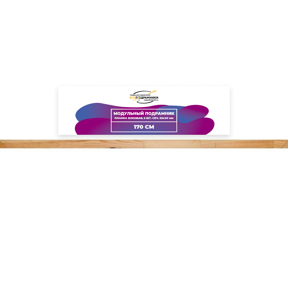 КОМПЛЕКТАЦИЯ • Боковые планки продаются парой (2 шт.) • Для сборки подрамника требуется минимум 2 пары: – 1 пара одного размера – 1 пара другого размера ПРИМЕР СБОРКИ • Планка 50 см (2 шт., сечение 55×20 мм) • Планка 70 см (2 шт., сечение 55×20 мм) В итоге получится подрамник размером 50×70 см ОСОБЕННОСТИ • Планки из древесины сосны 1 сорта • Сечение: 55×18 мм • Все планки можно компоновать между собой • Возможные размеры подрамников: от 15×15 см до 200×200 см ПЕРЕКЛАДИНЫ (СРЕДНИЕ ПЛАНКИ) • Продаются поштучно • Пазы в боковых планках: – До 70 см — без пазов – 70–130 см — 1 паз – 140–180 см — 2 паза – 190–200 см — 3 паза КЛИНЬЯ • Продаются наборами: 8, 10, 12 и 14 шт. ГДЕ НАЙТИ Все наши товары легко найти — кликните на название бренда в карточке товара