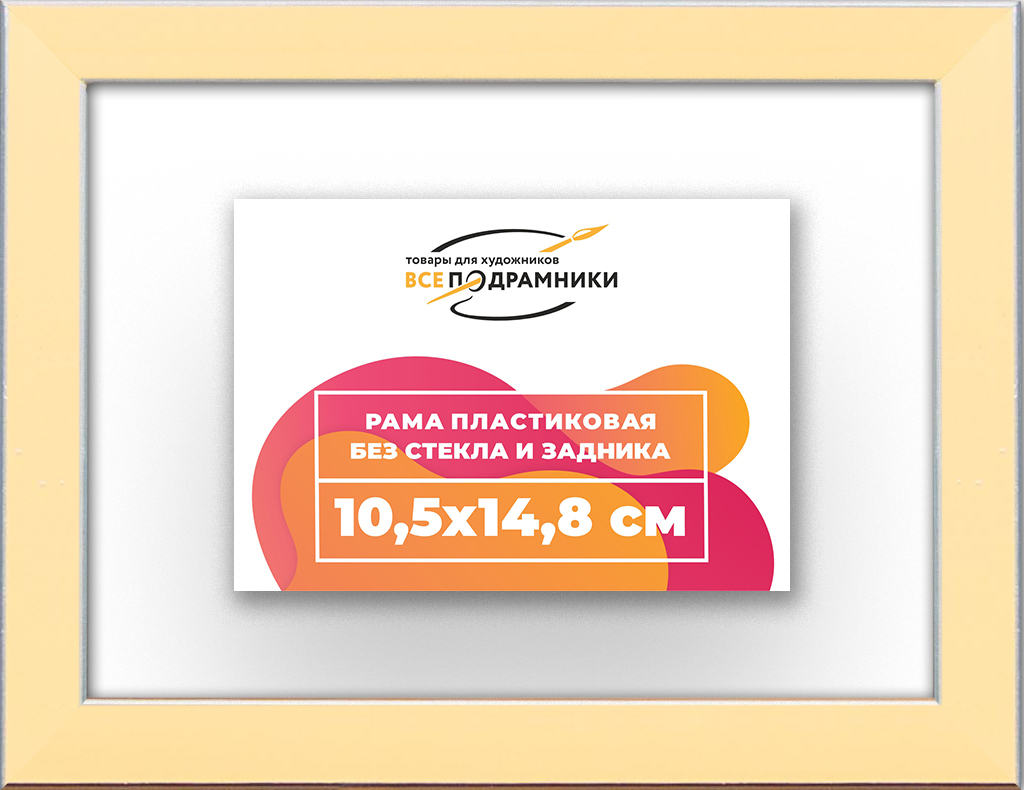 Пластиковая рама 10,5x14,8 без стекла и задника Пластиковая рама без стекла и задника изготовлена из безопасного и экологически чистого первичного полистирола высшей категории. Производитель: “ВсеПодрамники”. Для удобства установки к стандартному размеру добавлено 4 мм (по 2 мм с каждой стороны), чтобы ваше изделие легко поместилось в раму. 1. Основные характеристики: - Размеры рамки: 10,5x14,8 (по размеру помещаемого изображения) - Габариты изделия: 12.7x17.0 см. - Цвет: желтый - Профиль: классический - Сечение рамы: 16x16 мм - Ширина четверти: 7 мм - Высота четверти: 10 мм 2. Комплектация: - Подвесная пластина – 2 шт. - Прижимы для подрамника - Винты 3. Назначение: - Подходит для оформления: • Картин, включая картины по номерам • Алмазных мозаик и вышивок крестом • Постеров, фотографий, икон • Паспарту, зеркал • Вышивки бисером и алмазной мозаики • Медалей, орденов, спортивных наград • Старинных часов, ключей, монет или украшений - Используется как настенная или настольная фоторамка (нет подставки) 4. Преимущества: - Универсальность: квадратные и прямоугольные форматы, размеры от 10х10 до 100х100 см - Удобство: можно повесить горизонтально или вертикально - Широкий выбор: разные профили, расцветки, с опцией со стеклом или без - Идеальный подарок: для мамы, папы, бабушки, дедушки, друзей, коллег на день рождения, Новый год, 8 марта, 23 февраля, свадьбу, новоселье или любой другой праздник 5. Применение в интерьере: - Идеально для алмазной вышивки, мозаики, картин на подрамнике - Украшение дома: подходит для изображений цветов, живописи, портретов, натюрмортов, городских пейзажей, природы 6. Производство: - Страна: Россия, Санкт-Петербург - Качество: высококачественные материалы с вниманием к деталям