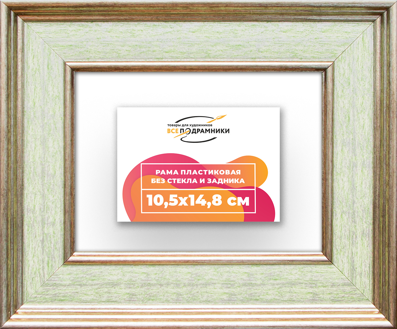 Пластиковая рама 10,5x14,8 без стекла и задника Пластиковая рама без стекла и задника изготовлена из безопасного и экологически чистого первичного полистирола высшей категории. Производитель: “ВсеПодрамники”. Для удобства установки к стандартному размеру добавлено 4 мм (по 2 мм с каждой стороны), чтобы ваше изделие легко поместилось в раму. 1. Основные характеристики: - Размеры рамки: 10,5x14,8 (по размеру помещаемого изображения) - Габариты изделия: 19.5x23.8 см. - Цвет: зеленый - Профиль: классический - Сечение рамы: 50x30 мм - Ширина четверти: 7 мм - Высота четверти: 10 мм 2. Комплектация: - Подвесная пластина – 2 шт. - Прижимы для подрамника - Винты 3. Назначение: - Подходит для оформления: • Картин, включая картины по номерам • Алмазных мозаик и вышивок крестом • Постеров, фотографий, икон • Паспарту, зеркал • Вышивки бисером и алмазной мозаики • Медалей, орденов, спортивных наград • Старинных часов, ключей, монет или украшений - Используется как настенная или настольная фоторамка (нет подставки) 4. Преимущества: - Универсальность: квадратные и прямоугольные форматы, размеры от 10х10 до 100х100 см - Удобство: можно повесить горизонтально или вертикально - Широкий выбор: разные профили, расцветки, с опцией со стеклом или без - Идеальный подарок: для мамы, папы, бабушки, дедушки, друзей, коллег на день рождения, Новый год, 8 марта, 23 февраля, свадьбу, новоселье или любой другой праздник 5. Применение в интерьере: - Идеально для алмазной вышивки, мозаики, картин на подрамнике - Украшение дома: подходит для изображений цветов, живописи, портретов, натюрмортов, городских пейзажей, природы 6. Производство: - Страна: Россия, Санкт-Петербург - Качество: высококачественные материалы с вниманием к деталям