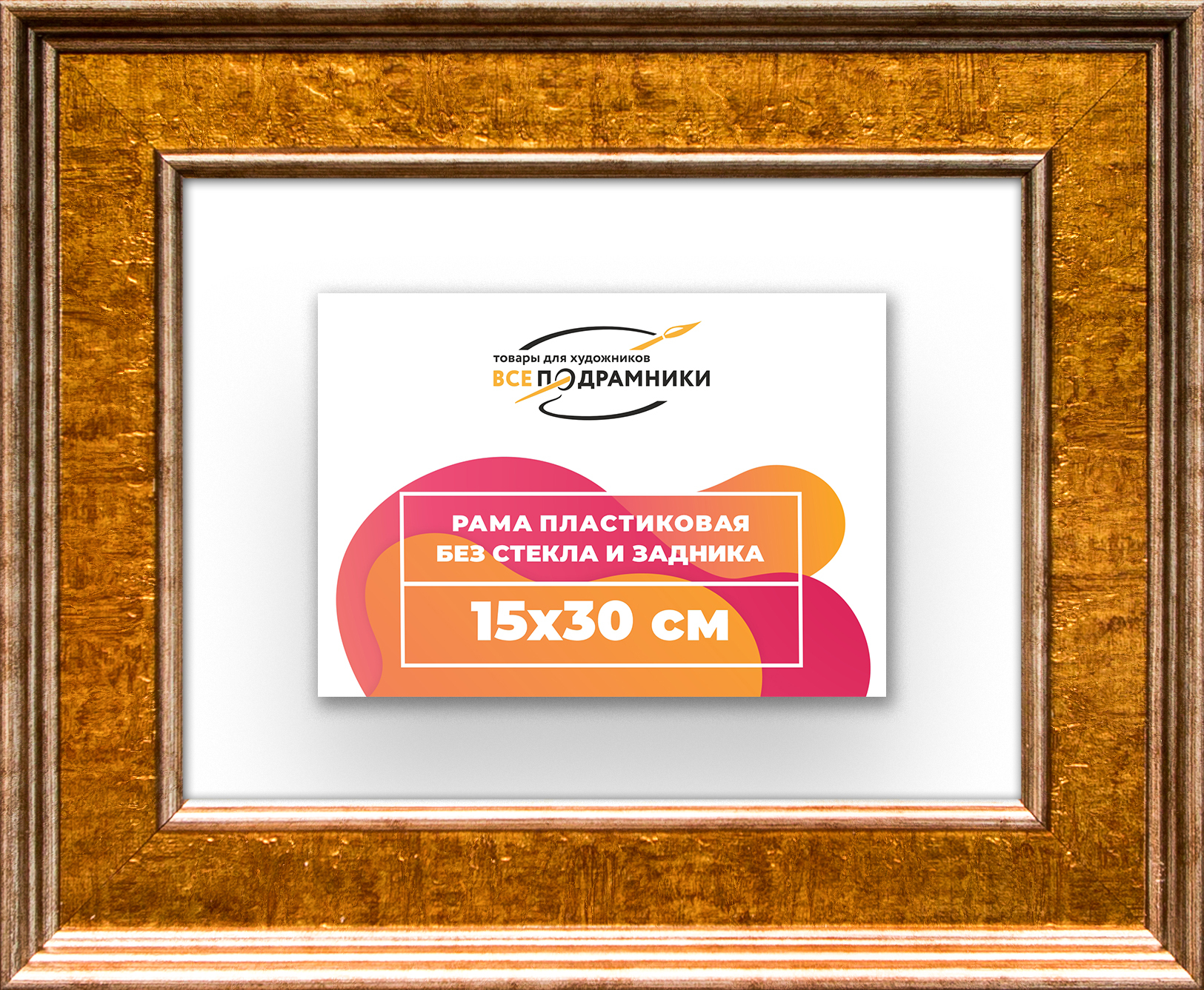 Пластиковая рама 15x30 без стекла и задника Пластиковая рама без стекла и задника изготовлена из безопасного и экологически чистого первичного полистирола высшей категории. Производитель: “ВсеПодрамники”. Для удобства установки к стандартному размеру добавлено 4 мм (по 2 мм с каждой стороны), чтобы ваше изделие легко поместилось в раму. 1. Основные характеристики: - Размеры рамки: 15x30 (по размеру помещаемого изображения) - Габариты изделия: 24.0x39.0 см. - Цвет: золотистый - Профиль: классический - Сечение рамы: 50x30 мм - Ширина четверти: 7 мм - Высота четверти: 10 мм 2. Комплектация: - Подвесная пластина – 2 шт. - Прижимы для подрамника - Винты 3. Назначение: - Подходит для оформления: • Картин, включая картины по номерам • Алмазных мозаик и вышивок крестом • Постеров, фотографий, икон • Паспарту, зеркал • Вышивки бисером и алмазной мозаики • Медалей, орденов, спортивных наград • Старинных часов, ключей, монет или украшений - Используется как настенная или настольная фоторамка (нет подставки) 4. Преимущества: - Универсальность: квадратные и прямоугольные форматы, размеры от 10х10 до 100х100 см - Удобство: можно повесить горизонтально или вертикально - Широкий выбор: разные профили, расцветки, с опцией со стеклом или без - Идеальный подарок: для мамы, папы, бабушки, дедушки, друзей, коллег на день рождения, Новый год, 8 марта, 23 февраля, свадьбу, новоселье или любой другой праздник 5. Применение в интерьере: - Идеально для алмазной вышивки, мозаики, картин на подрамнике - Украшение дома: подходит для изображений цветов, живописи, портретов, натюрмортов, городских пейзажей, природы 6. Производство: - Страна: Россия, Санкт-Петербург - Качество: высококачественные материалы с вниманием к деталям
