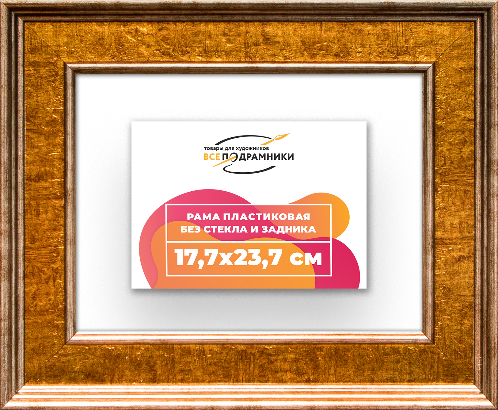 Пластиковая рама 17,7x23,7 без стекла и задника Пластиковая рама без стекла и задника изготовлена из безопасного и экологически чистого первичного полистирола высшей категории. Производитель: “ВсеПодрамники”. Для удобства установки к стандартному размеру добавлено 4 мм (по 2 мм с каждой стороны), чтобы ваше изделие легко поместилось в раму. 1. Основные характеристики: - Размеры рамки: 17,7x23,7 (по размеру помещаемого изображения) - Габариты изделия: 26.7x32.7 см. - Цвет: золотистый - Профиль: классический - Сечение рамы: 50x30 мм - Ширина четверти: 7 мм - Высота четверти: 10 мм 2. Комплектация: - Подвесная пластина – 2 шт. - Прижимы для подрамника - Винты 3. Назначение: - Подходит для оформления: • Картин, включая картины по номерам • Алмазных мозаик и вышивок крестом • Постеров, фотографий, икон • Паспарту, зеркал • Вышивки бисером и алмазной мозаики • Медалей, орденов, спортивных наград • Старинных часов, ключей, монет или украшений - Используется как настенная или настольная фоторамка (нет подставки) 4. Преимущества: - Универсальность: квадратные и прямоугольные форматы, размеры от 10х10 до 100х100 см - Удобство: можно повесить горизонтально или вертикально - Широкий выбор: разные профили, расцветки, с опцией со стеклом или без - Идеальный подарок: для мамы, папы, бабушки, дедушки, друзей, коллег на день рождения, Новый год, 8 марта, 23 февраля, свадьбу, новоселье или любой другой праздник 5. Применение в интерьере: - Идеально для алмазной вышивки, мозаики, картин на подрамнике - Украшение дома: подходит для изображений цветов, живописи, портретов, натюрмортов, городских пейзажей, природы 6. Производство: - Страна: Россия, Санкт-Петербург - Качество: высококачественные материалы с вниманием к деталям