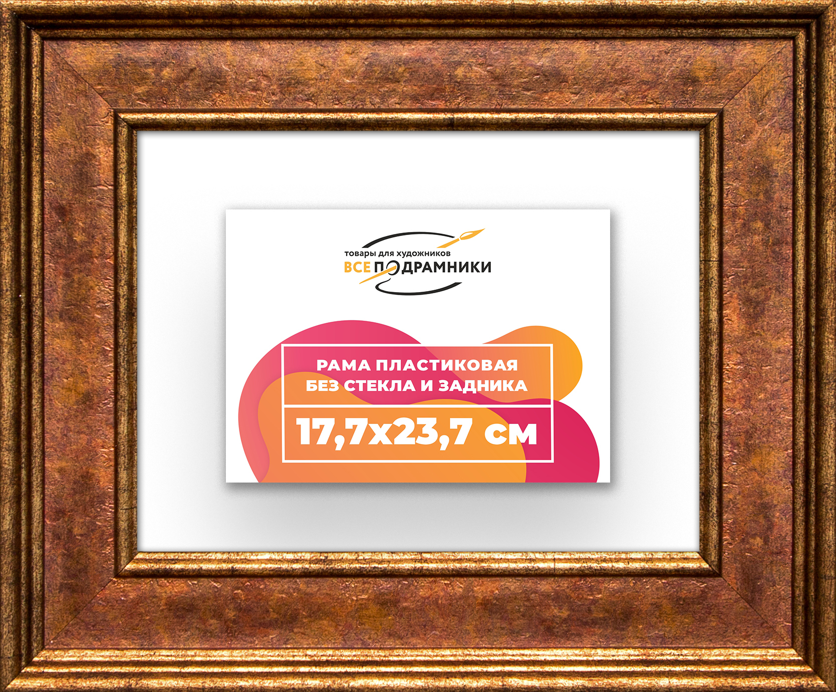 Пластиковая рама 17,7x23,7 без стекла и задника Пластиковая рама без стекла и задника изготовлена из безопасного и экологически чистого первичного полистирола высшей категории. Производитель: “ВсеПодрамники”. Для удобства установки к стандартному размеру добавлено 4 мм (по 2 мм с каждой стороны), чтобы ваше изделие легко поместилось в раму. 1. Основные характеристики: - Размеры рамки: 17,7x23,7 (по размеру помещаемого изображения) - Габариты изделия: 26.7x32.7 см. - Цвет: коричневый - Профиль: классический - Сечение рамы: 50x30 мм - Ширина четверти: 7 мм - Высота четверти: 10 мм 2. Комплектация: - Подвесная пластина – 2 шт. - Прижимы для подрамника - Винты 3. Назначение: - Подходит для оформления: • Картин, включая картины по номерам • Алмазных мозаик и вышивок крестом • Постеров, фотографий, икон • Паспарту, зеркал • Вышивки бисером и алмазной мозаики • Медалей, орденов, спортивных наград • Старинных часов, ключей, монет или украшений - Используется как настенная или настольная фоторамка (нет подставки) 4. Преимущества: - Универсальность: квадратные и прямоугольные форматы, размеры от 10х10 до 100х100 см - Удобство: можно повесить горизонтально или вертикально - Широкий выбор: разные профили, расцветки, с опцией со стеклом или без - Идеальный подарок: для мамы, папы, бабушки, дедушки, друзей, коллег на день рождения, Новый год, 8 марта, 23 февраля, свадьбу, новоселье или любой другой праздник 5. Применение в интерьере: - Идеально для алмазной вышивки, мозаики, картин на подрамнике - Украшение дома: подходит для изображений цветов, живописи, портретов, натюрмортов, городских пейзажей, природы 6. Производство: - Страна: Россия, Санкт-Петербург - Качество: высококачественные материалы с вниманием к деталям