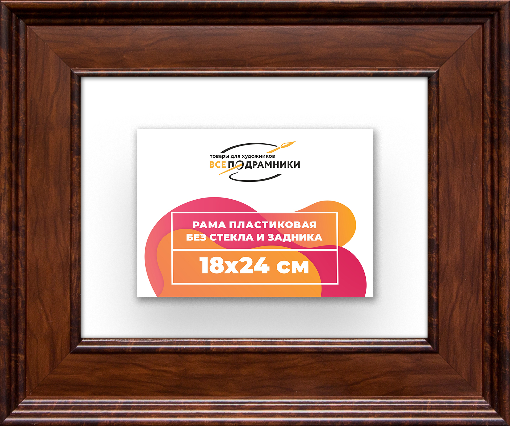 Пластиковая рама 18x24 без стекла и задника Пластиковая рама без стекла и задника изготовлена из безопасного и экологически чистого первичного полистирола высшей категории. Производитель: “ВсеПодрамники”. Для удобства установки к стандартному размеру добавлено 4 мм (по 2 мм с каждой стороны), чтобы ваше изделие легко поместилось в раму. 1. Основные характеристики: - Размеры рамки: 18x24 (по размеру помещаемого изображения) - Габариты изделия: 27.0x33.0 см. - Цвет: коричневый - Профиль: классический - Сечение рамы: 50x30 мм - Ширина четверти: 7 мм - Высота четверти: 10 мм 2. Комплектация: - Подвесная пластина – 2 шт. - Прижимы для подрамника - Винты 3. Назначение: - Подходит для оформления: • Картин, включая картины по номерам • Алмазных мозаик и вышивок крестом • Постеров, фотографий, икон • Паспарту, зеркал • Вышивки бисером и алмазной мозаики • Медалей, орденов, спортивных наград • Старинных часов, ключей, монет или украшений - Используется как настенная или настольная фоторамка (нет подставки) 4. Преимущества: - Универсальность: квадратные и прямоугольные форматы, размеры от 10х10 до 100х100 см - Удобство: можно повесить горизонтально или вертикально - Широкий выбор: разные профили, расцветки, с опцией со стеклом или без - Идеальный подарок: для мамы, папы, бабушки, дедушки, друзей, коллег на день рождения, Новый год, 8 марта, 23 февраля, свадьбу, новоселье или любой другой праздник 5. Применение в интерьере: - Идеально для алмазной вышивки, мозаики, картин на подрамнике - Украшение дома: подходит для изображений цветов, живописи, портретов, натюрмортов, городских пейзажей, природы 6. Производство: - Страна: Россия, Санкт-Петербург - Качество: высококачественные материалы с вниманием к деталям