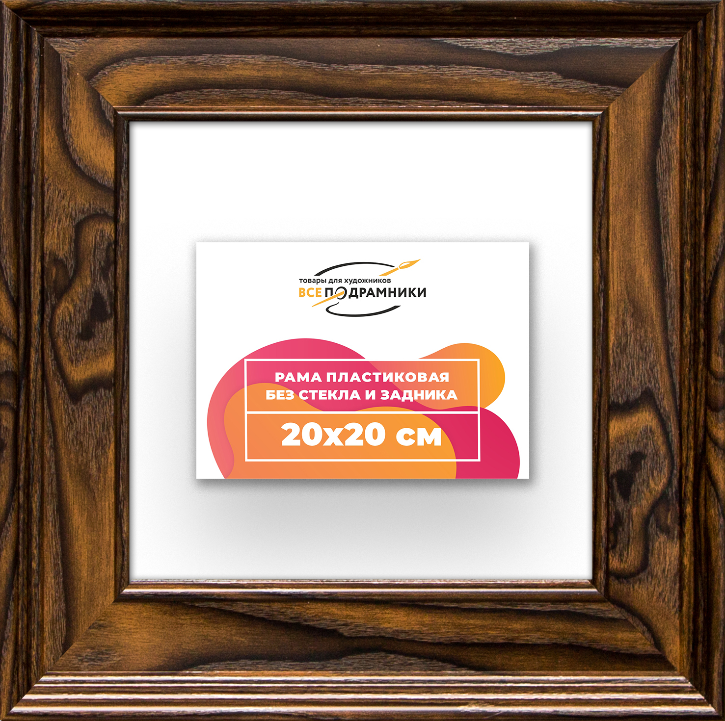Пластиковая рама 20x20 без стекла и задника Пластиковая рама без стекла и задника изготовлена из безопасного и экологически чистого первичного полистирола высшей категории. Производитель: “ВсеПодрамники”. Для удобства установки к стандартному размеру добавлено 4 мм (по 2 мм с каждой стороны), чтобы ваше изделие легко поместилось в раму. 1. Основные характеристики: - Размеры рамки: 20x20 (по размеру помещаемого изображения) - Габариты изделия: 29.0x29.0 см. - Цвет: коричневый - Профиль: классический - Сечение рамы: 50x30 мм - Ширина четверти: 7 мм - Высота четверти: 10 мм 2. Комплектация: - Подвесная пластина – 2 шт. - Прижимы для подрамника - Винты 3. Назначение: - Подходит для оформления: • Картин, включая картины по номерам • Алмазных мозаик и вышивок крестом • Постеров, фотографий, икон • Паспарту, зеркал • Вышивки бисером и алмазной мозаики • Медалей, орденов, спортивных наград • Старинных часов, ключей, монет или украшений - Используется как настенная или настольная фоторамка (нет подставки) 4. Преимущества: - Универсальность: квадратные и прямоугольные форматы, размеры от 10х10 до 100х100 см - Удобство: можно повесить горизонтально или вертикально - Широкий выбор: разные профили, расцветки, с опцией со стеклом или без - Идеальный подарок: для мамы, папы, бабушки, дедушки, друзей, коллег на день рождения, Новый год, 8 марта, 23 февраля, свадьбу, новоселье или любой другой праздник 5. Применение в интерьере: - Идеально для алмазной вышивки, мозаики, картин на подрамнике - Украшение дома: подходит для изображений цветов, живописи, портретов, натюрмортов, городских пейзажей, природы 6. Производство: - Страна: Россия, Санкт-Петербург - Качество: высококачественные материалы с вниманием к деталям