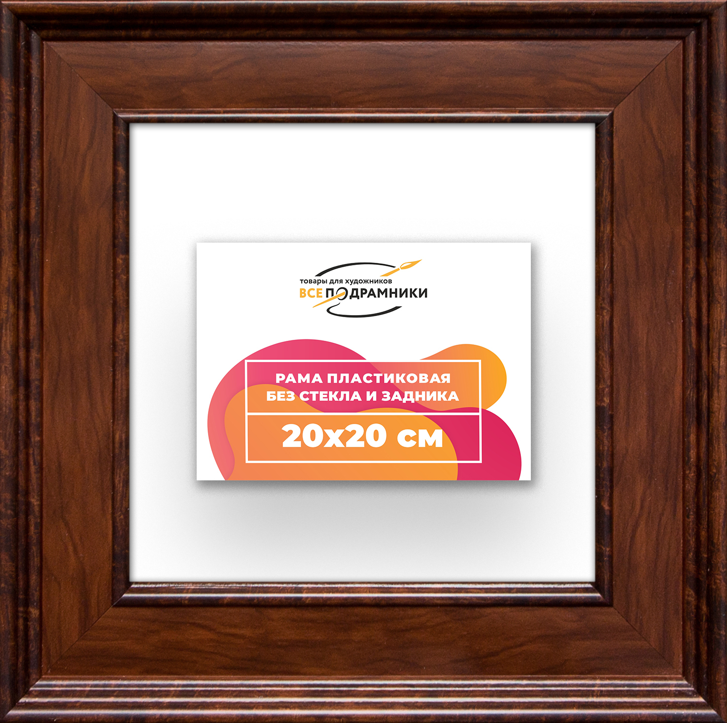 Пластиковая рама 20x20 без стекла и задника Пластиковая рама без стекла и задника изготовлена из безопасного и экологически чистого первичного полистирола высшей категории. Производитель: “ВсеПодрамники”. Для удобства установки к стандартному размеру добавлено 4 мм (по 2 мм с каждой стороны), чтобы ваше изделие легко поместилось в раму. 1. Основные характеристики: - Размеры рамки: 20x20 (по размеру помещаемого изображения) - Габариты изделия: 29.0x29.0 см. - Цвет: коричневый - Профиль: классический - Сечение рамы: 50x30 мм - Ширина четверти: 7 мм - Высота четверти: 10 мм 2. Комплектация: - Подвесная пластина – 2 шт. - Прижимы для подрамника - Винты 3. Назначение: - Подходит для оформления: • Картин, включая картины по номерам • Алмазных мозаик и вышивок крестом • Постеров, фотографий, икон • Паспарту, зеркал • Вышивки бисером и алмазной мозаики • Медалей, орденов, спортивных наград • Старинных часов, ключей, монет или украшений - Используется как настенная или настольная фоторамка (нет подставки) 4. Преимущества: - Универсальность: квадратные и прямоугольные форматы, размеры от 10х10 до 100х100 см - Удобство: можно повесить горизонтально или вертикально - Широкий выбор: разные профили, расцветки, с опцией со стеклом или без - Идеальный подарок: для мамы, папы, бабушки, дедушки, друзей, коллег на день рождения, Новый год, 8 марта, 23 февраля, свадьбу, новоселье или любой другой праздник 5. Применение в интерьере: - Идеально для алмазной вышивки, мозаики, картин на подрамнике - Украшение дома: подходит для изображений цветов, живописи, портретов, натюрмортов, городских пейзажей, природы 6. Производство: - Страна: Россия, Санкт-Петербург - Качество: высококачественные материалы с вниманием к деталям