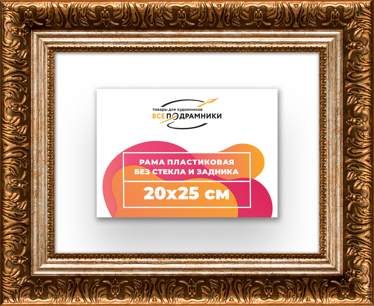 Пластиковая рама 20x25 без стекла и задника Пластиковая рама без стекла и задника изготовлена из безопасного и экологически чистого первичного полистирола высшей категории. Производитель: “ВсеПодрамники”. Для удобства установки к стандартному размеру добавлено 4 мм (по 2 мм с каждой стороны), чтобы ваше изделие легко поместилось в раму. 1. Основные характеристики: - Размеры рамки: 20x25 (по размеру помещаемого изображения) - Габариты изделия: 30.0x35.0 см. - Цвет: золотистый - Профиль: классический - Сечение рамы: 55x36 мм - Ширина четверти: 7 мм - Высота четверти: 10 мм 2. Комплектация: - Подвесная пластина – 2 шт. - Прижимы для подрамника - Винты 3. Назначение: - Подходит для оформления: • Картин, включая картины по номерам • Алмазных мозаик и вышивок крестом • Постеров, фотографий, икон • Паспарту, зеркал • Вышивки бисером и алмазной мозаики • Медалей, орденов, спортивных наград • Старинных часов, ключей, монет или украшений - Используется как настенная или настольная фоторамка (нет подставки) 4. Преимущества: - Универсальность: квадратные и прямоугольные форматы, размеры от 10х10 до 100х100 см - Удобство: можно повесить горизонтально или вертикально - Широкий выбор: разные профили, расцветки, с опцией со стеклом или без - Идеальный подарок: для мамы, папы, бабушки, дедушки, друзей, коллег на день рождения, Новый год, 8 марта, 23 февраля, свадьбу, новоселье или любой другой праздник 5. Применение в интерьере: - Идеально для алмазной вышивки, мозаики, картин на подрамнике - Украшение дома: подходит для изображений цветов, живописи, портретов, натюрмортов, городских пейзажей, природы 6. Производство: - Страна: Россия, Санкт-Петербург - Качество: высококачественные материалы с вниманием к деталям