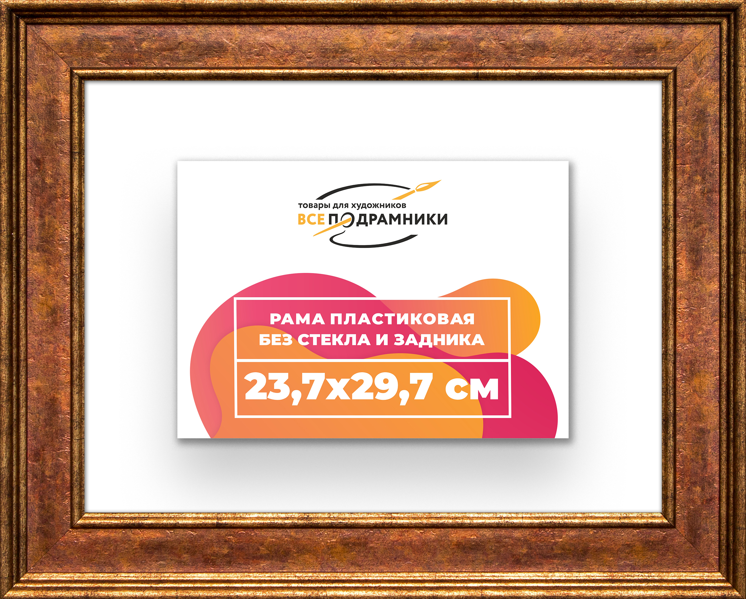 Пластиковая рама 23,7x29,7 без стекла и задника Пластиковая рама без стекла и задника изготовлена из безопасного и экологически чистого первичного полистирола высшей категории. Производитель: “ВсеПодрамники”. Для удобства установки к стандартному размеру добавлено 4 мм (по 2 мм с каждой стороны), чтобы ваше изделие легко поместилось в раму. 1. Основные характеристики: - Размеры рамки: 23,7x29,7 (по размеру помещаемого изображения) - Габариты изделия: 32.7x38.7 см. - Цвет: коричневый - Профиль: классический - Сечение рамы: 50x30 мм - Ширина четверти: 7 мм - Высота четверти: 10 мм 2. Комплектация: - Подвесная пластина – 2 шт. - Прижимы для подрамника - Винты 3. Назначение: - Подходит для оформления: • Картин, включая картины по номерам • Алмазных мозаик и вышивок крестом • Постеров, фотографий, икон • Паспарту, зеркал • Вышивки бисером и алмазной мозаики • Медалей, орденов, спортивных наград • Старинных часов, ключей, монет или украшений - Используется как настенная или настольная фоторамка (нет подставки) 4. Преимущества: - Универсальность: квадратные и прямоугольные форматы, размеры от 10х10 до 100х100 см - Удобство: можно повесить горизонтально или вертикально - Широкий выбор: разные профили, расцветки, с опцией со стеклом или без - Идеальный подарок: для мамы, папы, бабушки, дедушки, друзей, коллег на день рождения, Новый год, 8 марта, 23 февраля, свадьбу, новоселье или любой другой праздник 5. Применение в интерьере: - Идеально для алмазной вышивки, мозаики, картин на подрамнике - Украшение дома: подходит для изображений цветов, живописи, портретов, натюрмортов, городских пейзажей, природы 6. Производство: - Страна: Россия, Санкт-Петербург - Качество: высококачественные материалы с вниманием к деталям