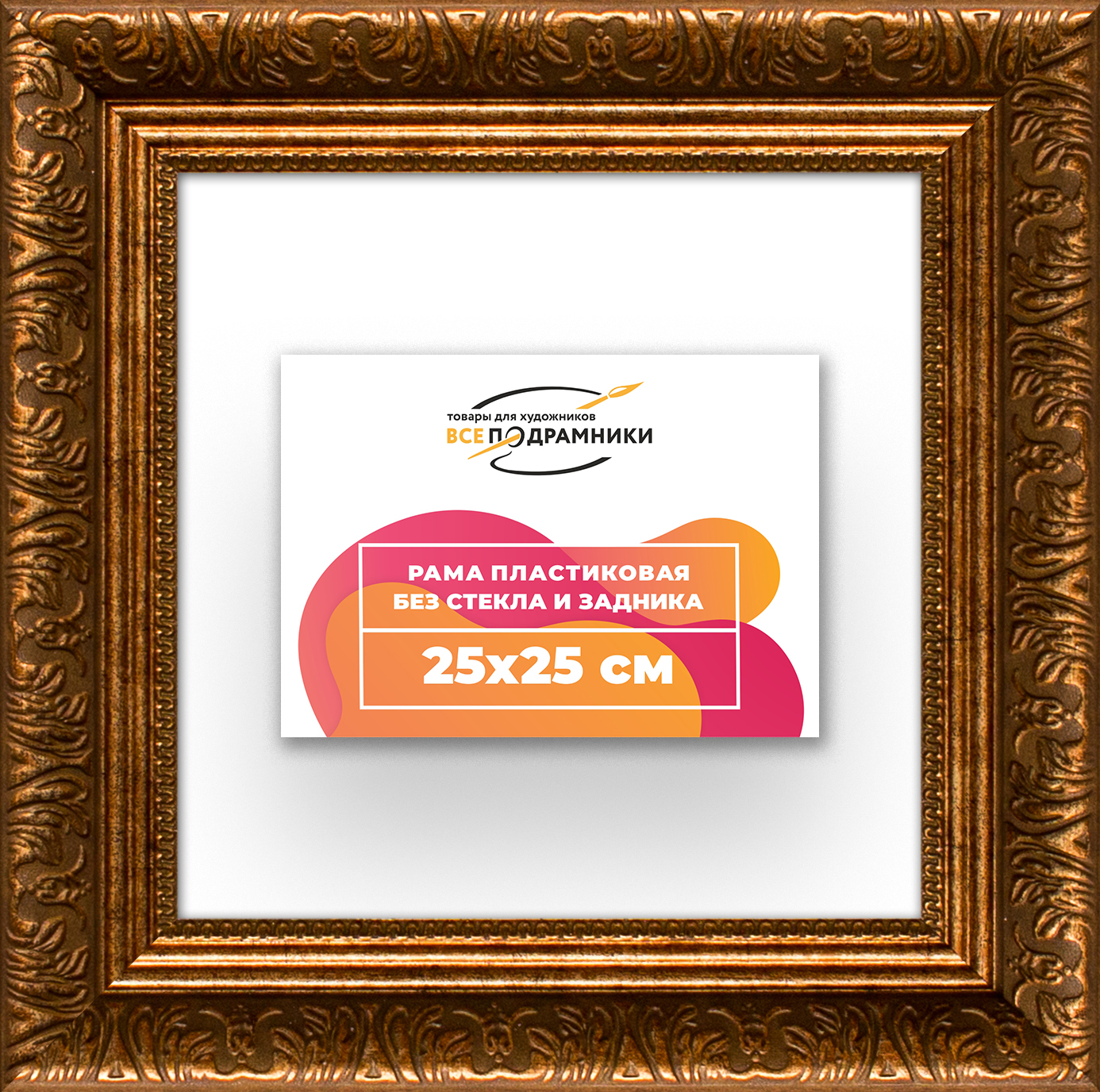 Пластиковая рама 25x25 без стекла и задника Пластиковая рама без стекла и задника изготовлена из безопасного и экологически чистого первичного полистирола высшей категории. Производитель: “ВсеПодрамники”. Для удобства установки к стандартному размеру добавлено 4 мм (по 2 мм с каждой стороны), чтобы ваше изделие легко поместилось в раму. 1. Основные характеристики: - Размеры рамки: 25x25 (по размеру помещаемого изображения) - Габариты изделия: 35.0x35.0 см. - Цвет: коричневый - Профиль: классический - Сечение рамы: 55x36 мм - Ширина четверти: 7 мм - Высота четверти: 10 мм 2. Комплектация: - Подвесная пластина – 2 шт. - Прижимы для подрамника - Винты 3. Назначение: - Подходит для оформления: • Картин, включая картины по номерам • Алмазных мозаик и вышивок крестом • Постеров, фотографий, икон • Паспарту, зеркал • Вышивки бисером и алмазной мозаики • Медалей, орденов, спортивных наград • Старинных часов, ключей, монет или украшений - Используется как настенная или настольная фоторамка (нет подставки) 4. Преимущества: - Универсальность: квадратные и прямоугольные форматы, размеры от 10х10 до 100х100 см - Удобство: можно повесить горизонтально или вертикально - Широкий выбор: разные профили, расцветки, с опцией со стеклом или без - Идеальный подарок: для мамы, папы, бабушки, дедушки, друзей, коллег на день рождения, Новый год, 8 марта, 23 февраля, свадьбу, новоселье или любой другой праздник 5. Применение в интерьере: - Идеально для алмазной вышивки, мозаики, картин на подрамнике - Украшение дома: подходит для изображений цветов, живописи, портретов, натюрмортов, городских пейзажей, природы 6. Производство: - Страна: Россия, Санкт-Петербург - Качество: высококачественные материалы с вниманием к деталям
