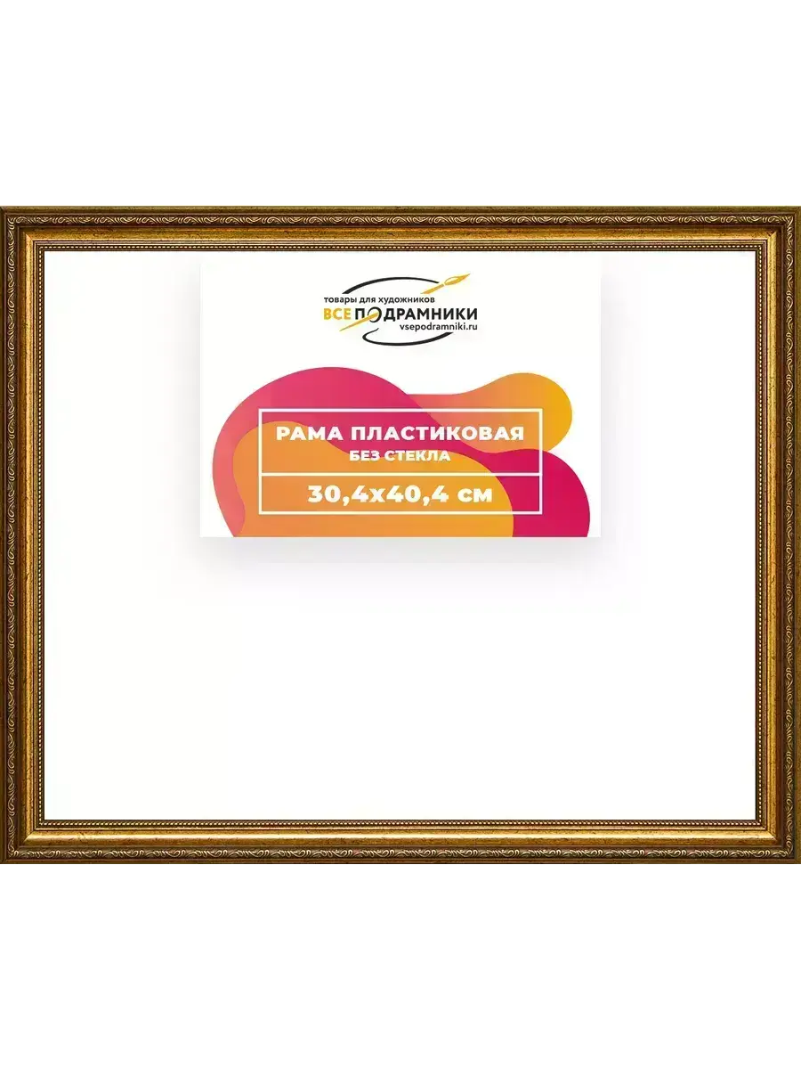 Пластиковая рама 30x40 без стекла и задника Пластиковая рама без стекла и задника изготовлена из безопасного и экологически чистого первичного полистирола высшей категории. Производитель: “ВсеПодрамники”. Для удобства установки к стандартному размеру добавлено 4 мм (по 2 мм с каждой стороны), чтобы ваше изделие легко поместилось в раму. 1. Основные характеристики: - Размеры рамки: 30x40 (по размеру помещаемого изображения) - Габариты изделия: 35.6x45.6 см. - Цвет: золотистый - Профиль: классический - Сечение рамы: 33x24 мм - Ширина четверти: 7 мм - Высота четверти: 10 мм 2. Комплектация: - Подвесная пластина – 2 шт. - Прижимы для подрамника - Винты 3. Назначение: - Подходит для оформления: • Картин, включая картины по номерам • Алмазных мозаик и вышивок крестом • Постеров, фотографий, икон • Паспарту, зеркал • Вышивки бисером и алмазной мозаики • Медалей, орденов, спортивных наград • Старинных часов, ключей, монет или украшений - Используется как настенная или настольная фоторамка (нет подставки) 4. Преимущества: - Универсальность: квадратные и прямоугольные форматы, размеры от 10х10 до 100х100 см - Удобство: можно повесить горизонтально или вертикально - Широкий выбор: разные профили, расцветки, с опцией со стеклом или без - Идеальный подарок: для мамы, папы, бабушки, дедушки, друзей, коллег на день рождения, Новый год, 8 марта, 23 февраля, свадьбу, новоселье или любой другой праздник 5. Применение в интерьере: - Идеально для алмазной вышивки, мозаики, картин на подрамнике - Украшение дома: подходит для изображений цветов, живописи, портретов, натюрмортов, городских пейзажей, природы 6. Производство: - Страна: Россия, Санкт-Петербург - Качество: высококачественные материалы с вниманием к деталям