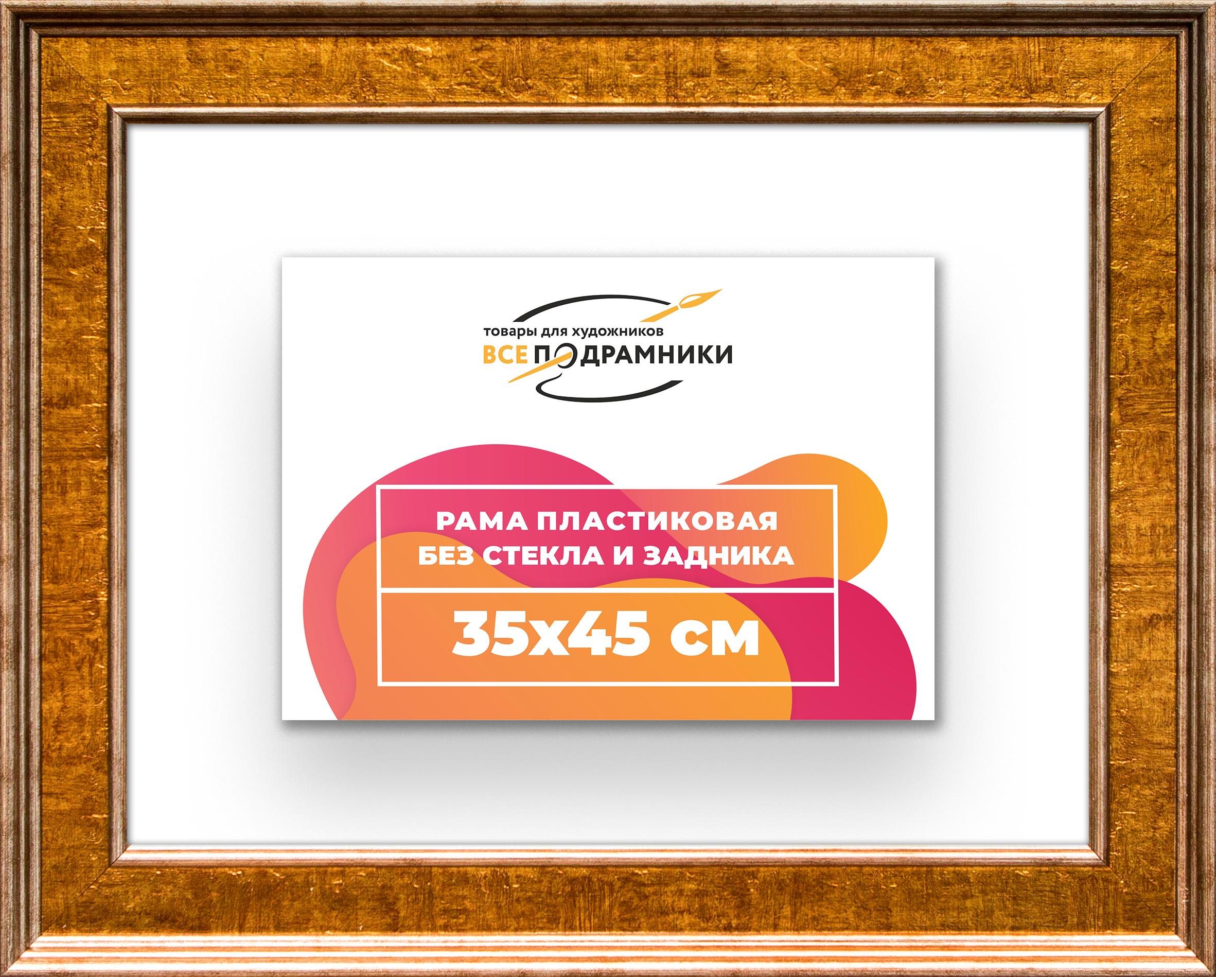 Пластиковая рама 35x45 без стекла и задника Пластиковая рама без стекла и задника изготовлена из безопасного и экологически чистого первичного полистирола высшей категории. Производитель: “ВсеПодрамники”. Для удобства установки к стандартному размеру добавлено 4 мм (по 2 мм с каждой стороны), чтобы ваше изделие легко поместилось в раму. 1. Основные характеристики: - Размеры рамки: 35x45 (по размеру помещаемого изображения) - Габариты изделия: 44.0x54.0 см. - Цвет: золотистый - Профиль: классический - Сечение рамы: 50x30 мм - Ширина четверти: 7 мм - Высота четверти: 10 мм 2. Комплектация: - Подвесная пластина – 2 шт. - Прижимы для подрамника - Винты 3. Назначение: - Подходит для оформления: • Картин, включая картины по номерам • Алмазных мозаик и вышивок крестом • Постеров, фотографий, икон • Паспарту, зеркал • Вышивки бисером и алмазной мозаики • Медалей, орденов, спортивных наград • Старинных часов, ключей, монет или украшений - Используется как настенная или настольная фоторамка (нет подставки) 4. Преимущества: - Универсальность: квадратные и прямоугольные форматы, размеры от 10х10 до 100х100 см - Удобство: можно повесить горизонтально или вертикально - Широкий выбор: разные профили, расцветки, с опцией со стеклом или без - Идеальный подарок: для мамы, папы, бабушки, дедушки, друзей, коллег на день рождения, Новый год, 8 марта, 23 февраля, свадьбу, новоселье или любой другой праздник 5. Применение в интерьере: - Идеально для алмазной вышивки, мозаики, картин на подрамнике - Украшение дома: подходит для изображений цветов, живописи, портретов, натюрмортов, городских пейзажей, природы 6. Производство: - Страна: Россия, Санкт-Петербург - Качество: высококачественные материалы с вниманием к деталям