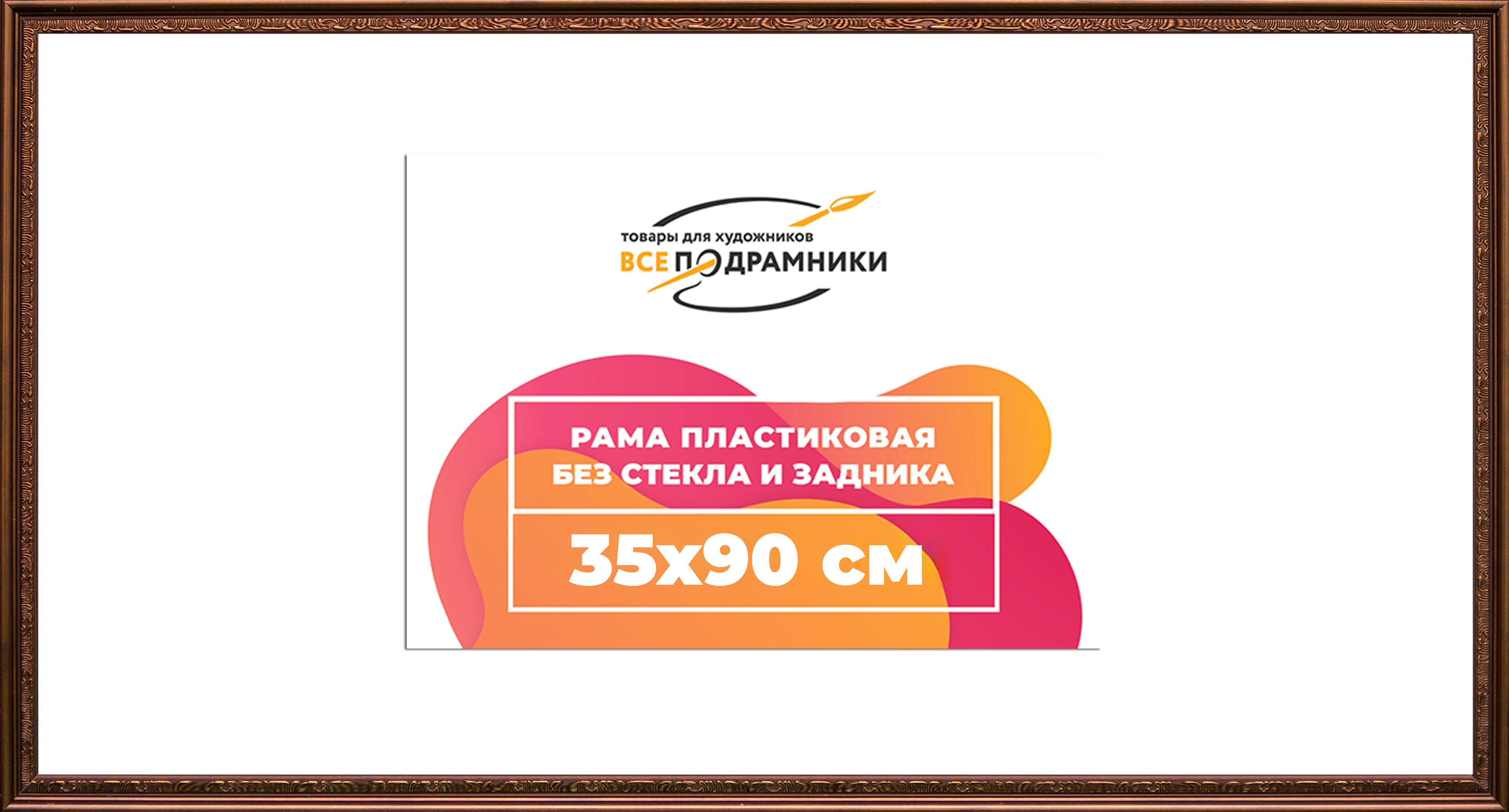 Пластиковая рама 35x90 без стекла и задника Пластиковая рама без стекла и задника изготовлена из безопасного и экологически чистого первичного полистирола высшей категории. Производитель: “ВсеПодрамники”. Для удобства установки к стандартному размеру добавлено 4 мм (по 2 мм с каждой стороны), чтобы ваше изделие легко поместилось в раму. 1. Основные характеристики: - Размеры рамки: 35x90 (по размеру помещаемого изображения) - Габариты изделия: 38.0x93.0 см. - Цвет: коричневый - Профиль: классический - Сечение рамы: 18x17 мм - Ширина четверти: 5 мм - Высота четверти: 7 мм 2. Комплектация: - Подвесная пластина – 2 шт. - Прижимы для подрамника - Винты 3. Назначение: - Подходит для оформления: • Картин, включая картины по номерам • Алмазных мозаик и вышивок крестом • Постеров, фотографий, икон • Паспарту, зеркал • Вышивки бисером и алмазной мозаики • Медалей, орденов, спортивных наград • Старинных часов, ключей, монет или украшений - Используется как настенная или настольная фоторамка (нет подставки) 4. Преимущества: - Универсальность: квадратные и прямоугольные форматы, размеры от 10х10 до 100х100 см - Удобство: можно повесить горизонтально или вертикально - Широкий выбор: разные профили, расцветки, с опцией со стеклом или без - Идеальный подарок: для мамы, папы, бабушки, дедушки, друзей, коллег на день рождения, Новый год, 8 марта, 23 февраля, свадьбу, новоселье или любой другой праздник 5. Применение в интерьере: - Идеально для алмазной вышивки, мозаики, картин на подрамнике - Украшение дома: подходит для изображений цветов, живописи, портретов, натюрмортов, городских пейзажей, природы 6. Производство: - Страна: Россия, Санкт-Петербург - Качество: высококачественные материалы с вниманием к деталям