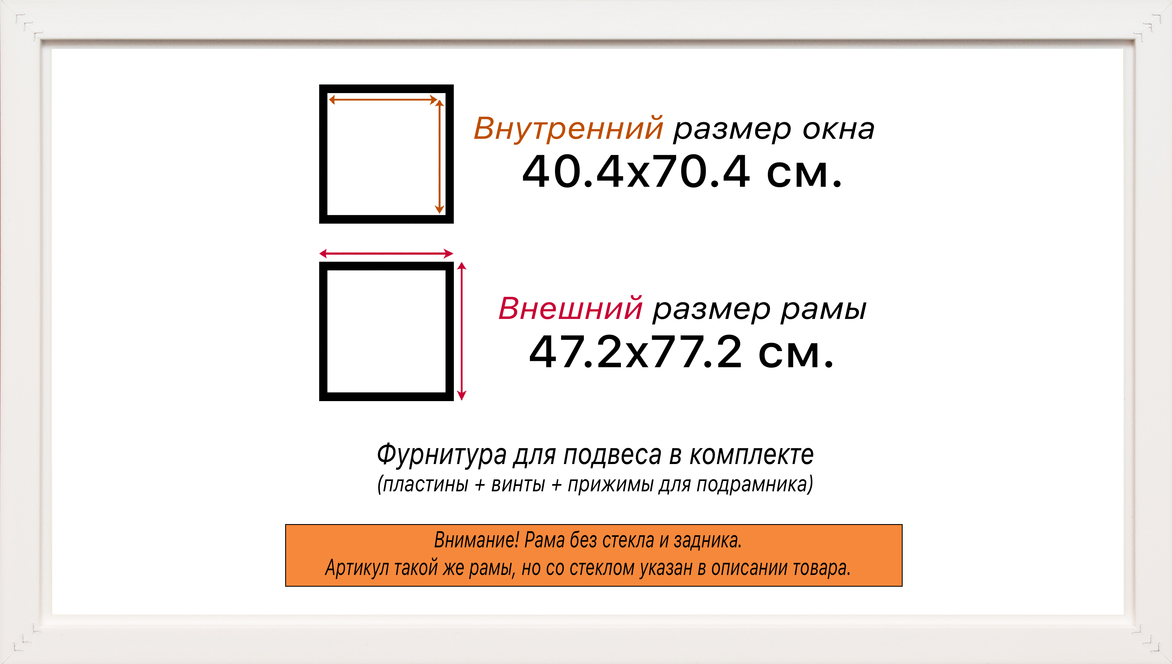 Пластиковая рама 40x70 без стекла и задника Пластиковая рама без стекла и задника изготовлена из безопасного и экологически чистого первичного полистирола высшей категории. Производитель: “ВсеПодрамники”. Для удобства установки к стандартному размеру добавлено 4 мм (по 2 мм с каждой стороны), чтобы ваше изделие легко поместилось в раму. 1. Основные характеристики: - Размеры рамки: 40x70 (по размеру помещаемого изображения) - Габариты изделия: 47.2x77.2 см. - Цвет: супер белый - Профиль: классический - Сечение рамы: 41x15 мм - Ширина четверти: 7 мм - Высота четверти: 10 мм 2. Комплектация: - Подвесная пластина – 2 шт. - Прижимы для подрамника - Винты 3. Назначение: - Подходит для оформления: • Картин, включая картины по номерам • Алмазных мозаик и вышивок крестом • Постеров, фотографий, икон • Паспарту, зеркал • Вышивки бисером и алмазной мозаики • Медалей, орденов, спортивных наград • Старинных часов, ключей, монет или украшений - Используется как настенная или настольная фоторамка (нет подставки) 4. Преимущества: - Универсальность: квадратные и прямоугольные форматы, размеры от 10х10 до 100х100 см - Удобство: можно повесить горизонтально или вертикально - Широкий выбор: разные профили, расцветки, с опцией со стеклом или без - Идеальный подарок: для мамы, папы, бабушки, дедушки, друзей, коллег на день рождения, Новый год, 8 марта, 23 февраля, свадьбу, новоселье или любой другой праздник 5. Применение в интерьере: - Идеально для алмазной вышивки, мозаики, картин на подрамнике - Украшение дома: подходит для изображений цветов, живописи, портретов, натюрмортов, городских пейзажей, природы 6. Производство: - Страна: Россия, Санкт-Петербург - Качество: высококачественные материалы с вниманием к деталям
