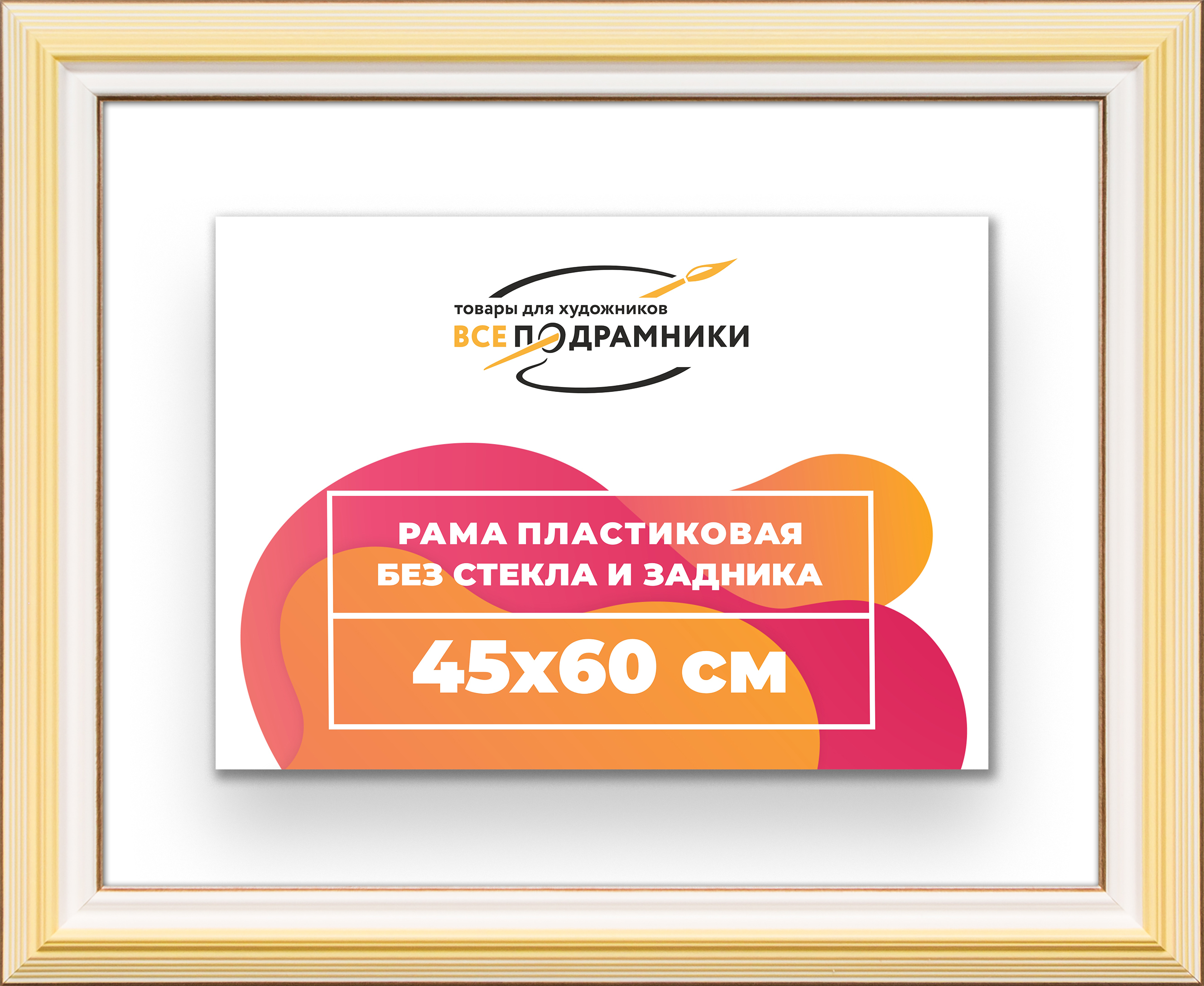 Пластиковая рама 45x60 без стекла и задника Пластиковая рама без стекла и задника изготовлена из безопасного и экологически чистого первичного полистирола высшей категории. Производитель: “ВсеПодрамники”. Для удобства установки к стандартному размеру добавлено 4 мм (по 2 мм с каждой стороны), чтобы ваше изделие легко поместилось в раму. 1. Основные характеристики: - Размеры рамки: 45x60 (по размеру помещаемого изображения) - Габариты изделия: 51.8x66.8 см. - Цвет: желтый - Профиль: классический - Сечение рамы: 39x22 мм - Ширина четверти: 7 мм - Высота четверти: 10 мм 2. Комплектация: - Подвесная пластина – 2 шт. - Прижимы для подрамника - Винты 3. Назначение: - Подходит для оформления: • Картин, включая картины по номерам • Алмазных мозаик и вышивок крестом • Постеров, фотографий, икон • Паспарту, зеркал • Вышивки бисером и алмазной мозаики • Медалей, орденов, спортивных наград • Старинных часов, ключей, монет или украшений - Используется как настенная или настольная фоторамка (нет подставки) 4. Преимущества: - Универсальность: квадратные и прямоугольные форматы, размеры от 10х10 до 100х100 см - Удобство: можно повесить горизонтально или вертикально - Широкий выбор: разные профили, расцветки, с опцией со стеклом или без - Идеальный подарок: для мамы, папы, бабушки, дедушки, друзей, коллег на день рождения, Новый год, 8 марта, 23 февраля, свадьбу, новоселье или любой другой праздник 5. Применение в интерьере: - Идеально для алмазной вышивки, мозаики, картин на подрамнике - Украшение дома: подходит для изображений цветов, живописи, портретов, натюрмортов, городских пейзажей, природы 6. Производство: - Страна: Россия, Санкт-Петербург - Качество: высококачественные материалы с вниманием к деталям