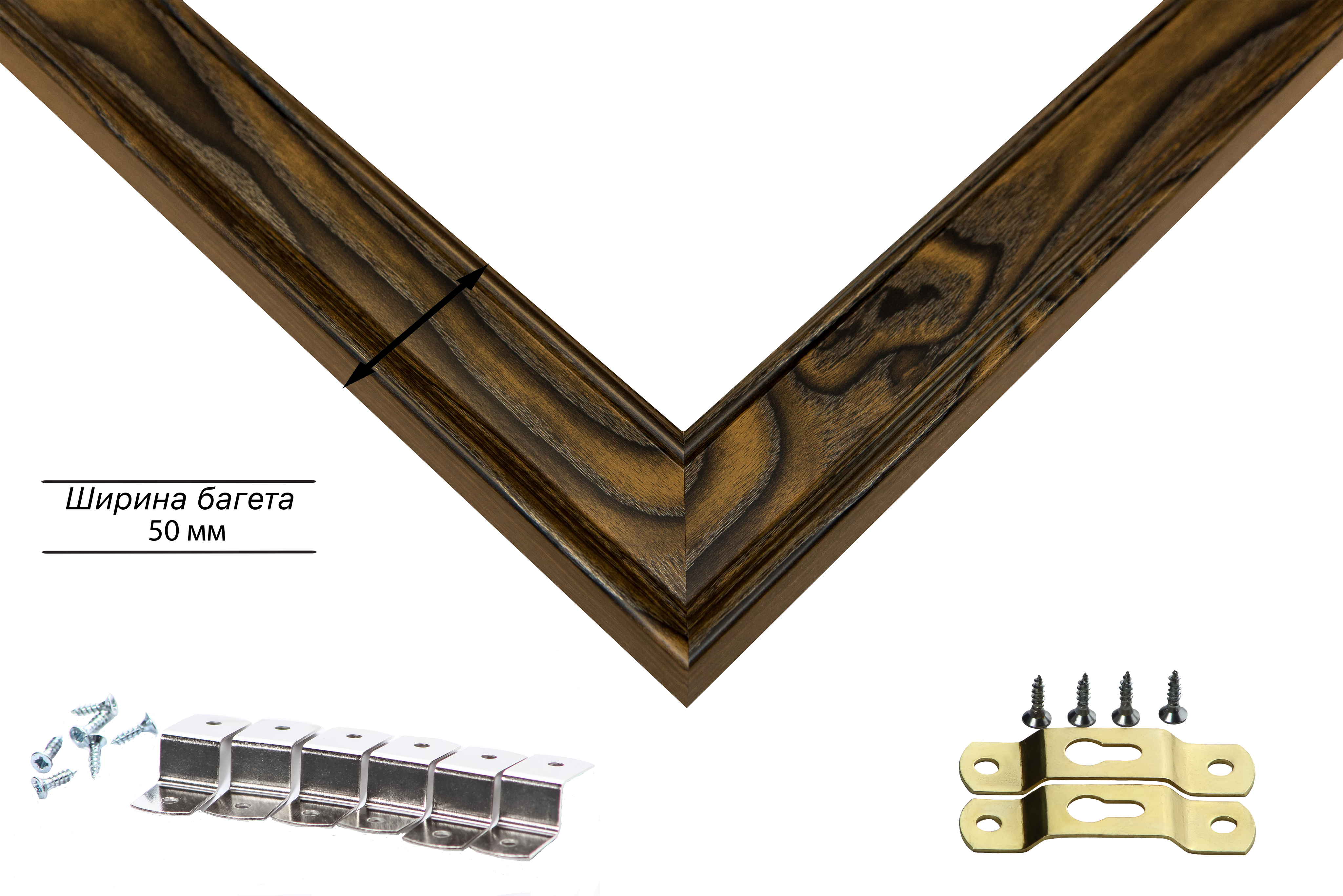 Пластиковая рама 45x80 без стекла и задника Пластиковая рама без стекла и задника изготовлена из безопасного и экологически чистого первичного полистирола высшей категории. Производитель: “ВсеПодрамники”. Для удобства установки к стандартному размеру добавлено 4 мм (по 2 мм с каждой стороны), чтобы ваше изделие легко поместилось в раму. 1. Основные характеристики: - Размеры рамки: 45x80 (по размеру помещаемого изображения) - Габариты изделия: 54.0x89.0 см. - Цвет: коричневый - Профиль: классический - Сечение рамы: 50x30 мм - Ширина четверти: 7 мм - Высота четверти: 10 мм 2. Комплектация: - Подвесная пластина – 2 шт. - Прижимы для подрамника - Винты 3. Назначение: - Подходит для оформления: • Картин, включая картины по номерам • Алмазных мозаик и вышивок крестом • Постеров, фотографий, икон • Паспарту, зеркал • Вышивки бисером и алмазной мозаики • Медалей, орденов, спортивных наград • Старинных часов, ключей, монет или украшений - Используется как настенная или настольная фоторамка (нет подставки) 4. Преимущества: - Универсальность: квадратные и прямоугольные форматы, размеры от 10х10 до 100х100 см - Удобство: можно повесить горизонтально или вертикально - Широкий выбор: разные профили, расцветки, с опцией со стеклом или без - Идеальный подарок: для мамы, папы, бабушки, дедушки, друзей, коллег на день рождения, Новый год, 8 марта, 23 февраля, свадьбу, новоселье или любой другой праздник 5. Применение в интерьере: - Идеально для алмазной вышивки, мозаики, картин на подрамнике - Украшение дома: подходит для изображений цветов, живописи, портретов, натюрмортов, городских пейзажей, природы 6. Производство: - Страна: Россия, Санкт-Петербург - Качество: высококачественные материалы с вниманием к деталям