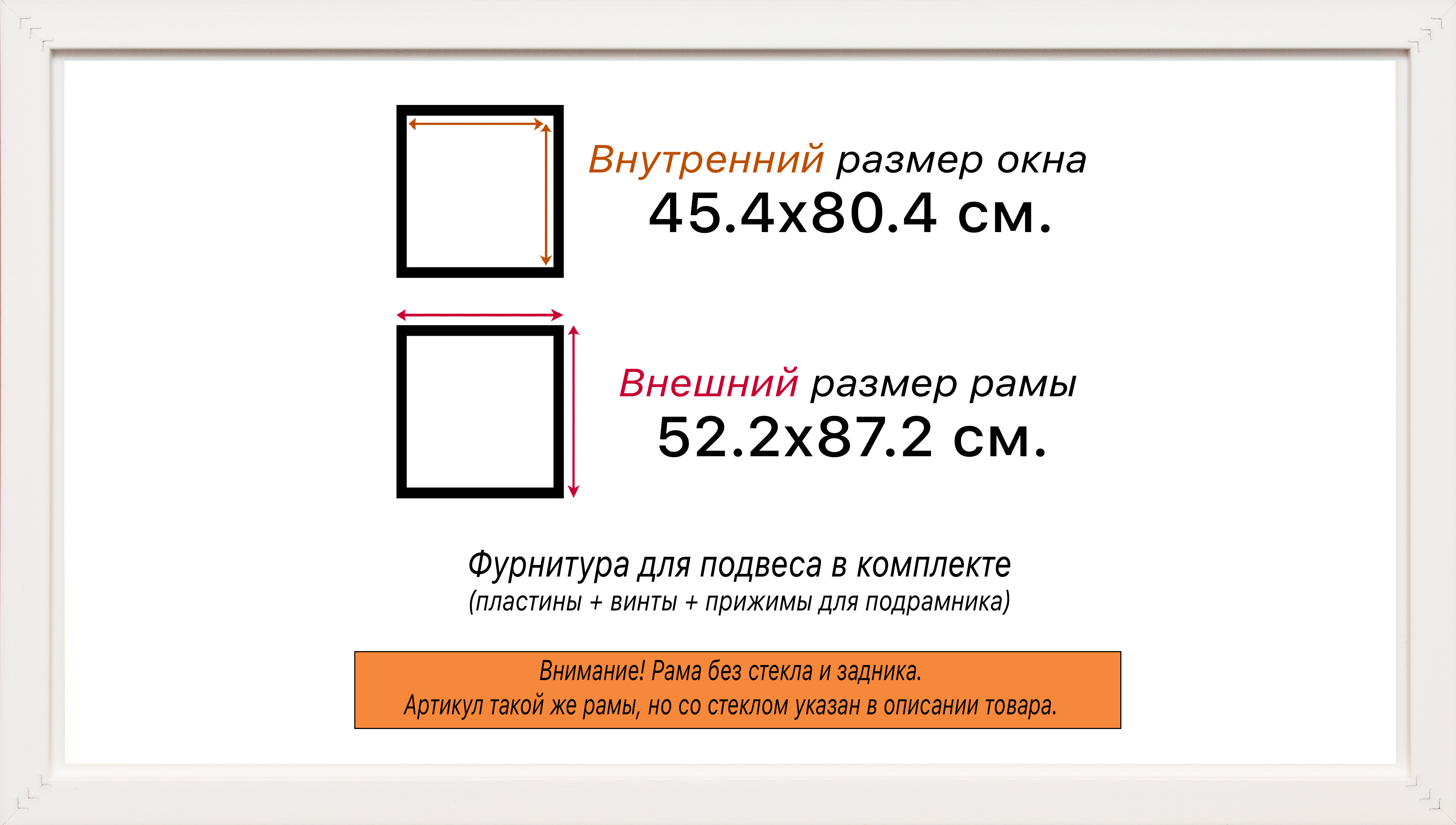 Пластиковая рама 45x80 без стекла и задника Пластиковая рама без стекла и задника изготовлена из безопасного и экологически чистого первичного полистирола высшей категории. Производитель: “ВсеПодрамники”. Для удобства установки к стандартному размеру добавлено 4 мм (по 2 мм с каждой стороны), чтобы ваше изделие легко поместилось в раму. 1. Основные характеристики: - Размеры рамки: 45x80 (по размеру помещаемого изображения) - Габариты изделия: 52.2x87.2 см. - Цвет: супер белый - Профиль: классический - Сечение рамы: 41x15 мм - Ширина четверти: 7 мм - Высота четверти: 10 мм 2. Комплектация: - Подвесная пластина – 2 шт. - Прижимы для подрамника - Винты 3. Назначение: - Подходит для оформления: • Картин, включая картины по номерам • Алмазных мозаик и вышивок крестом • Постеров, фотографий, икон • Паспарту, зеркал • Вышивки бисером и алмазной мозаики • Медалей, орденов, спортивных наград • Старинных часов, ключей, монет или украшений - Используется как настенная или настольная фоторамка (нет подставки) 4. Преимущества: - Универсальность: квадратные и прямоугольные форматы, размеры от 10х10 до 100х100 см - Удобство: можно повесить горизонтально или вертикально - Широкий выбор: разные профили, расцветки, с опцией со стеклом или без - Идеальный подарок: для мамы, папы, бабушки, дедушки, друзей, коллег на день рождения, Новый год, 8 марта, 23 февраля, свадьбу, новоселье или любой другой праздник 5. Применение в интерьере: - Идеально для алмазной вышивки, мозаики, картин на подрамнике - Украшение дома: подходит для изображений цветов, живописи, портретов, натюрмортов, городских пейзажей, природы 6. Производство: - Страна: Россия, Санкт-Петербург - Качество: высококачественные материалы с вниманием к деталям