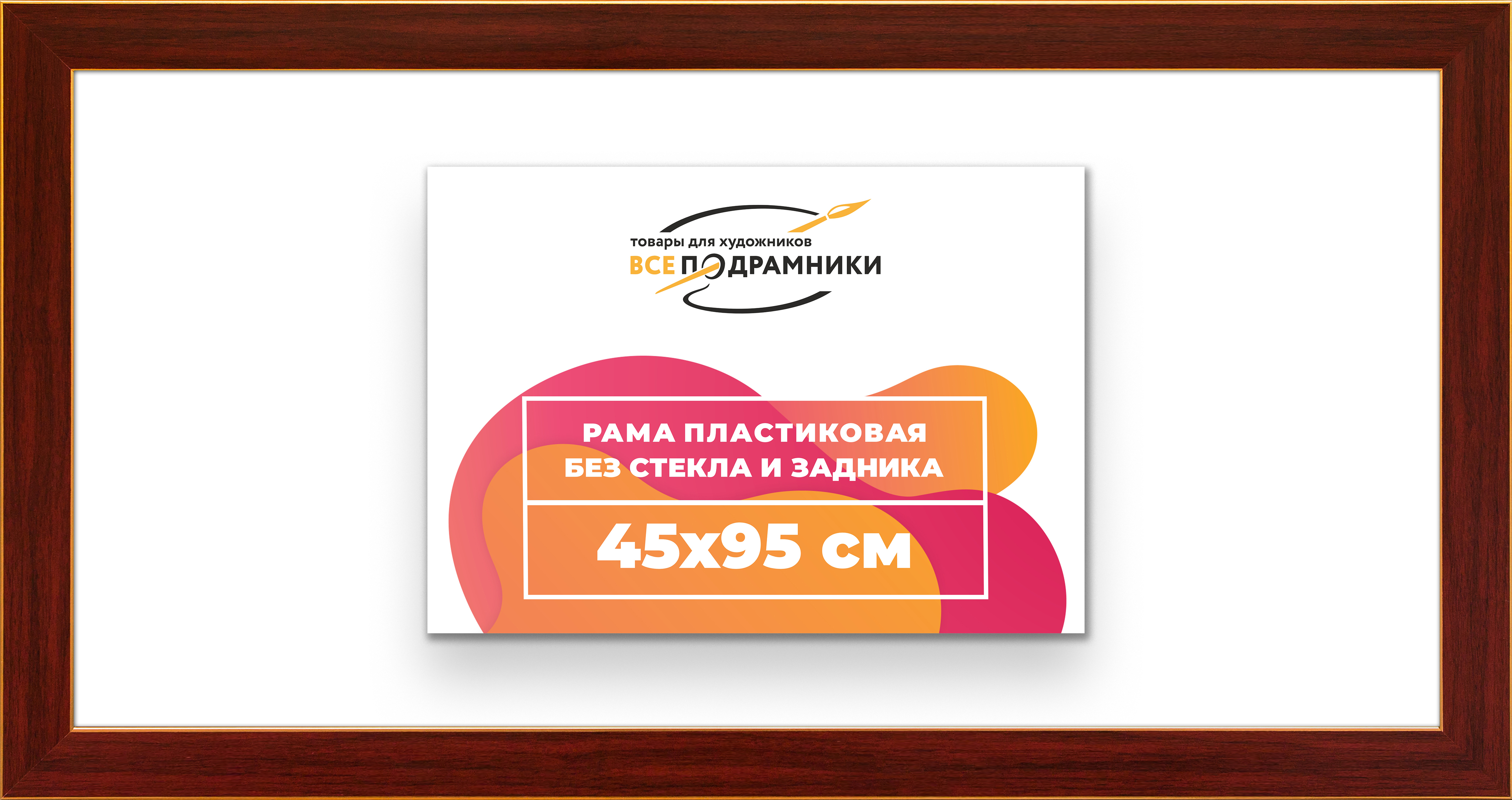 Пластиковая рама 45x95 без стекла и задника Пластиковая рама без стекла и задника изготовлена из безопасного и экологически чистого первичного полистирола высшей категории. Производитель: “ВсеПодрамники”. Для удобства установки к стандартному размеру добавлено 4 мм (по 2 мм с каждой стороны), чтобы ваше изделие легко поместилось в раму. 1. Основные характеристики: - Размеры рамки: 45x95 (по размеру помещаемого изображения) - Габариты изделия: 52.2x102.2 см. - Цвет: красное дерево - Профиль: классический - Сечение рамы: 41x15 мм - Ширина четверти: 7 мм - Высота четверти: 10 мм 2. Комплектация: - Подвесная пластина – 2 шт. - Прижимы для подрамника - Винты 3. Назначение: - Подходит для оформления: • Картин, включая картины по номерам • Алмазных мозаик и вышивок крестом • Постеров, фотографий, икон • Паспарту, зеркал • Вышивки бисером и алмазной мозаики • Медалей, орденов, спортивных наград • Старинных часов, ключей, монет или украшений - Используется как настенная или настольная фоторамка (нет подставки) 4. Преимущества: - Универсальность: квадратные и прямоугольные форматы, размеры от 10х10 до 100х100 см - Удобство: можно повесить горизонтально или вертикально - Широкий выбор: разные профили, расцветки, с опцией со стеклом или без - Идеальный подарок: для мамы, папы, бабушки, дедушки, друзей, коллег на день рождения, Новый год, 8 марта, 23 февраля, свадьбу, новоселье или любой другой праздник 5. Применение в интерьере: - Идеально для алмазной вышивки, мозаики, картин на подрамнике - Украшение дома: подходит для изображений цветов, живописи, портретов, натюрмортов, городских пейзажей, природы 6. Производство: - Страна: Россия, Санкт-Петербург - Качество: высококачественные материалы с вниманием к деталям