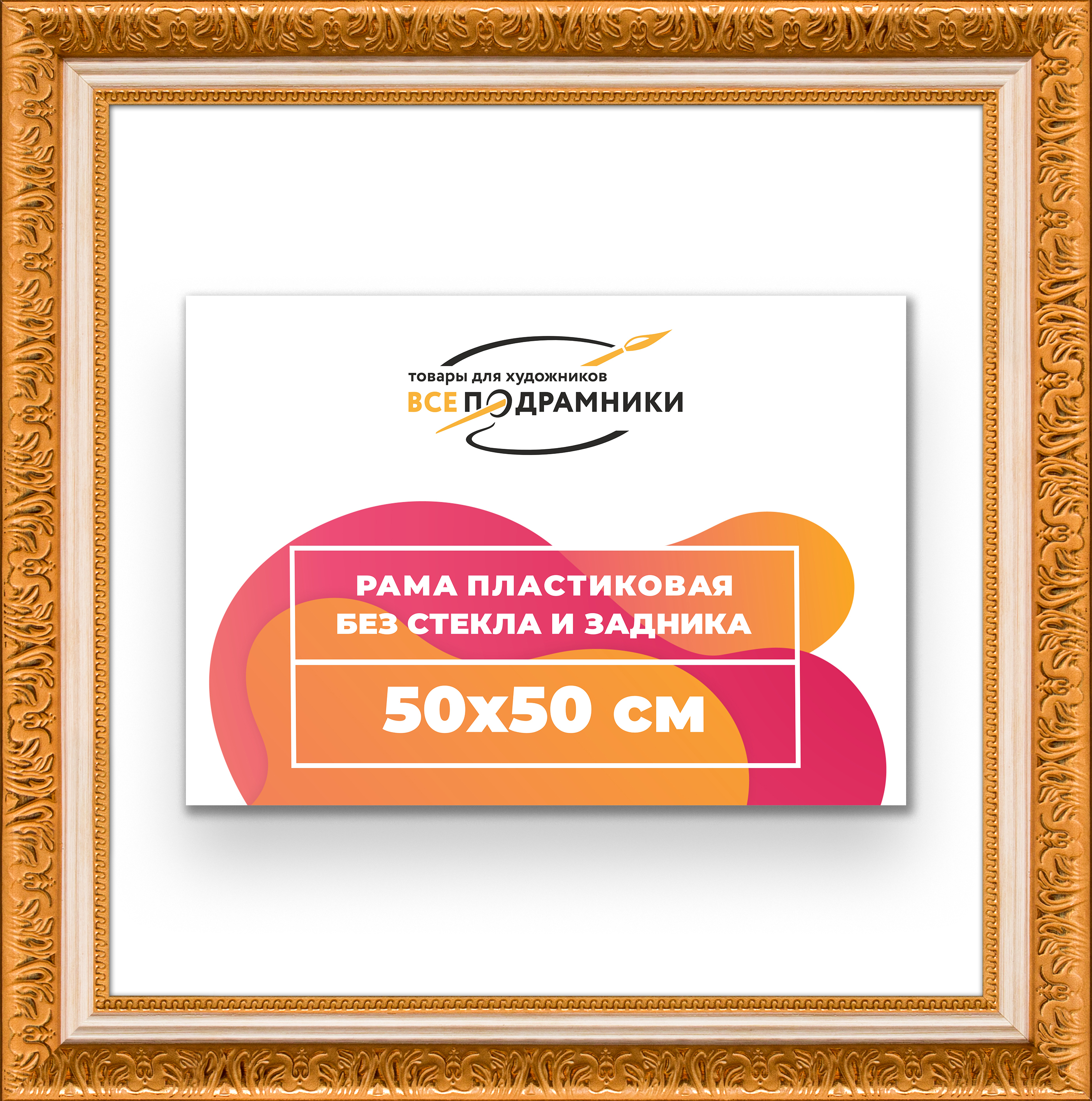 Пластиковая рама 50x50 без стекла и задника Пластиковая рама без стекла и задника изготовлена из безопасного и экологически чистого первичного полистирола высшей категории. Производитель: “ВсеПодрамники”. Для удобства установки к стандартному размеру добавлено 4 мм (по 2 мм с каждой стороны), чтобы ваше изделие легко поместилось в раму. 1. Основные характеристики: - Размеры рамки: 50x50 (по размеру помещаемого изображения) - Габариты изделия: 60.0x60.0 см. - Цвет: золотистый - Профиль: классический - Сечение рамы: 55x36 мм - Ширина четверти: 7 мм - Высота четверти: 10 мм 2. Комплектация: - Подвесная пластина – 2 шт. - Прижимы для подрамника - Винты 3. Назначение: - Подходит для оформления: • Картин, включая картины по номерам • Алмазных мозаик и вышивок крестом • Постеров, фотографий, икон • Паспарту, зеркал • Вышивки бисером и алмазной мозаики • Медалей, орденов, спортивных наград • Старинных часов, ключей, монет или украшений - Используется как настенная или настольная фоторамка (нет подставки) 4. Преимущества: - Универсальность: квадратные и прямоугольные форматы, размеры от 10х10 до 100х100 см - Удобство: можно повесить горизонтально или вертикально - Широкий выбор: разные профили, расцветки, с опцией со стеклом или без - Идеальный подарок: для мамы, папы, бабушки, дедушки, друзей, коллег на день рождения, Новый год, 8 марта, 23 февраля, свадьбу, новоселье или любой другой праздник 5. Применение в интерьере: - Идеально для алмазной вышивки, мозаики, картин на подрамнике - Украшение дома: подходит для изображений цветов, живописи, портретов, натюрмортов, городских пейзажей, природы 6. Производство: - Страна: Россия, Санкт-Петербург - Качество: высококачественные материалы с вниманием к деталям