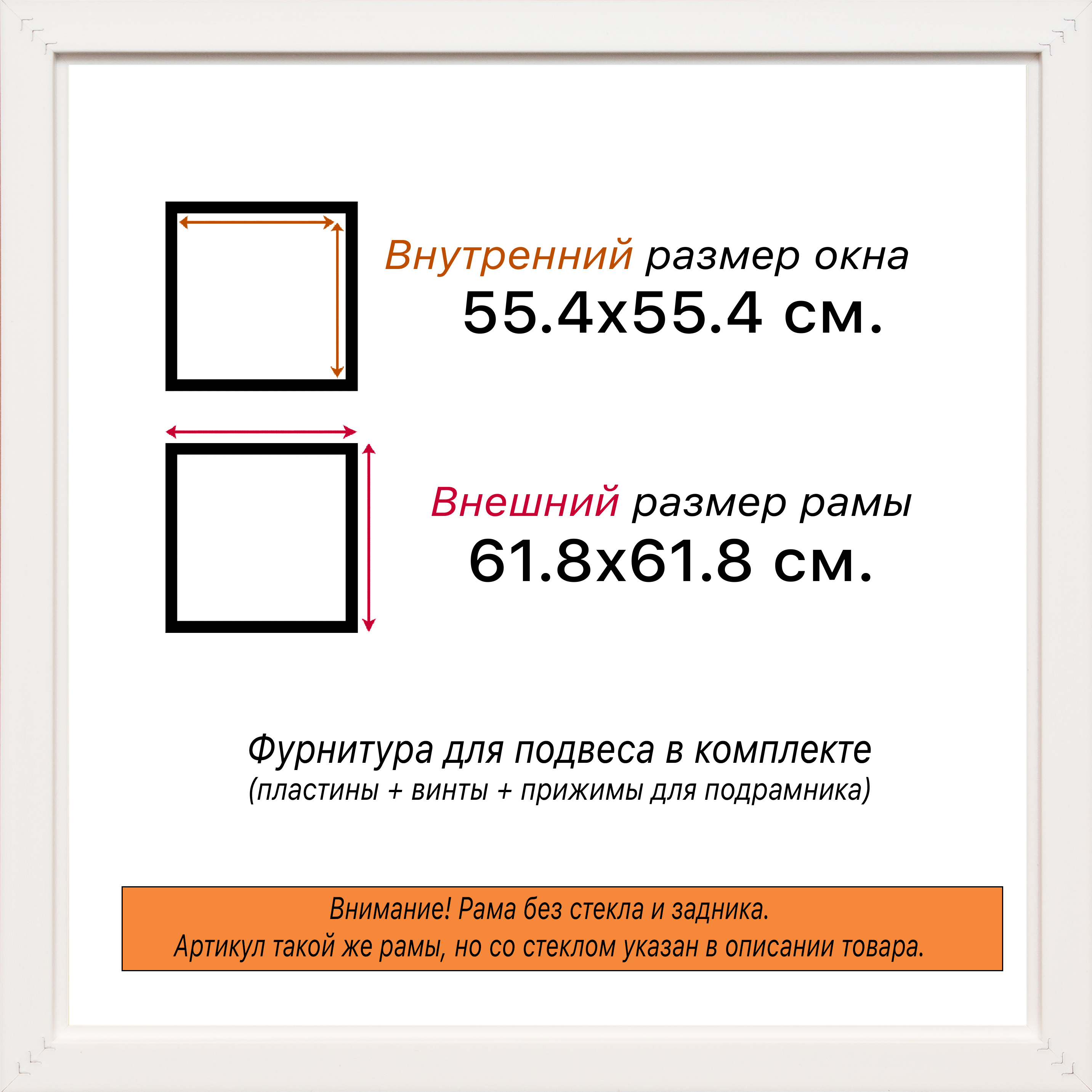 Пластиковая рама 55x55 без стекла и задника Пластиковая рама без стекла и задника изготовлена из безопасного и экологически чистого первичного полистирола высшей категории. Производитель: “ВсеПодрамники”. Для удобства установки к стандартному размеру добавлено 4 мм (по 2 мм с каждой стороны), чтобы ваше изделие легко поместилось в раму. 1. Основные характеристики: - Размеры рамки: 55x55 (по размеру помещаемого изображения) - Габариты изделия: 61.8x61.8 см. - Цвет: темно-золотой - Профиль: классический - Сечение рамы: 39x22 мм - Ширина четверти: 7 мм - Высота четверти: 10 мм 2. Комплектация: - Подвесная пластина – 2 шт. - Прижимы для подрамника - Винты 3. Назначение: - Подходит для оформления: • Картин, включая картины по номерам • Алмазных мозаик и вышивок крестом • Постеров, фотографий, икон • Паспарту, зеркал • Вышивки бисером и алмазной мозаики • Медалей, орденов, спортивных наград • Старинных часов, ключей, монет или украшений - Используется как настенная или настольная фоторамка (нет подставки) 4. Преимущества: - Универсальность: квадратные и прямоугольные форматы, размеры от 10х10 до 100х100 см - Удобство: можно повесить горизонтально или вертикально - Широкий выбор: разные профили, расцветки, с опцией со стеклом или без - Идеальный подарок: для мамы, папы, бабушки, дедушки, друзей, коллег на день рождения, Новый год, 8 марта, 23 февраля, свадьбу, новоселье или любой другой праздник 5. Применение в интерьере: - Идеально для алмазной вышивки, мозаики, картин на подрамнике - Украшение дома: подходит для изображений цветов, живописи, портретов, натюрмортов, городских пейзажей, природы 6. Производство: - Страна: Россия, Санкт-Петербург - Качество: высококачественные материалы с вниманием к деталям