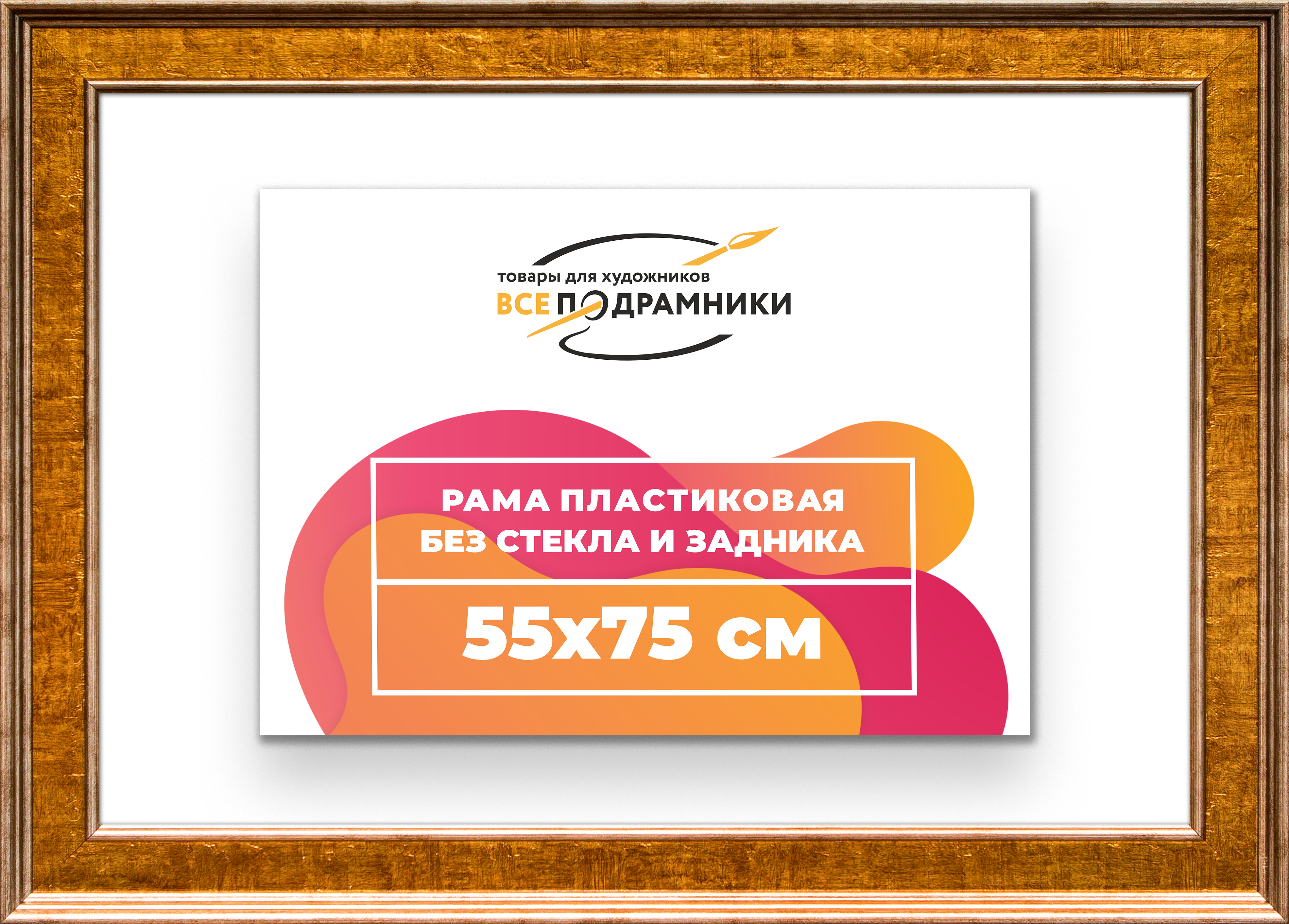 Пластиковая рама 55x75 без стекла и задника Пластиковая рама без стекла и задника изготовлена из безопасного и экологически чистого первичного полистирола высшей категории. Производитель: “ВсеПодрамники”. Для удобства установки к стандартному размеру добавлено 4 мм (по 2 мм с каждой стороны), чтобы ваше изделие легко поместилось в раму. 1. Основные характеристики: - Размеры рамки: 55x75 (по размеру помещаемого изображения) - Габариты изделия: 64.0x84.0 см. - Цвет: золотистый - Профиль: классический - Сечение рамы: 50x30 мм - Ширина четверти: 7 мм - Высота четверти: 10 мм 2. Комплектация: - Подвесная пластина – 2 шт. - Прижимы для подрамника - Винты 3. Назначение: - Подходит для оформления: • Картин, включая картины по номерам • Алмазных мозаик и вышивок крестом • Постеров, фотографий, икон • Паспарту, зеркал • Вышивки бисером и алмазной мозаики • Медалей, орденов, спортивных наград • Старинных часов, ключей, монет или украшений - Используется как настенная или настольная фоторамка (нет подставки) 4. Преимущества: - Универсальность: квадратные и прямоугольные форматы, размеры от 10х10 до 100х100 см - Удобство: можно повесить горизонтально или вертикально - Широкий выбор: разные профили, расцветки, с опцией со стеклом или без - Идеальный подарок: для мамы, папы, бабушки, дедушки, друзей, коллег на день рождения, Новый год, 8 марта, 23 февраля, свадьбу, новоселье или любой другой праздник 5. Применение в интерьере: - Идеально для алмазной вышивки, мозаики, картин на подрамнике - Украшение дома: подходит для изображений цветов, живописи, портретов, натюрмортов, городских пейзажей, природы 6. Производство: - Страна: Россия, Санкт-Петербург - Качество: высококачественные материалы с вниманием к деталям